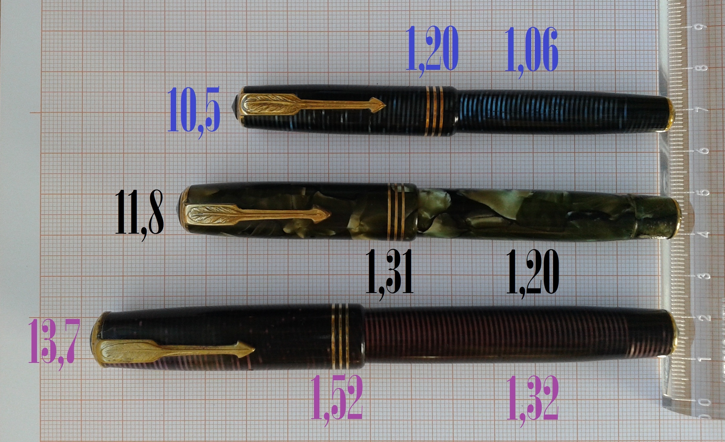 Secondo Letizia Jacopini nel suo fondamentale “La Storia della Stilografica in Italia 1900-1950” le misure sono quattro, mentre per il GM sono cinque: Senior, Special, Junior, Juniorette e Lady.