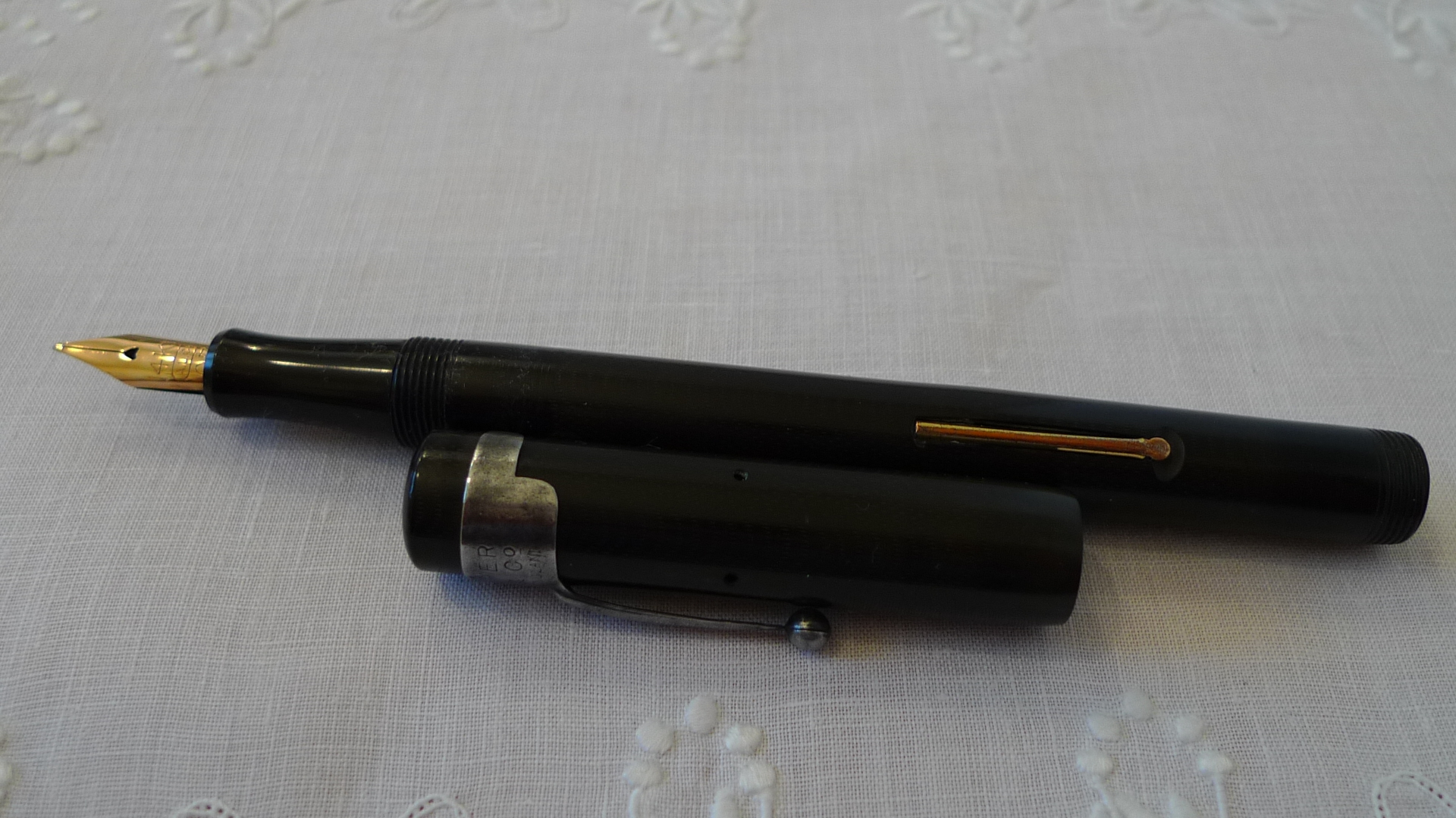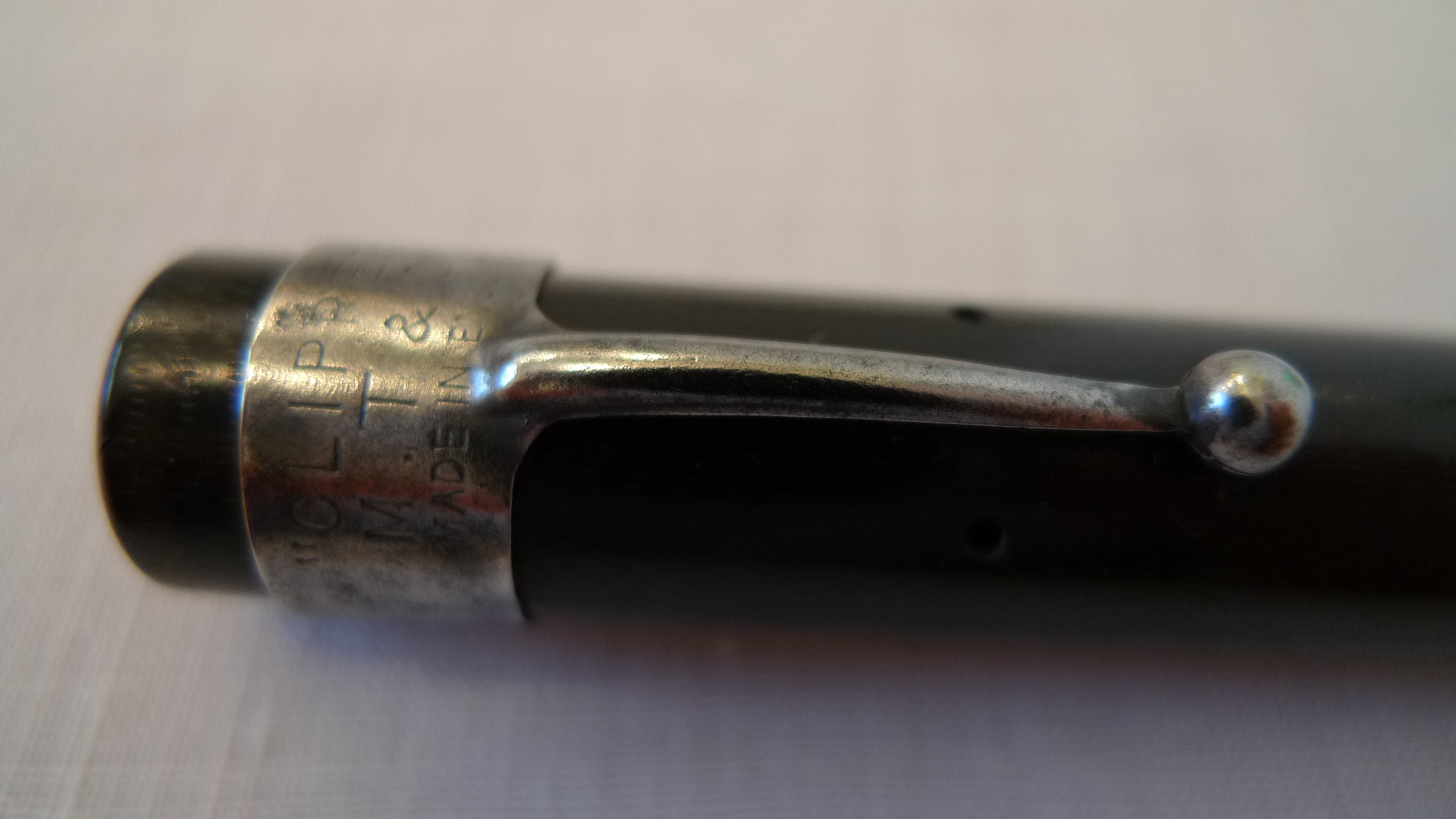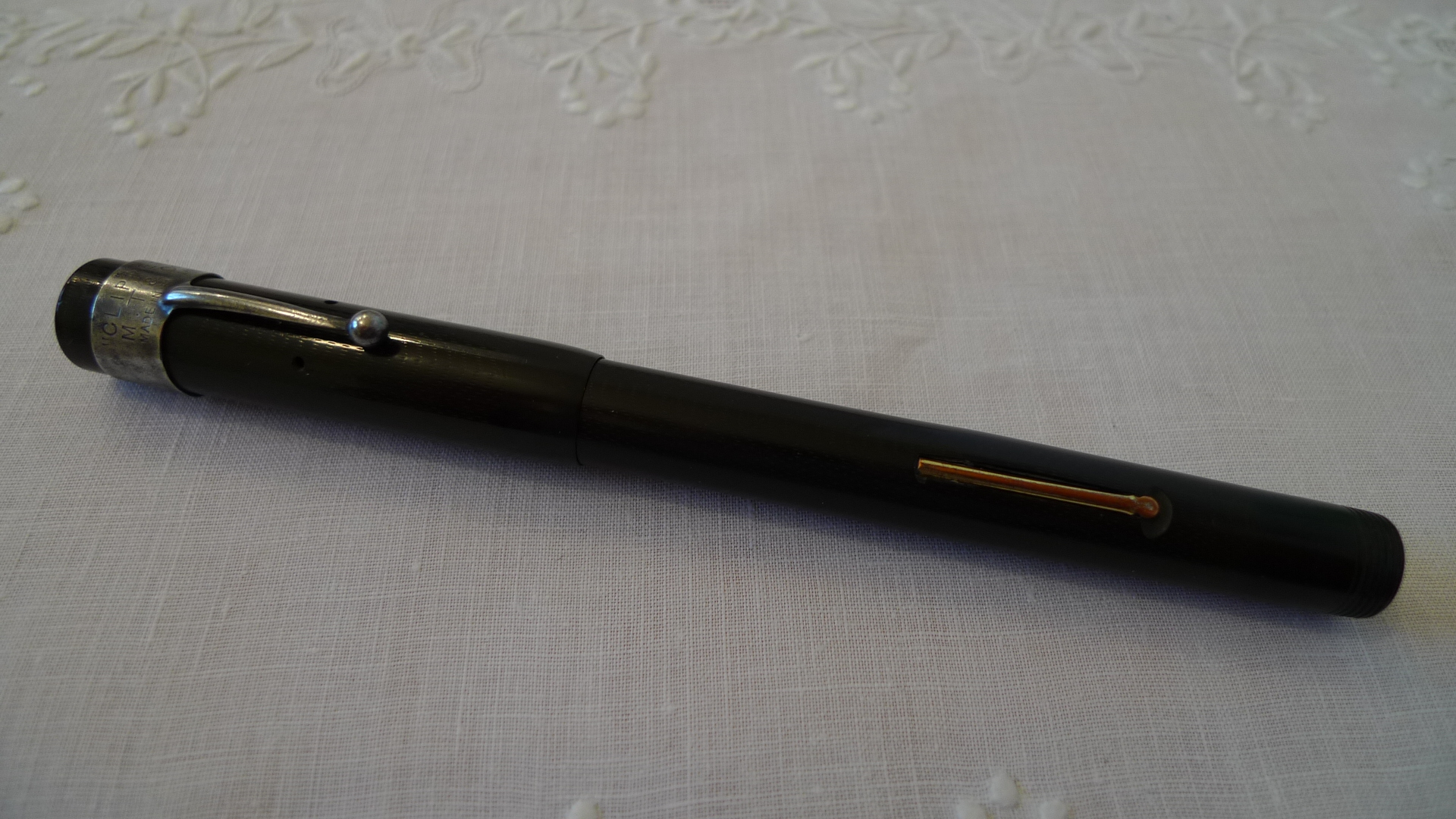 Mi sembra che la penna possa agevolmente datarsi fra il 1912 ed il 1935. E' con tutta probabilità in ebanite (ben conservata, dato il limitatissimo viraggio) e la clip è senza dubbio compatibile con gli anni 10 / 20, a mio modo di vedere.