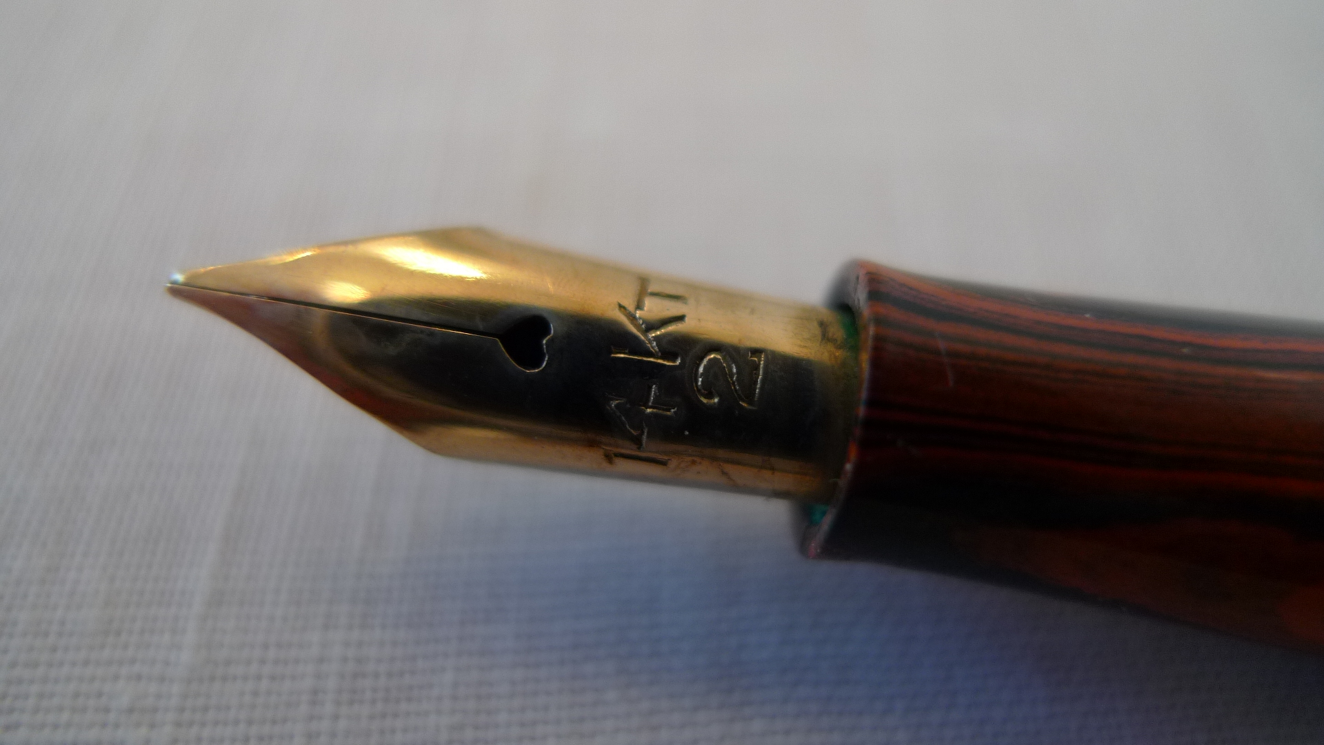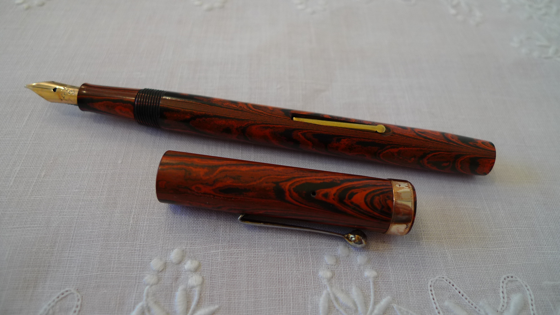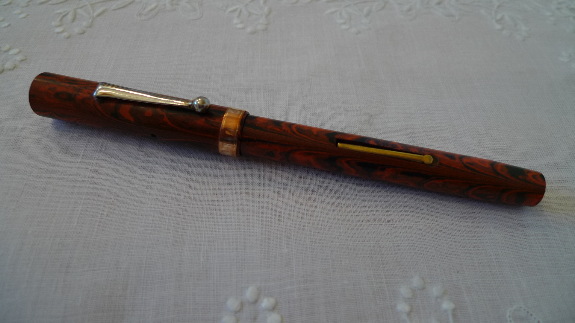 La finitura “red ripple” fu una delle più utilizzate quando si tentò di dare una colorazione alle penne in ebanite, che non consentiva certamente variazioni cromatiche come quelle permesse dalla celluloide, ma non è poi così semplice trovare un buon esemplare e questo lo è: congratulazioni.