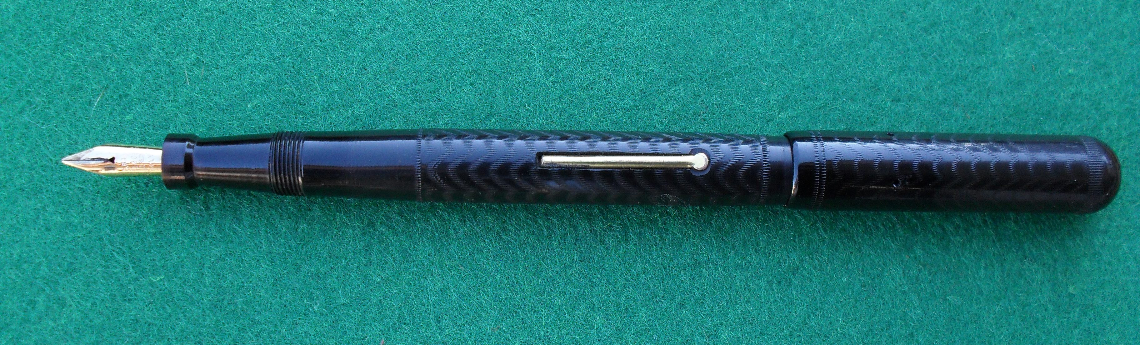 Dunque si tratta di una pubblicitaria - fatta cioè come pubblicità - d'epoca. Sarà stata prodotta tra il 1912 ed il 1925 secondo me, ti spiego perché: il limite inferiore lo pongo per il caricamento, il lever_filler venne introdotto e brevettato da Sheaffer nel 1912, successivamente poi molti riuscirono ad eludere il brevetto di Sheaffer e quindi la cosa si diffuse; l'altro limite è dato dal fatto che le produzioni successive al 1925 iniziano ad essere più in celluloide che in ebanite. Potrei anche sbagliarmi.