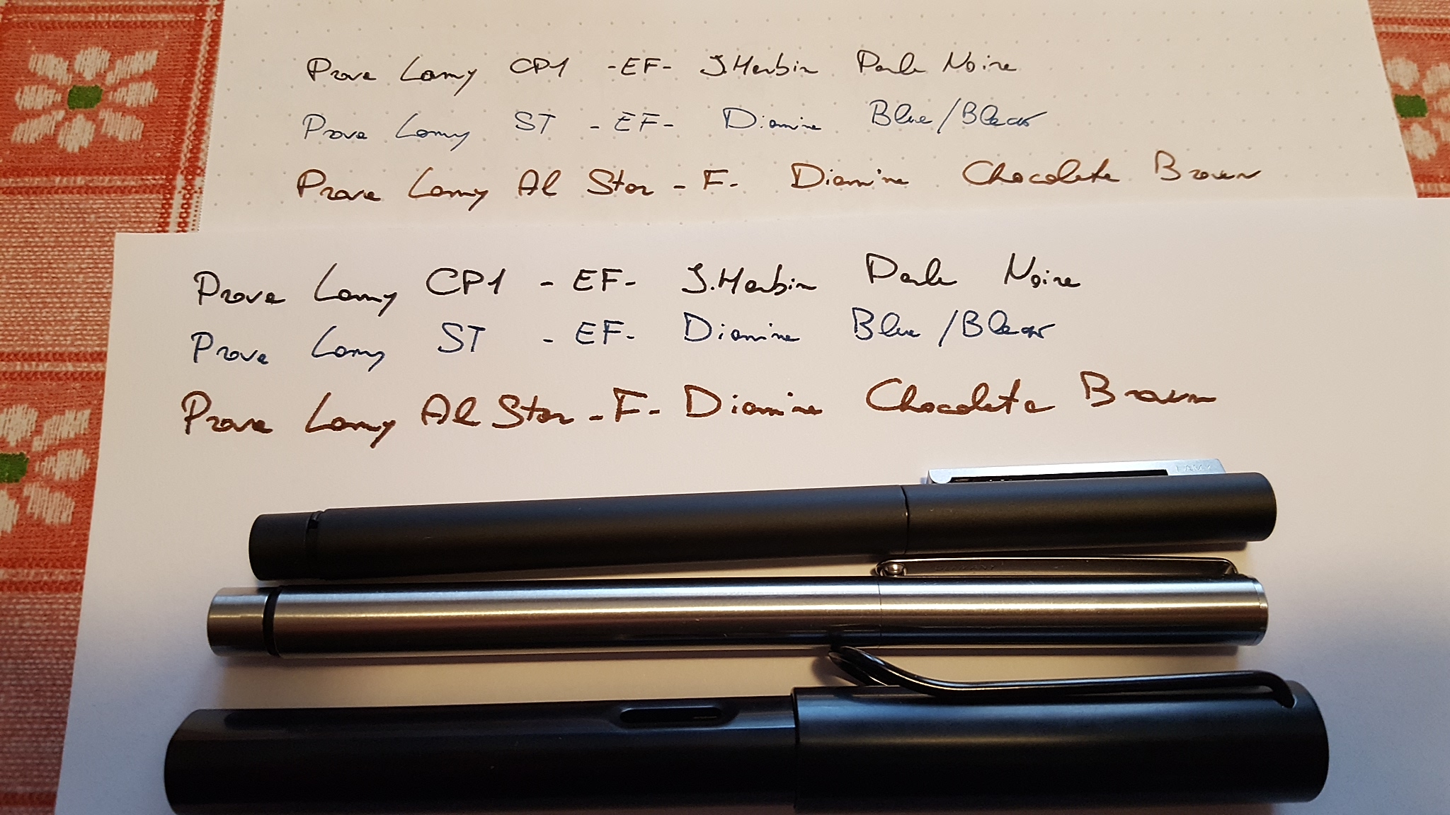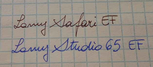 Qualche giorno dopo mi è arrivato anche il pennino EF nero che avevo ordinato prima di tutto ciò, dato che volevo comunque avere un'alternativa, lo monto nella speranza di trovarmi un pennino perfettamente aderente alle mie esigenze e...flusso abbondantissimo, nessuna indecisione di scrittura o falsa partenza ma mi sembra di scrivere con un idrante. Allego una foto della differenza tra i due tratti.