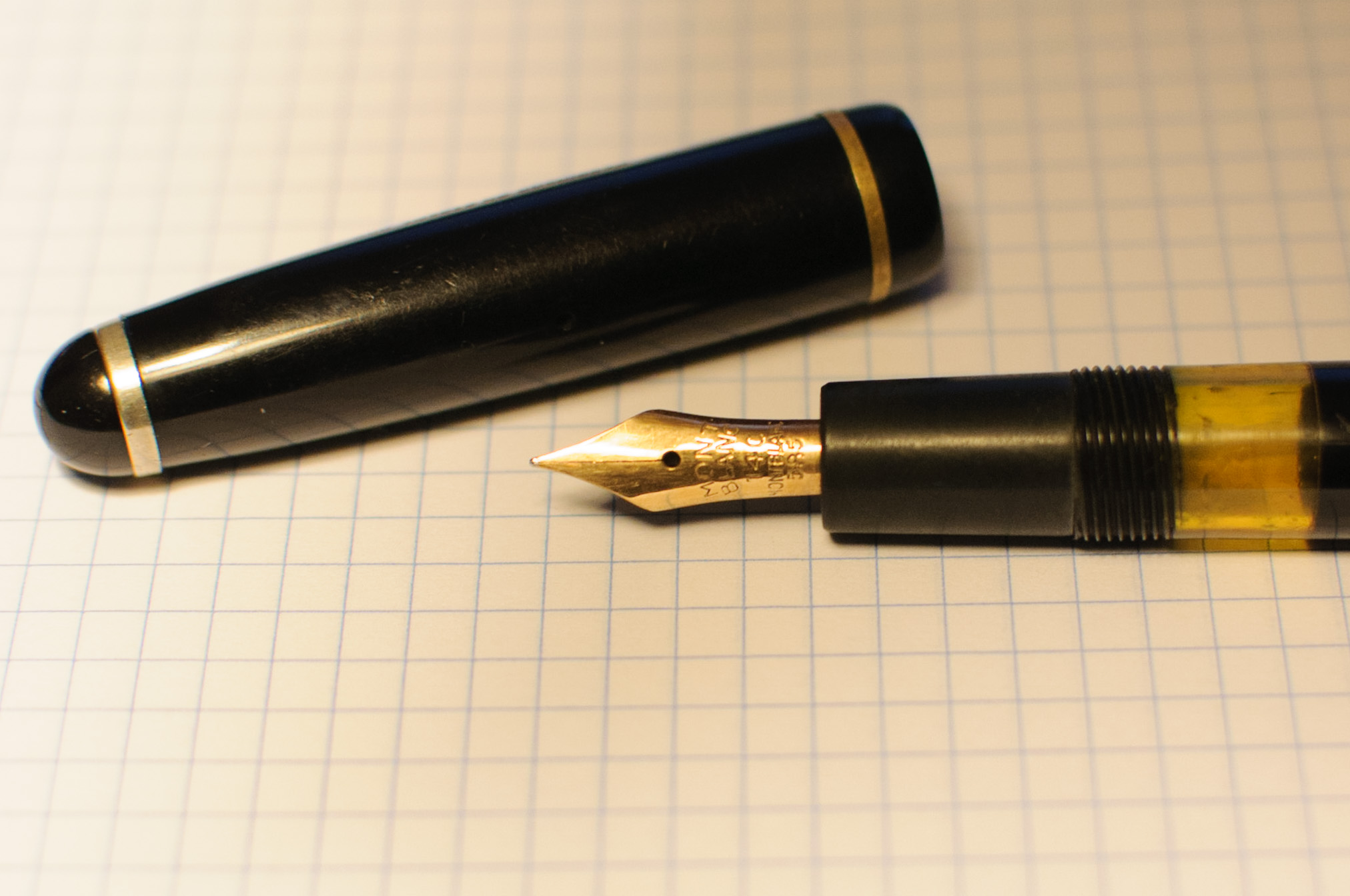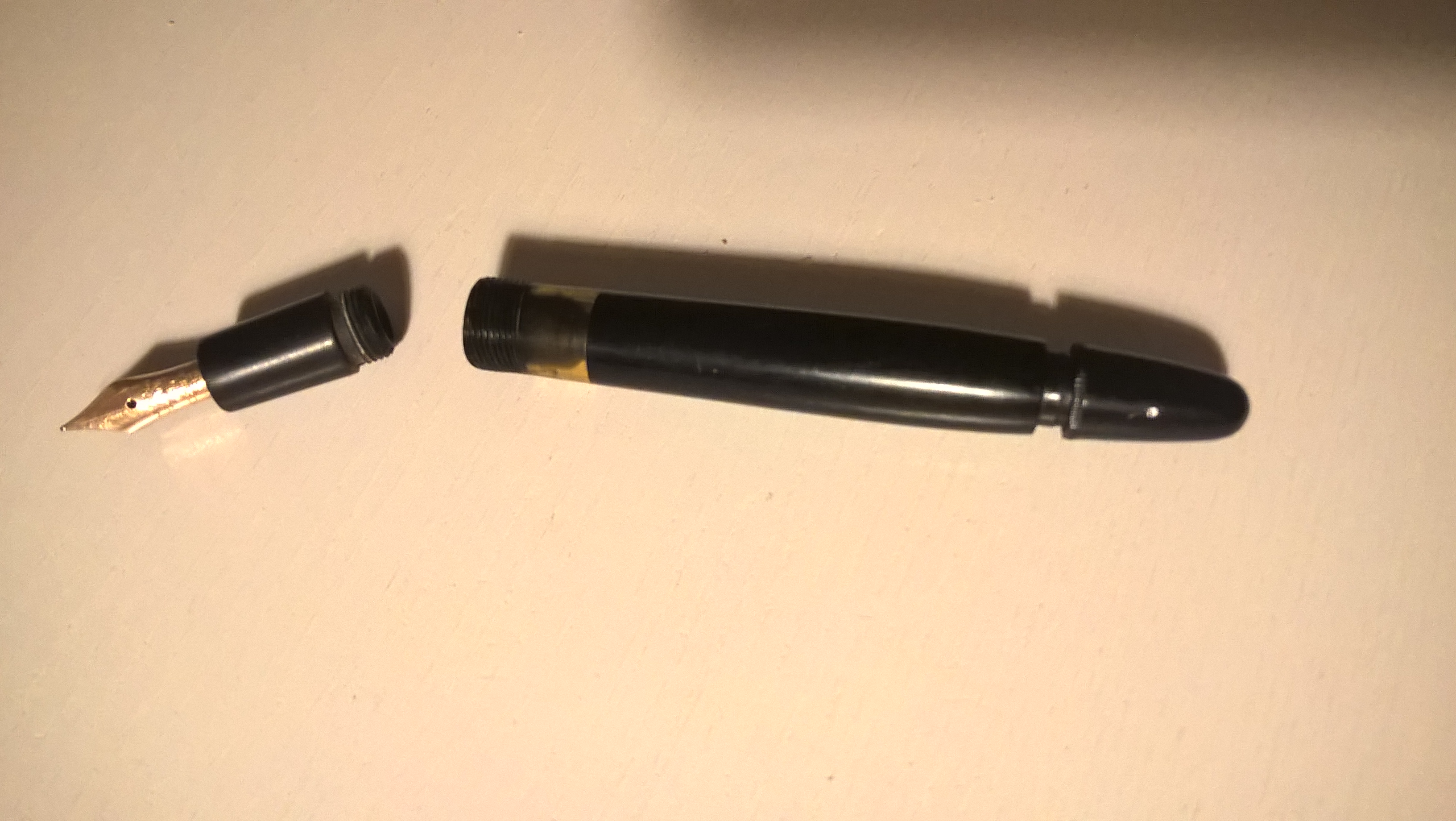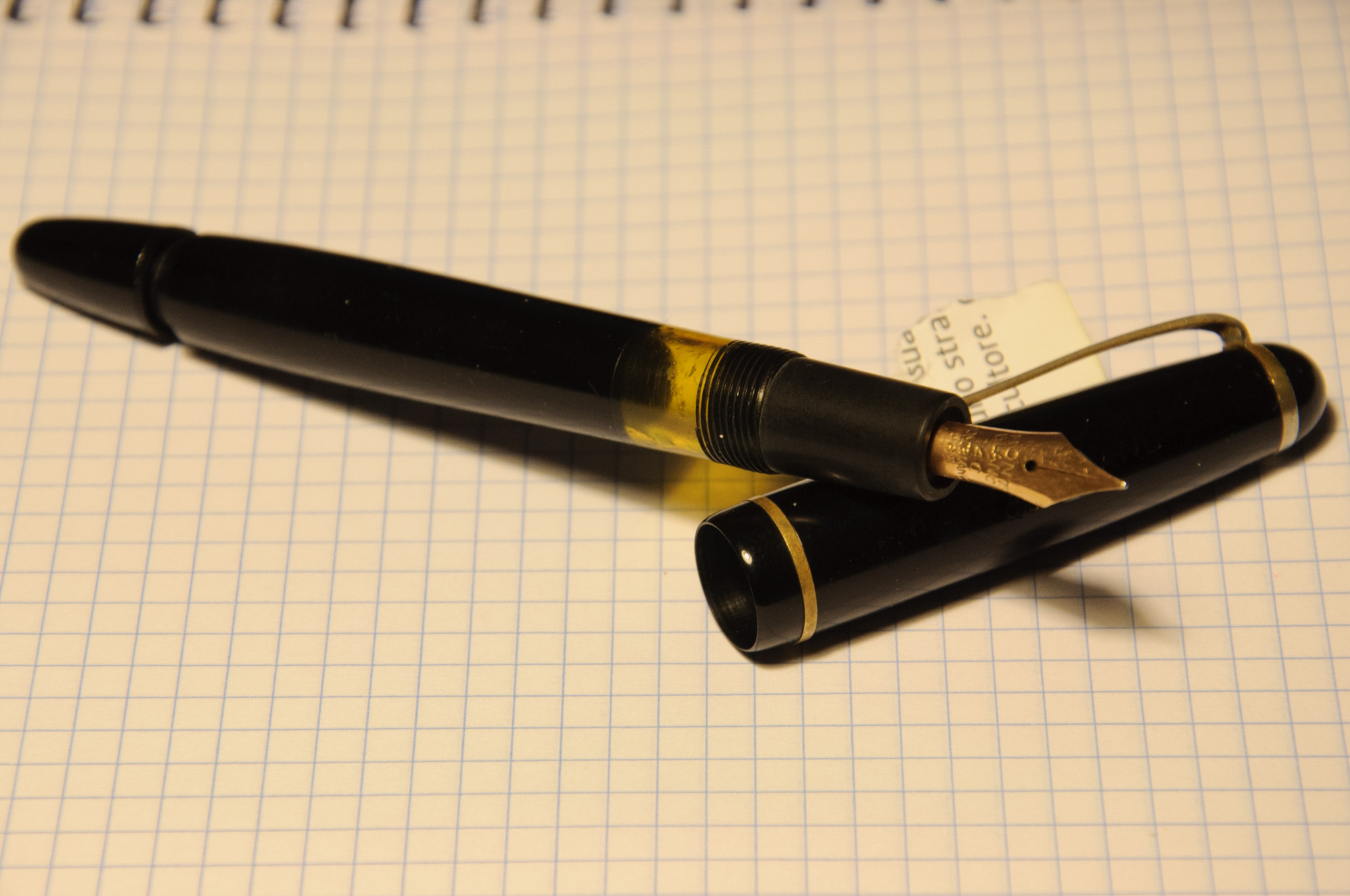 Direi che la penna è di celluloide e il pennino in oro 14k. Ho già lasciato la penna a bagno in acqua diverso tempo e non sembra ci siano incrostazioni di inchiostro. Le condizioni generali della penna sembrano discrete. Gli unici problemi che ho potuto riscontare finora sono lo stantuffo che non tiene e il fondello che non si appoggia al fusto ma rimane staccato di 1 o 2 mm.