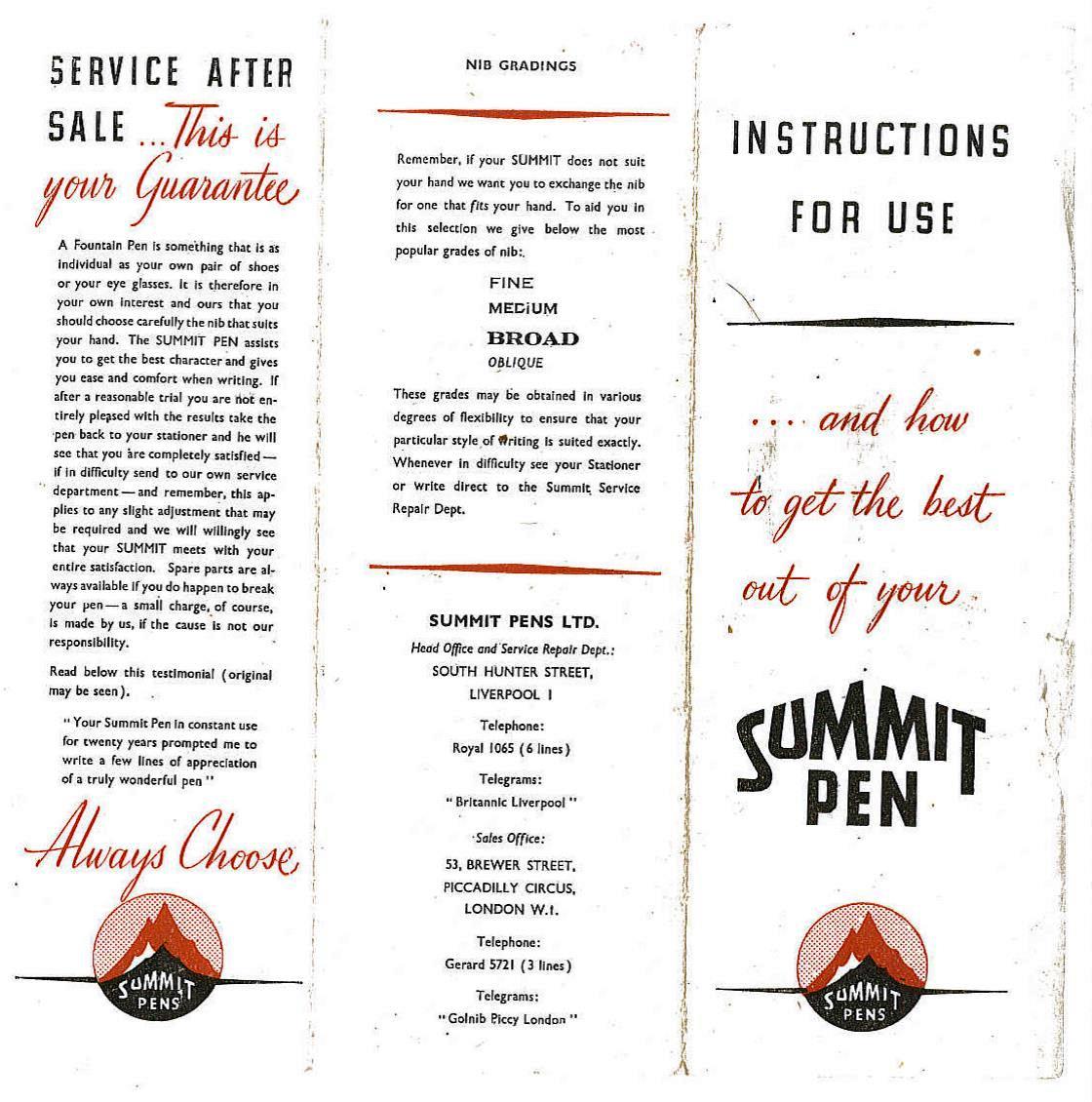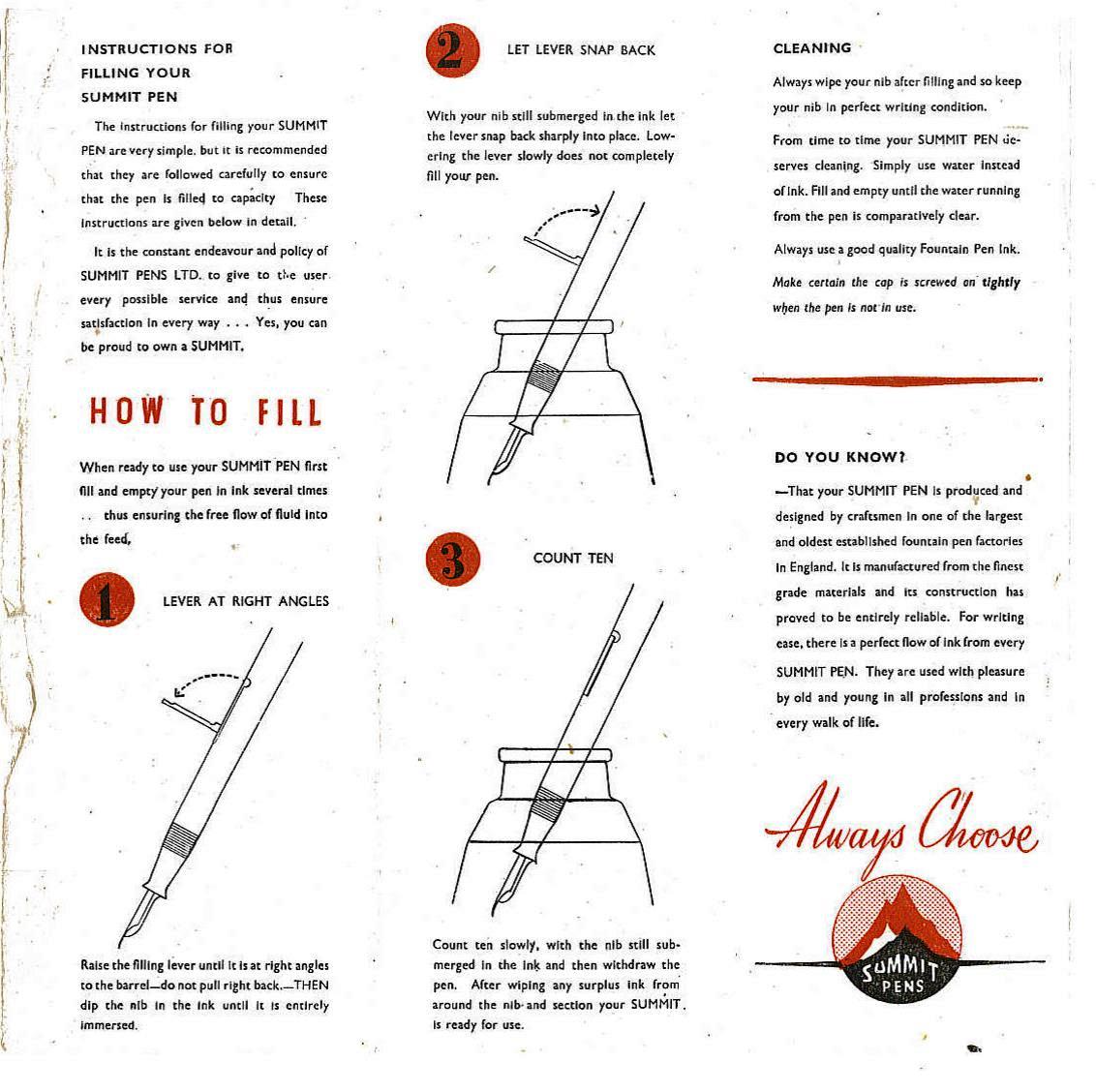 Oggi vi propongo qualcosa di diverso dal mio solito: le immagini del foglietto d’istruzioni originale che accompagnava le stilografiche Summit a partire dal 1945, quando fu fondata la Summit Pens Ltd., azienda del gruppo Lang / Curzon.