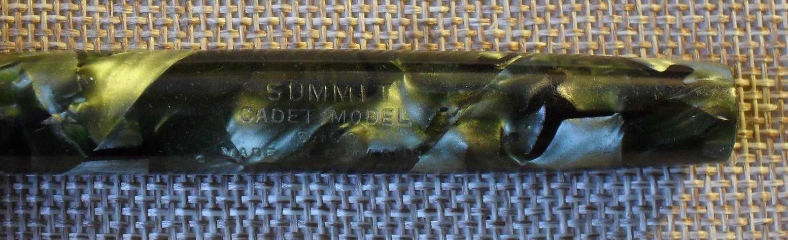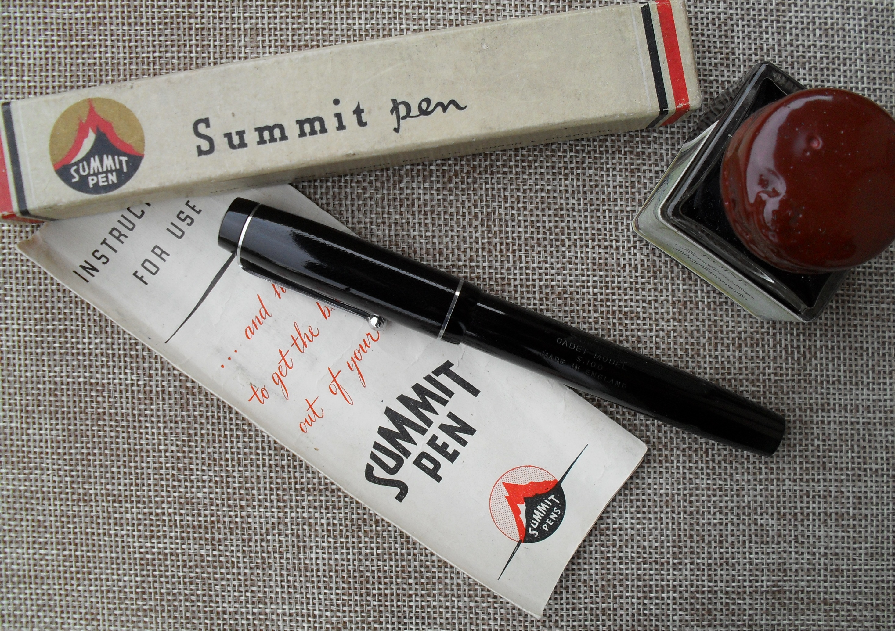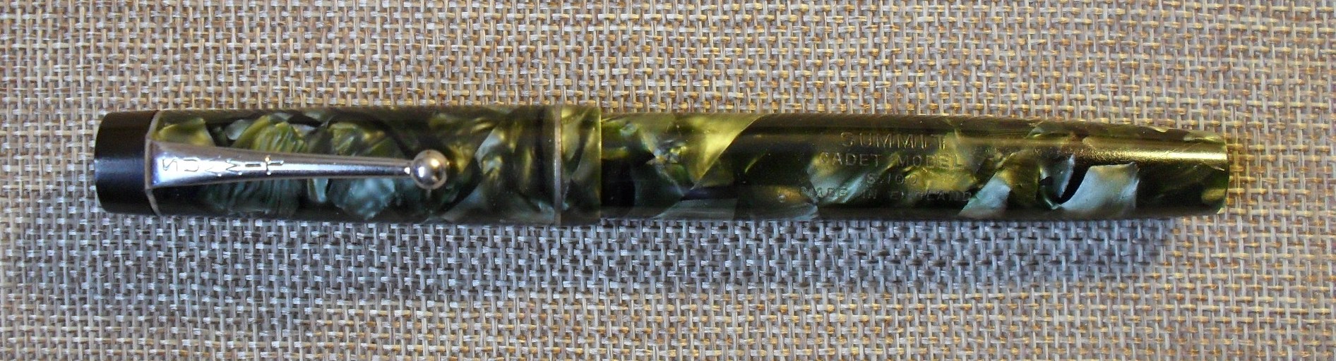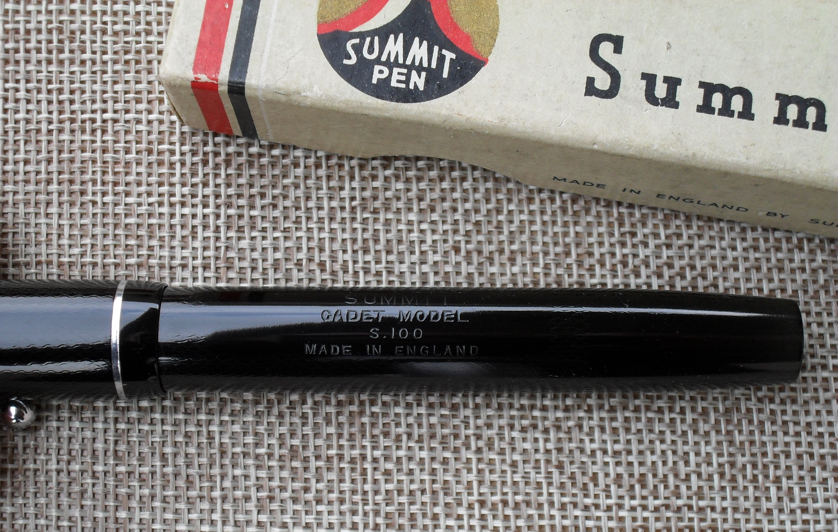 Il modello 100 fu uno dei più popolari nel catalogo Summit ed accompagnò per molto tempo la vita del gruppo d’imprese britannico. Prese il nome di “Cadet” dopo la seconda guerra mondiale, quando evidentemente fu proposto specialmente agli studenti d’ogni età. Le dimensioni della penna, però, sono quelle di una stilografica per adulti e la qualità non teme confronti. La cosa non sorprende, perché il gruppo Lang - Curzon - Summit offrì sempre prodotti ottimi, fino a quando, nel 1953, di fatto si ritirò dalla scena. La struttura della penna è tradizionale ed anche questo non stupisce: la guerra aveva costretto il gruppo Lang / Curzon a sostenere lo sforzo militare e lo sviluppo di nuovi modelli di stilografica si era arrestato inevitabilmente. La ripresa post bellica richiedeva innanzi tutto la disponibilità di strumenti affidabili, di prezzo abbordabile ed in grado di fare brillantemente il loro lavoro: una missione che questa Summit S.100 svolse egregiamente per molto tempo e che ancora oggi è in grado di portare a termine senza incertezze. Lo testimonia il suo servizio diuturno nel mio ufficio. Ma passiamo alle caratteristiche tecniche: