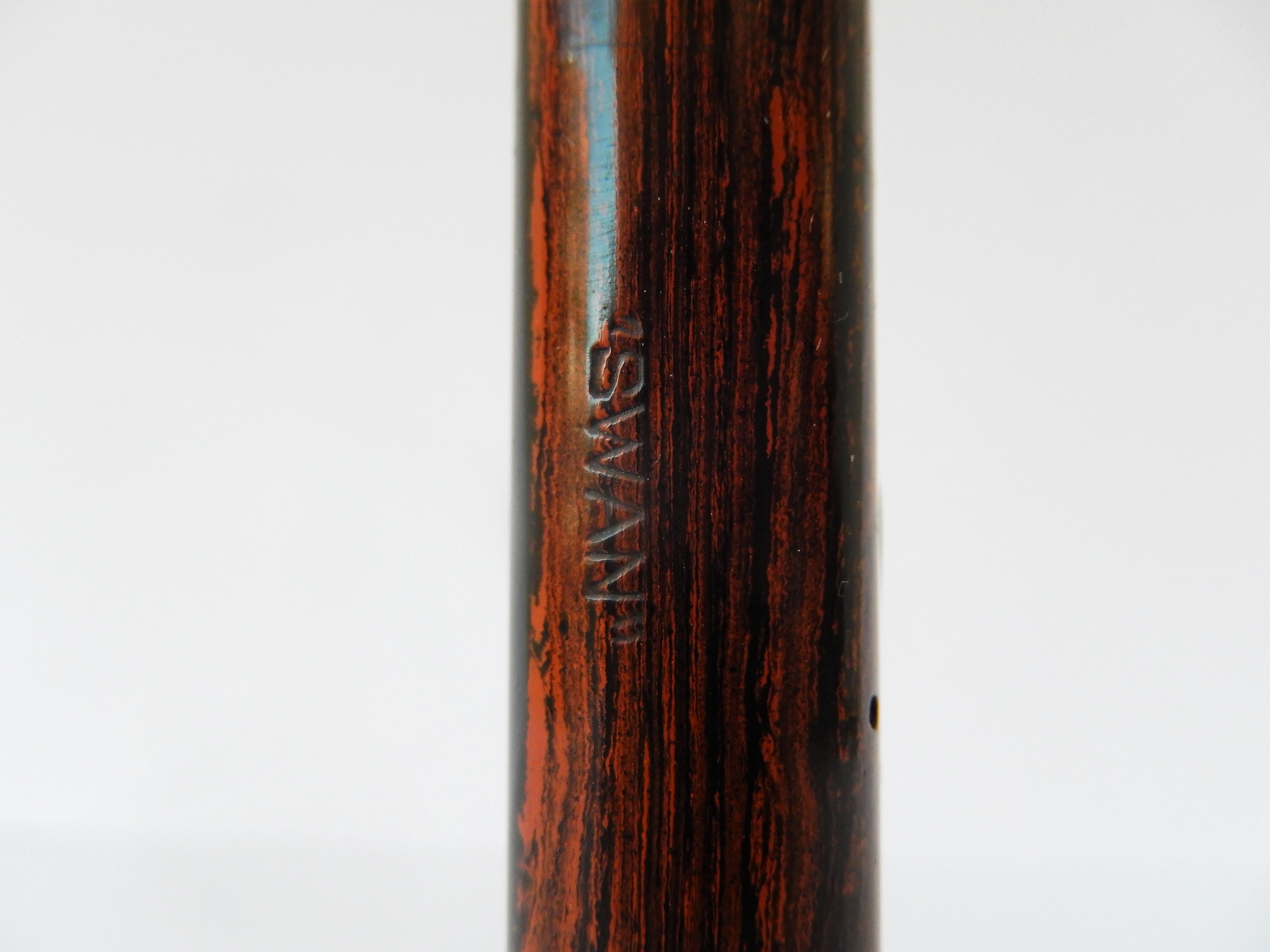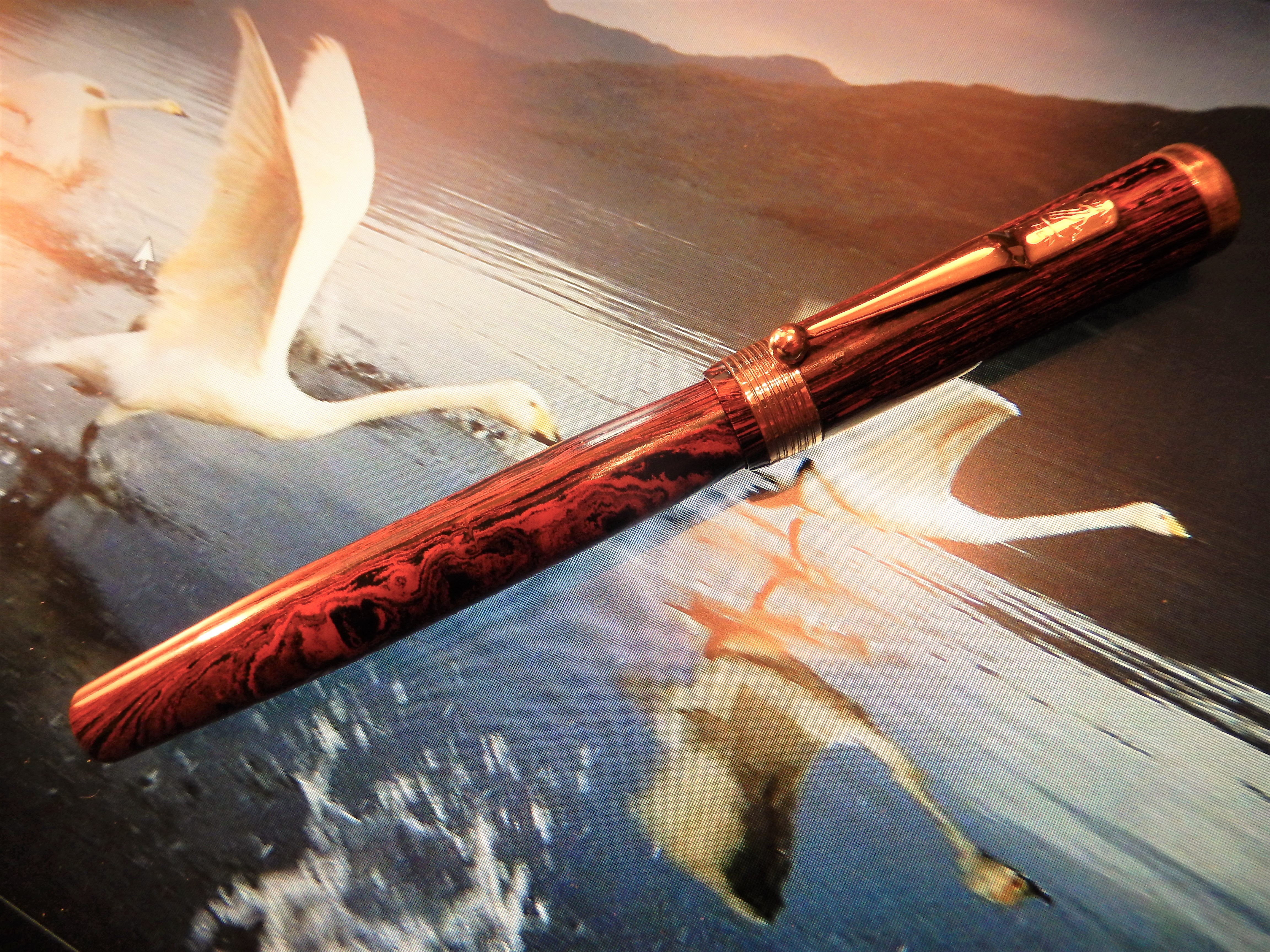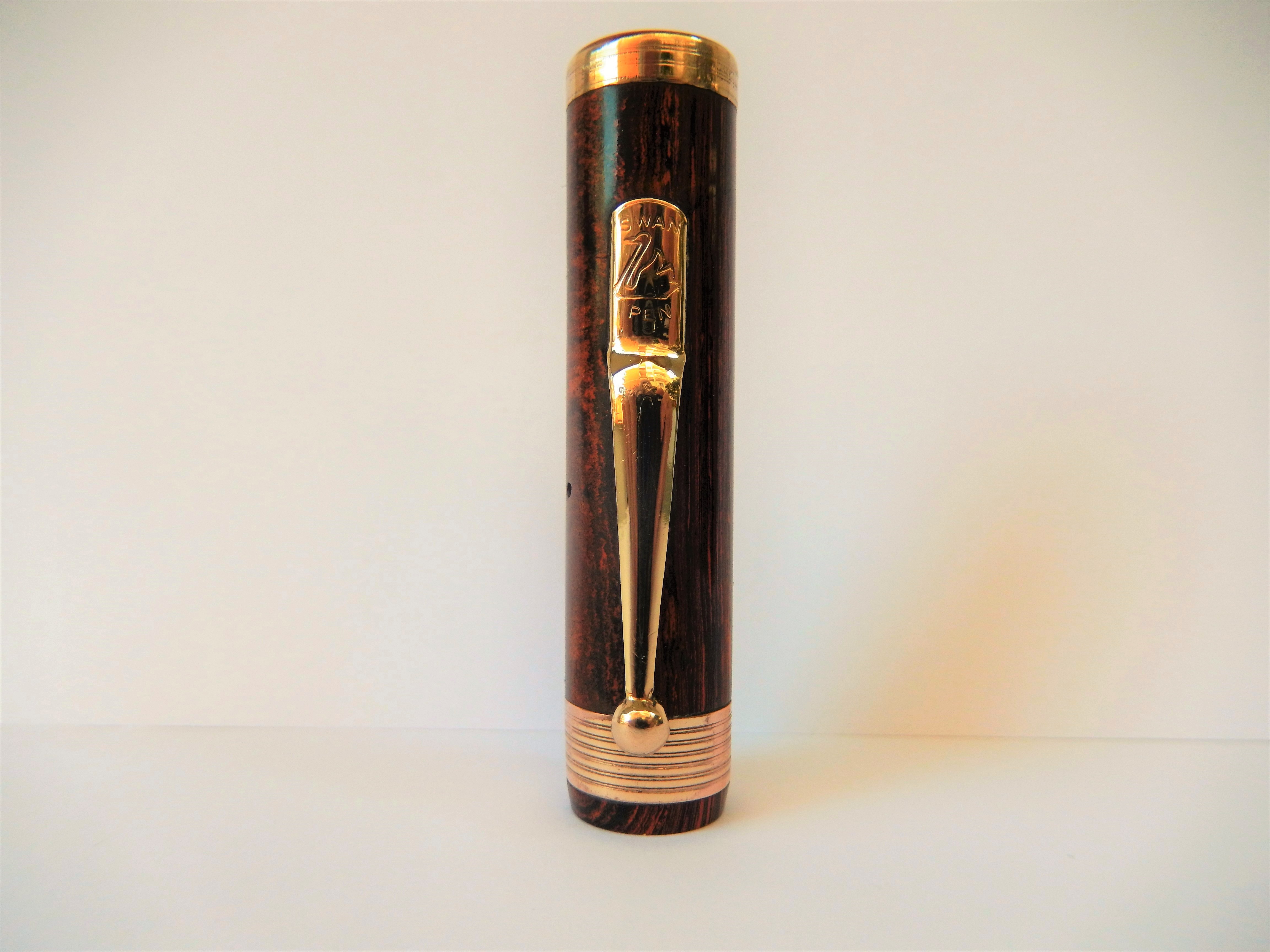 Quando nel 1916 il grande poeta irlandese William Butler Yeats scriveva questi versi tratti dalla sua bellissima " i cigni selvatici di Coole", il cigno della Swan aveva da poco trasvolato l'oceano. Il marchio era stato infatti nel 1915 ceduto dalla originaria proprietà americana alla finanziariamente più solida filiale inglese, avviandosi così a divenire il marchio di quella che fu poi definita " la stilografica dell'impero ". Rinviando per la gloriosa storia della casa alla bellissima trattazione che ne fa il nostro wiki, mi limito a ricordare che comunque lo stabilimento americano continuò a produrre ancora fino a dopo il 1930 ed è per questo che del modello oggi in presentazione, la Eternal, possiamo trovare sia esemplari prodotti negli Stati uniti che in Inghilterra. La Eternal, che in quegli anni fu il modello di punta della casa, già nel nome rivela la volontà di essere la risposta alla garanzia a vita offerta dal white dot della Sheaffer; il modello fu immesso sul mercato intorno al 1924, prima in ebanite e poi successivamente, intorno al 1927, anche in bellissime celluloidi colorate. Questo in presentazione è un esemplare prodotto in Inghilterra in una ebanite mottled che ancora oggi mantiene grande fascino. La penna, che adotta un sistema di carica a leva, è di dimensioni importanti, misurando chiusa 13,9 cm ed aperta circa 15, escluso naturalmente il pennino. Il cappuccio è alto 6 cm ed è decorato da due bande gold filled filettate, di cui quella in alto più stretta ( circa 4 mm) e quella inferiore più larga (circa 7 mm). La presenza di due bande consente di riferire l'esemplare alla prima serie in quanto poi dal 1928 circa rimase solo la banda posta sul labbro inferiore. A metà strada fra le due bande, in linea verticale, è inciso e ben leggibile il nome del marchio. La lunga clip fissa, a scalino in alto e a palla in fondo, esibisce nella parte superiore il simbolo del cigno e termina a ridosso della banda più in basso : peraltro il modello veniva realizzato anche in una versione con la clip fissata più in alto ( e dunque non terminante a ridosso della banda ) e con inciso , invece del marchio del cigno, la scritta su tre livelli " Patent/ Jan/ 1915".