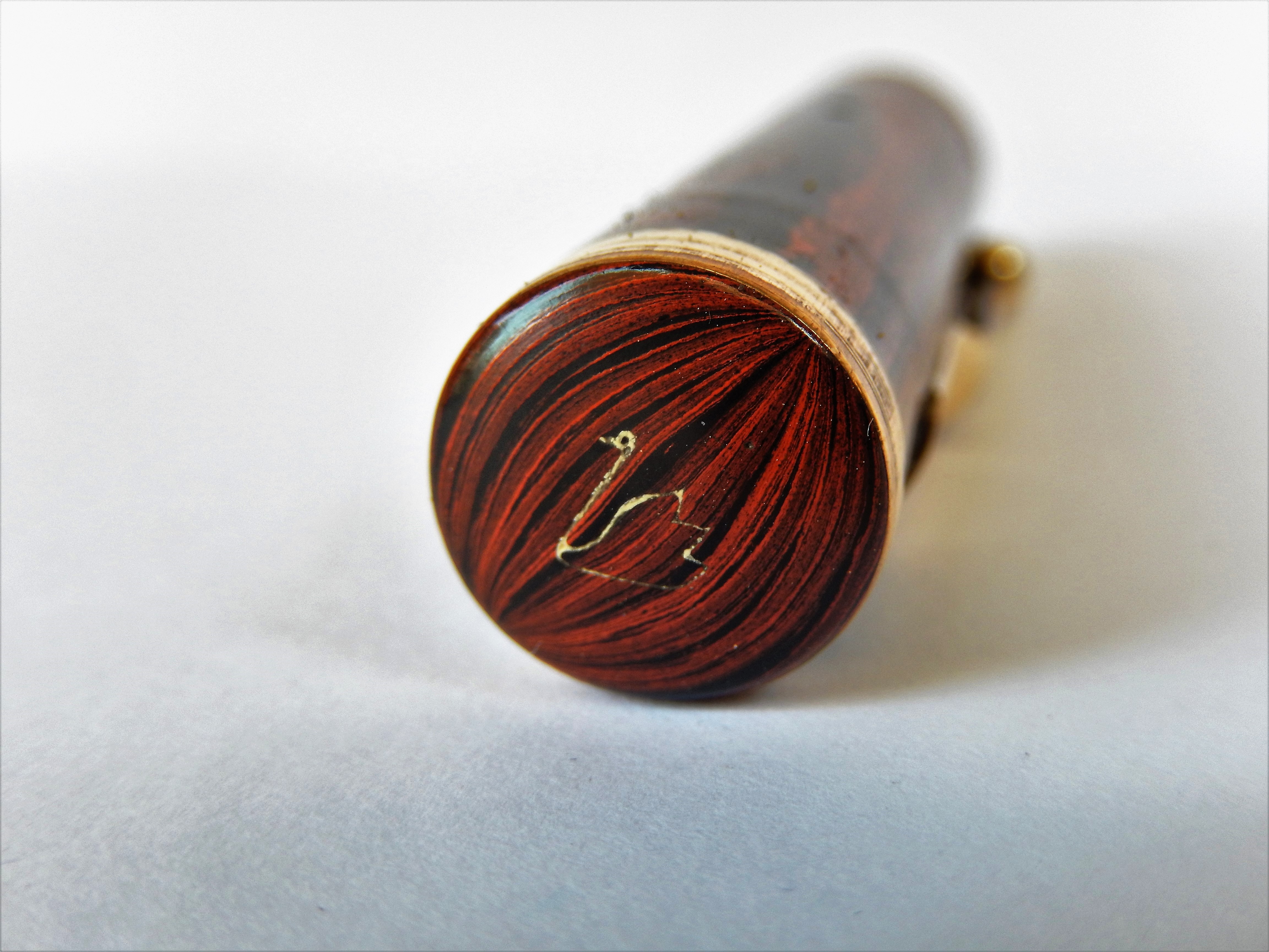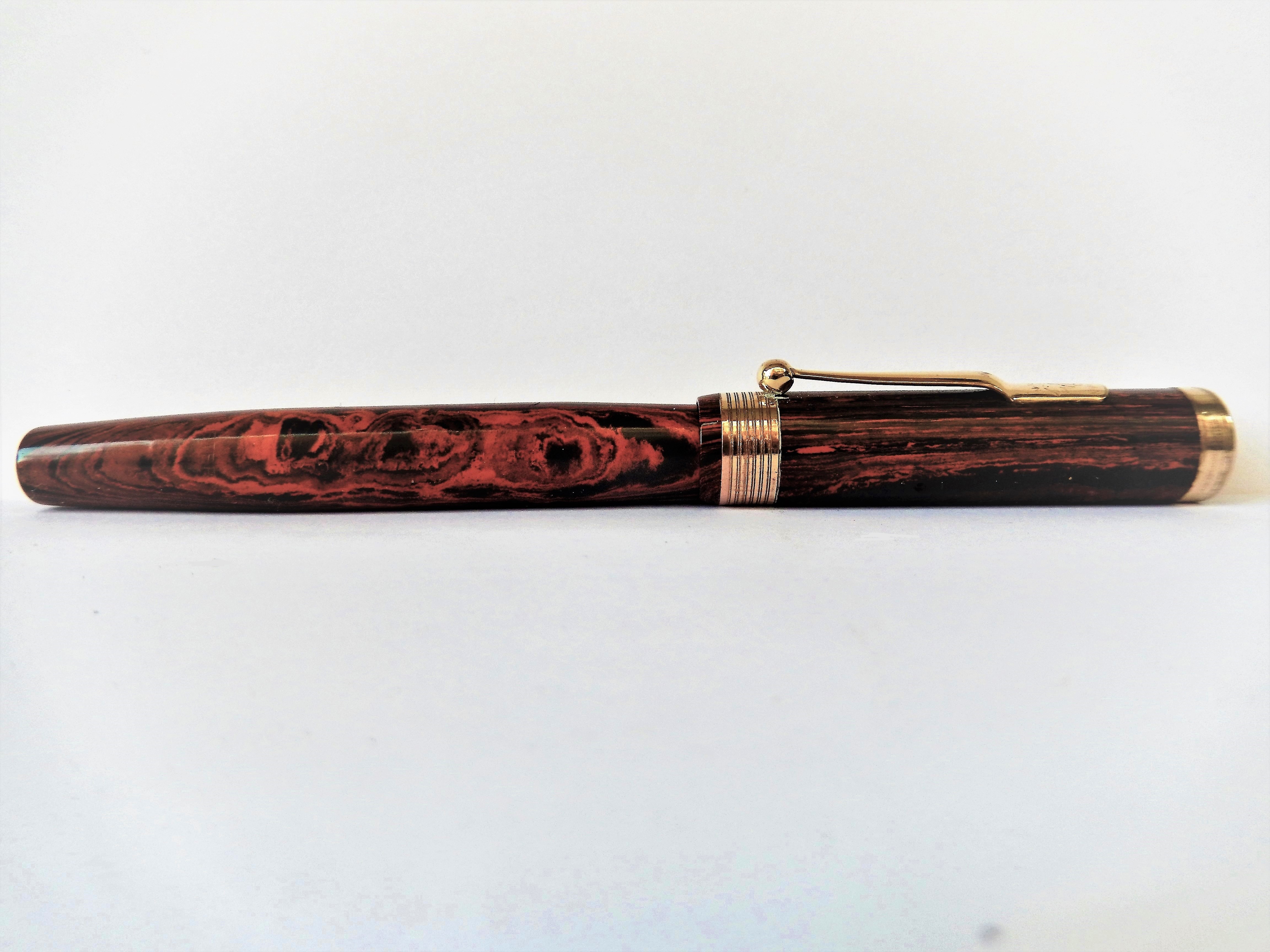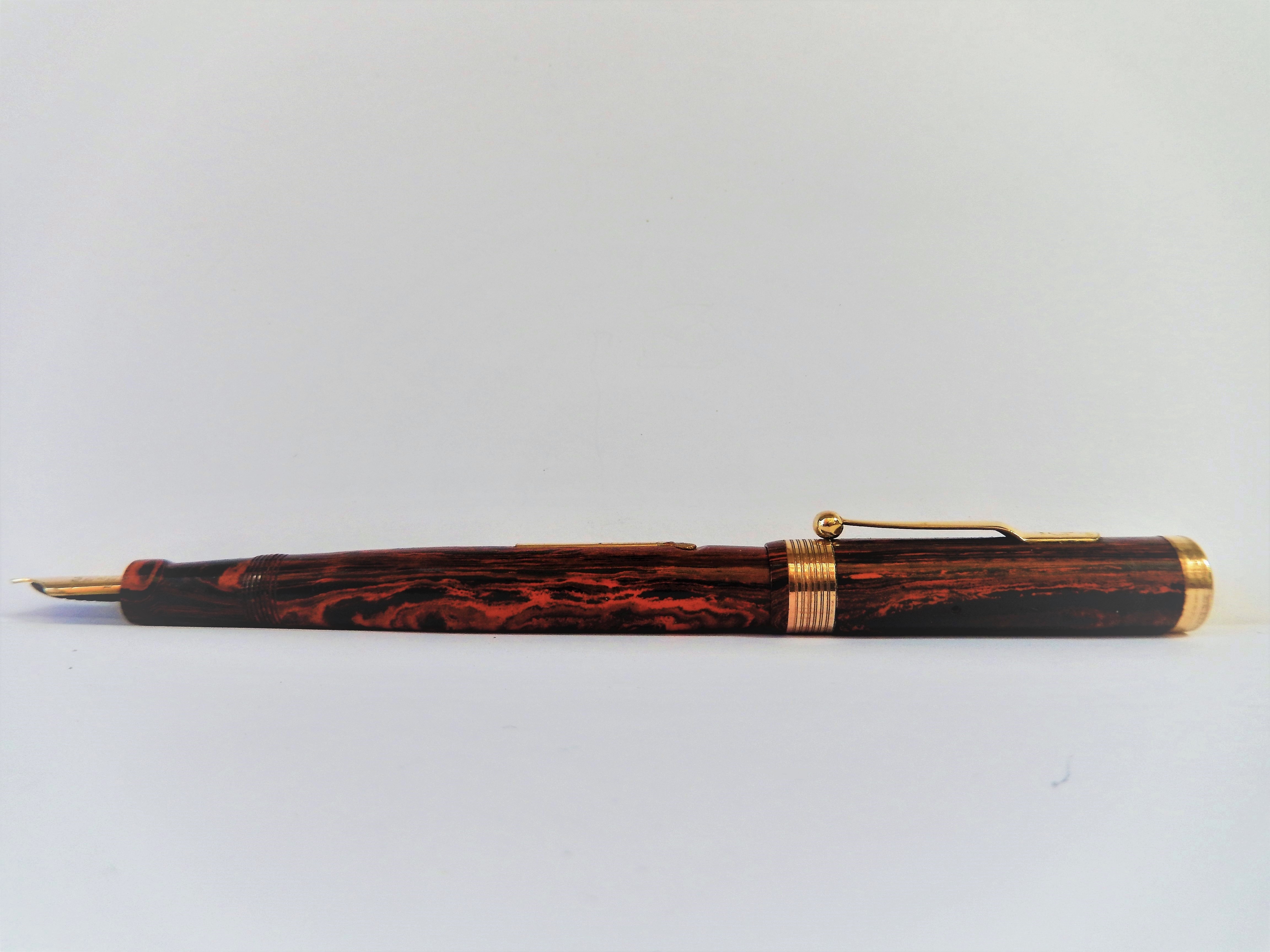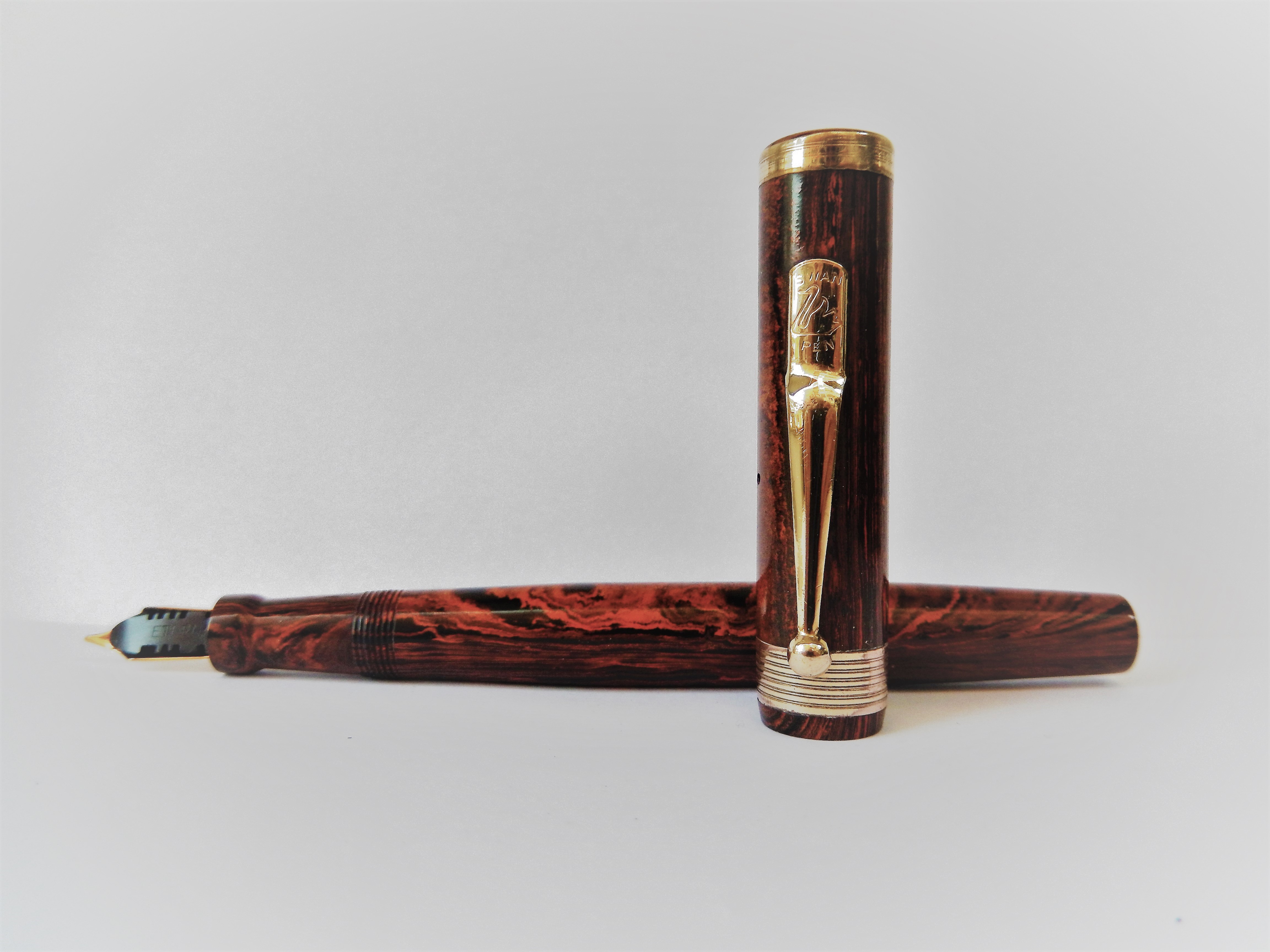 Quando nel 1916 il grande poeta irlandese William Butler Yeats scriveva questi versi tratti dalla sua bellissima " i cigni selvatici di Coole", il cigno della Swan aveva da poco trasvolato l'oceano. Il marchio era stato infatti nel 1915 ceduto dalla originaria proprietà americana alla finanziariamente più solida filiale inglese, avviandosi così a divenire il marchio di quella che fu poi definita " la stilografica dell'impero ". Rinviando per la gloriosa storia della casa alla bellissima trattazione che ne fa il nostro wiki, mi limito a ricordare che comunque lo stabilimento americano continuò a produrre ancora fino a dopo il 1930 ed è per questo che del modello oggi in presentazione, la Eternal, possiamo trovare sia esemplari prodotti negli Stati uniti che in Inghilterra. La Eternal, che in quegli anni fu il modello di punta della casa, già nel nome rivela la volontà di essere la risposta alla garanzia a vita offerta dal white dot della Sheaffer; il modello fu immesso sul mercato intorno al 1924, prima in ebanite e poi successivamente, intorno al 1927, anche in bellissime celluloidi colorate. Questo in presentazione è un esemplare prodotto in Inghilterra in una ebanite mottled che ancora oggi mantiene grande fascino. La penna, che adotta un sistema di carica a leva, è di dimensioni importanti, misurando chiusa 13,9 cm ed aperta circa 15, escluso naturalmente il pennino. Il cappuccio è alto 6 cm ed è decorato da due bande gold filled filettate, di cui quella in alto più stretta ( circa 4 mm) e quella inferiore più larga (circa 7 mm). La presenza di due bande consente di riferire l'esemplare alla prima serie in quanto poi dal 1928 circa rimase solo la banda posta sul labbro inferiore. A metà strada fra le due bande, in linea verticale, è inciso e ben leggibile il nome del marchio. La lunga clip fissa, a scalino in alto e a palla in fondo, esibisce nella parte superiore il simbolo del cigno e termina a ridosso della banda più in basso : peraltro il modello veniva realizzato anche in una versione con la clip fissata più in alto ( e dunque non terminante a ridosso della banda ) e con inciso , invece del marchio del cigno, la scritta su tre livelli " Patent/ Jan/ 1915".