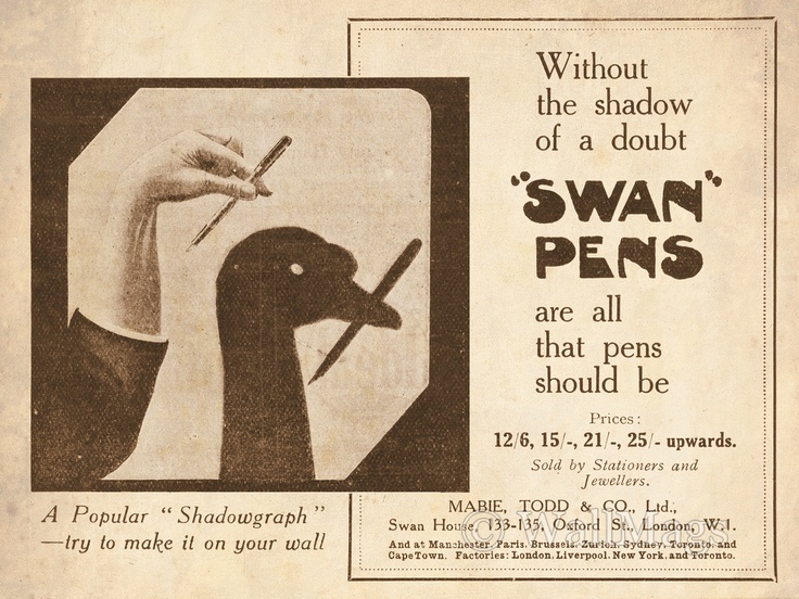 PS : approfitto, dato che nel primo messaggio avevo superato il limite delle 10 immagini, per aggiungere una prova di scrittura, sia pure nella consapevolezza di quanto la mia sottragga ai meriti della stilografica. Allego anche una vecchia pubblicità Swan , cosi se qualcuno sul muro di casa volesse cimentarsi nello shadowgraph ...