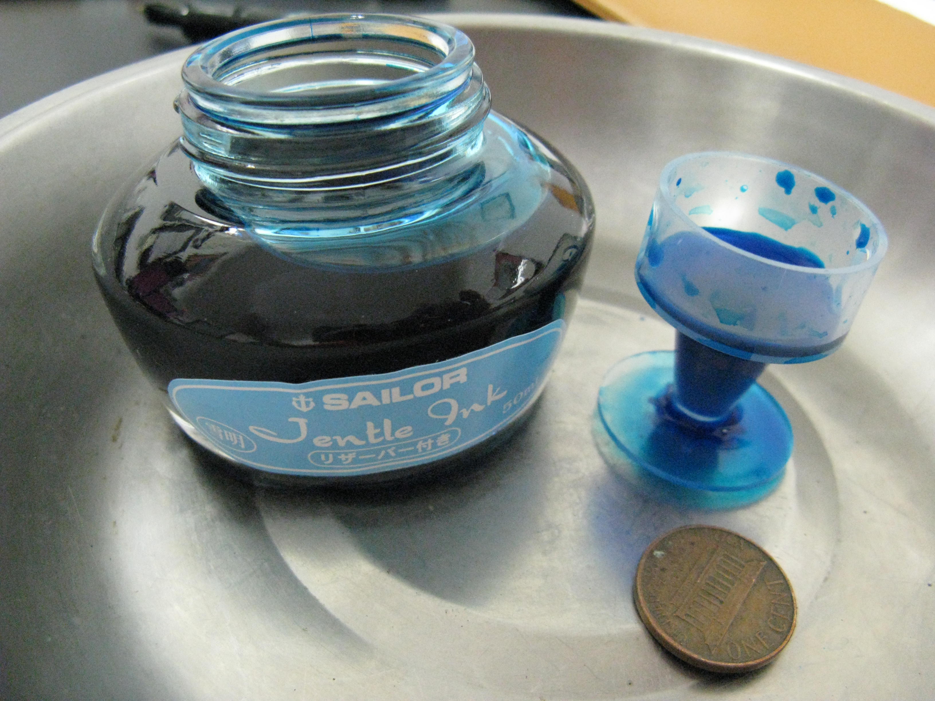 Ed il gioco del ribaltare la boccetta per usare l'inserto a V (usato da twisbi e sailor) si dimostra altrettanto inefficace (più o meno di quanto tempo uno vuole perdere in equlibrismi idrodinamici per farci finire il residuo di inchiostro) quando la boccetta è agli sgoccioli. Il vecchio ink-well della Sheaffer è molto, ma molto più semplice ed efficace.