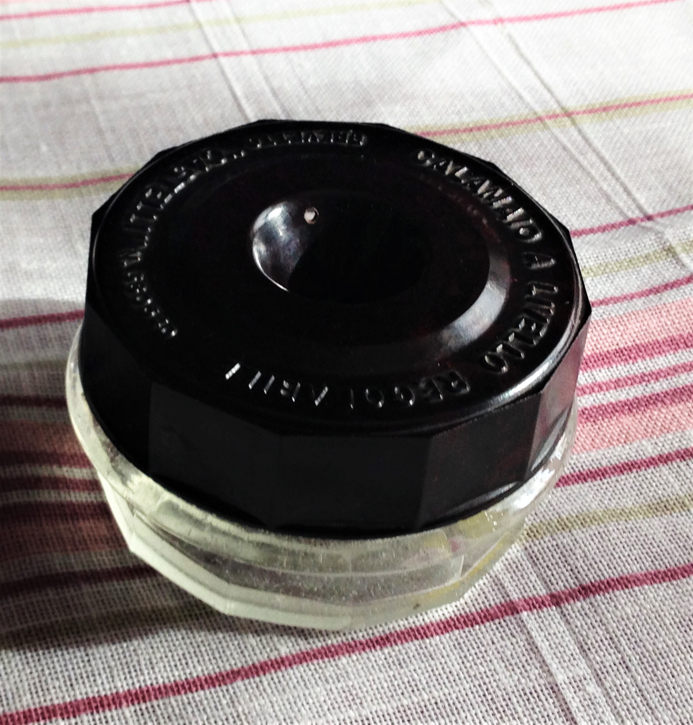 E' un calamaio da banco di scuola, quelli che si mettevano nell'apposito foro e che il bidello passava a riempire tutte le mattine, non ha nessun valore né una particolare bellezza, è solo un ritorno alla monella che regolarmente imbrattava i quaderni con macchie d'inchiostro e nel cercare di cancellare i disastri finiva col fare i buchi