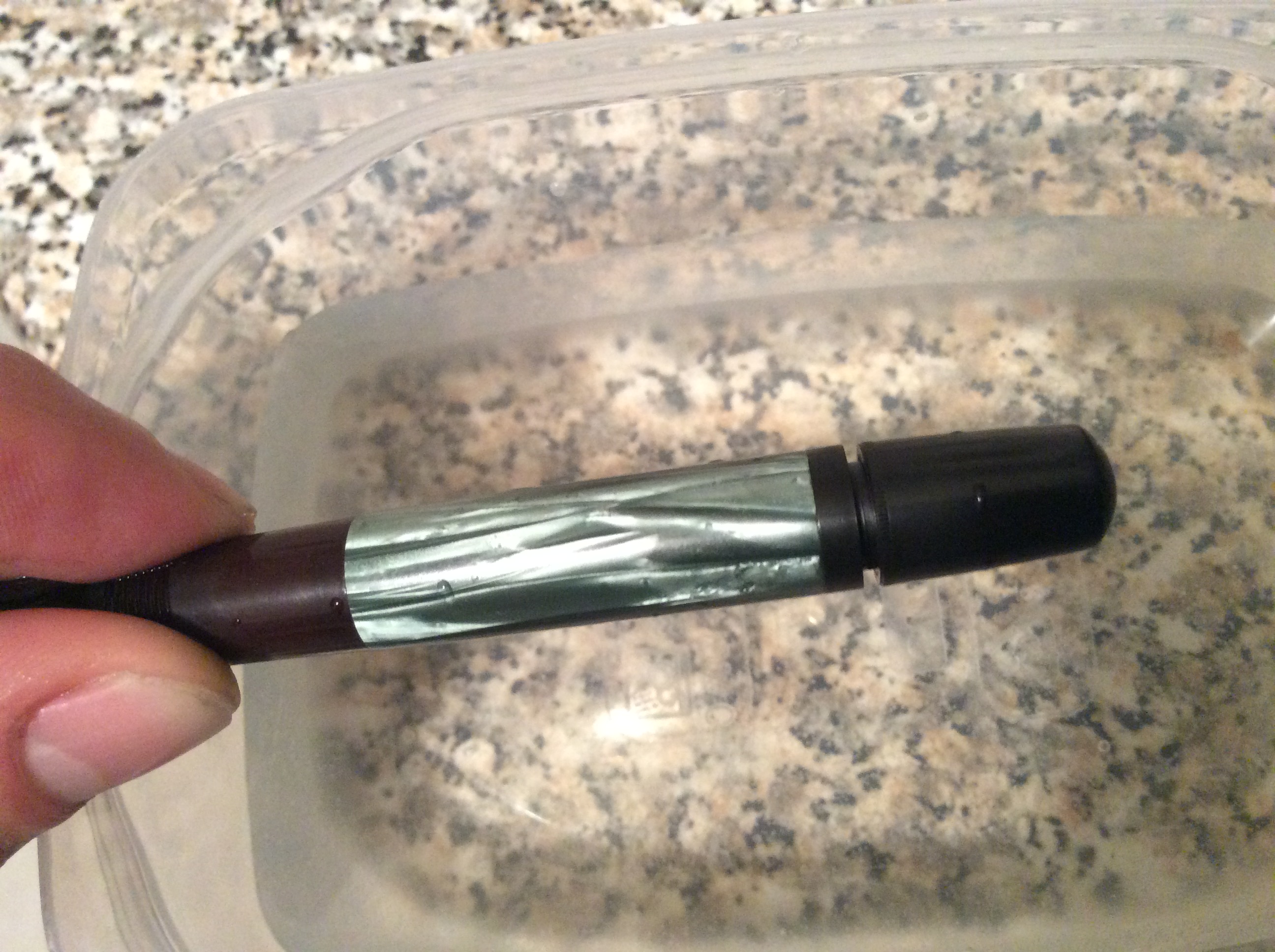 Questa penna è un po' problematica, il corpo è interamente in celluloide verde e non ha quella sottile copertura che ho sempre trovato nelle altre. Il grosso problema è che partendo dalla sezione il corpo-serbatoio è molto stretto, man mano si sale il corpo si allarga di molto. A questo punto la guarnizione non fa presa in alto se la faccio a misura che arrivi sino in fondo o non scende se la faccio a misura per la parte alta...Spero di essermi spiegato...Forse degli o-ring potrebbero adattarsi meglio alla grande variazione di misura del corpo penna?