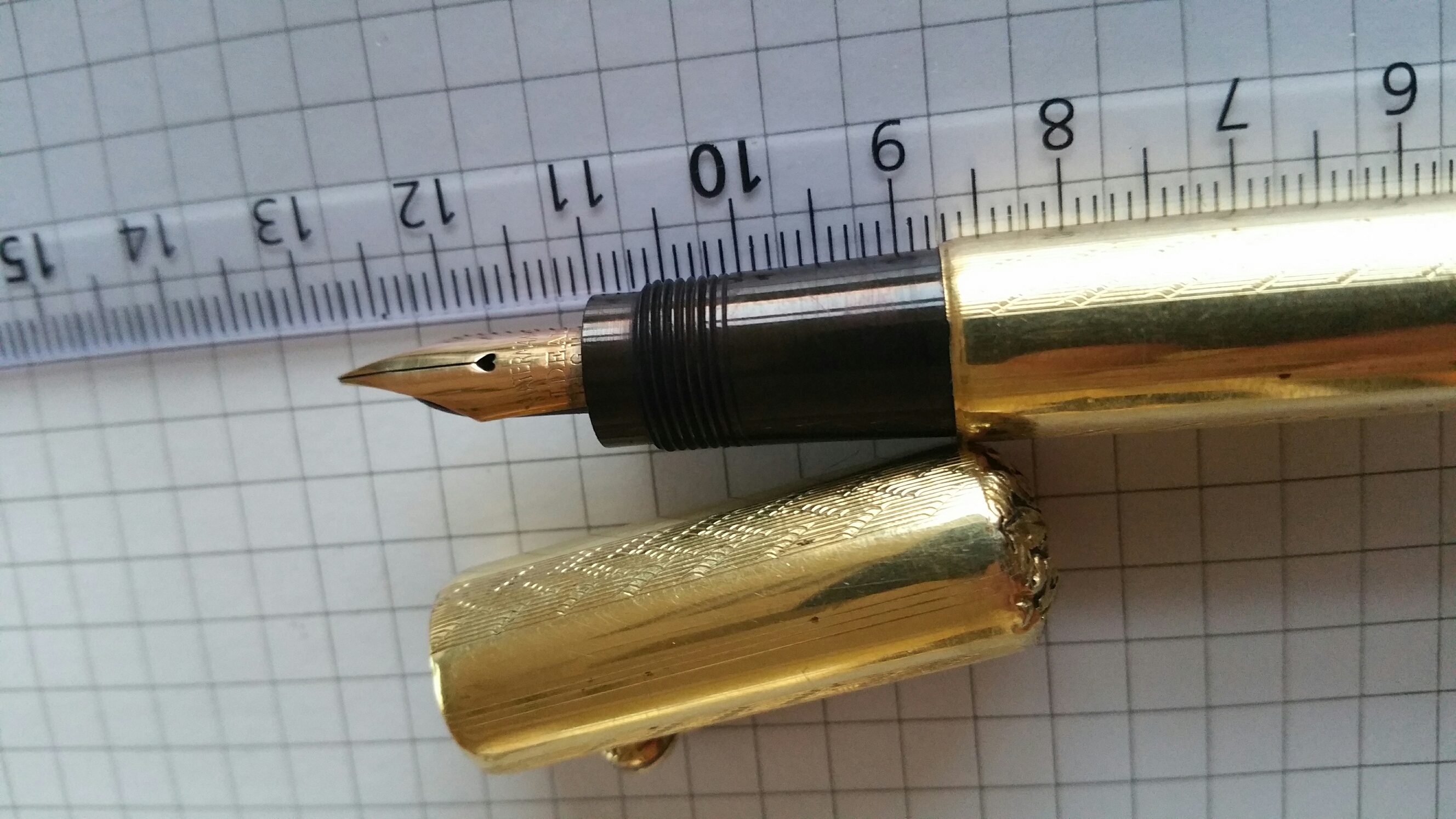 E' una Waterman 42 con un rivesto laminato autorizzato, a giudicare dalla stampigliatura che si vede in una foto. Le 42 sono delle rientranti, si caricano con un contagocce ritratto il pennino. Ovviamente va verificata la tenuta delle guarnizioni, prima di farlo. I dettagli su caricamento li trovi sul wiki (ti lascio il piacere della ricerca).