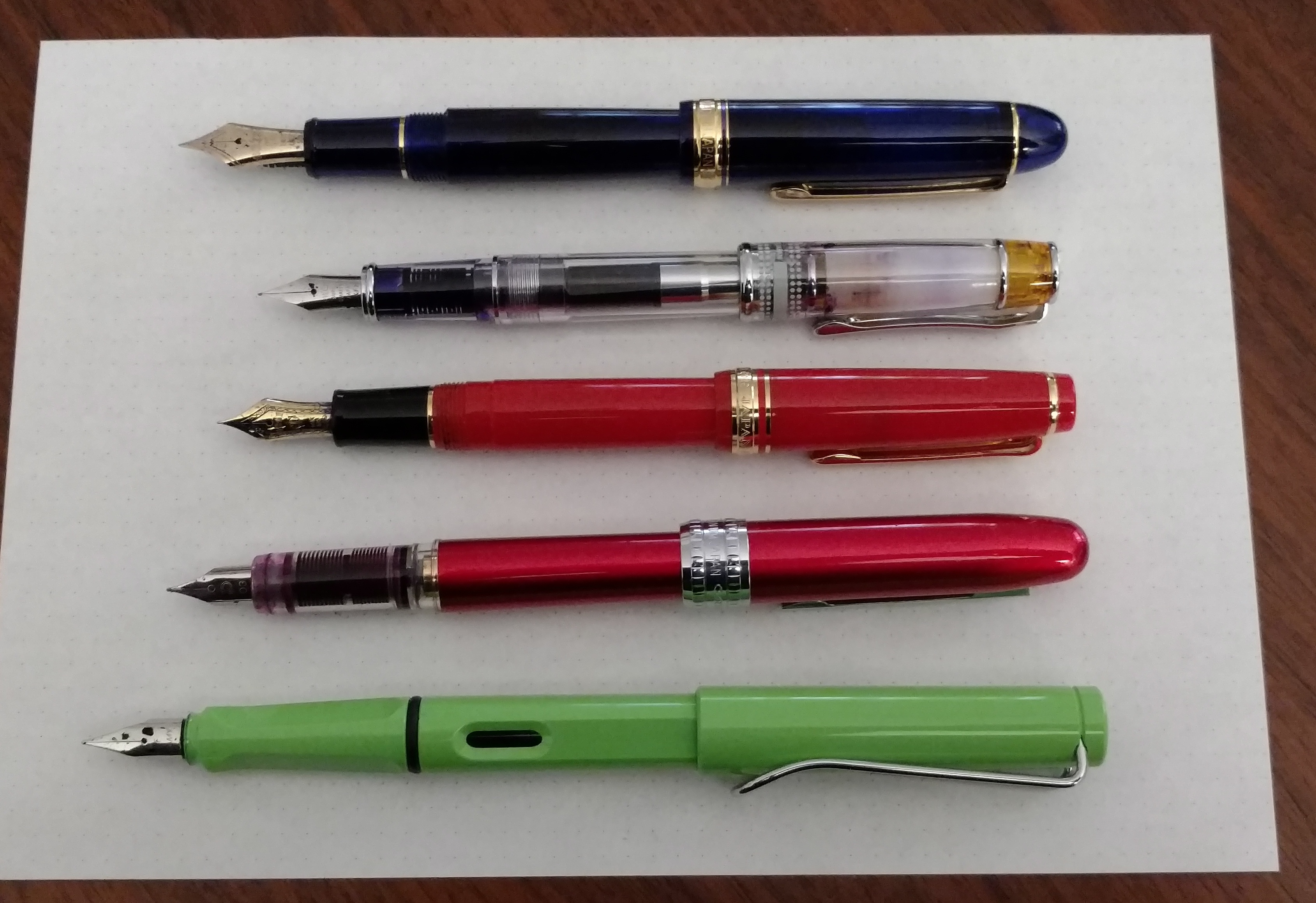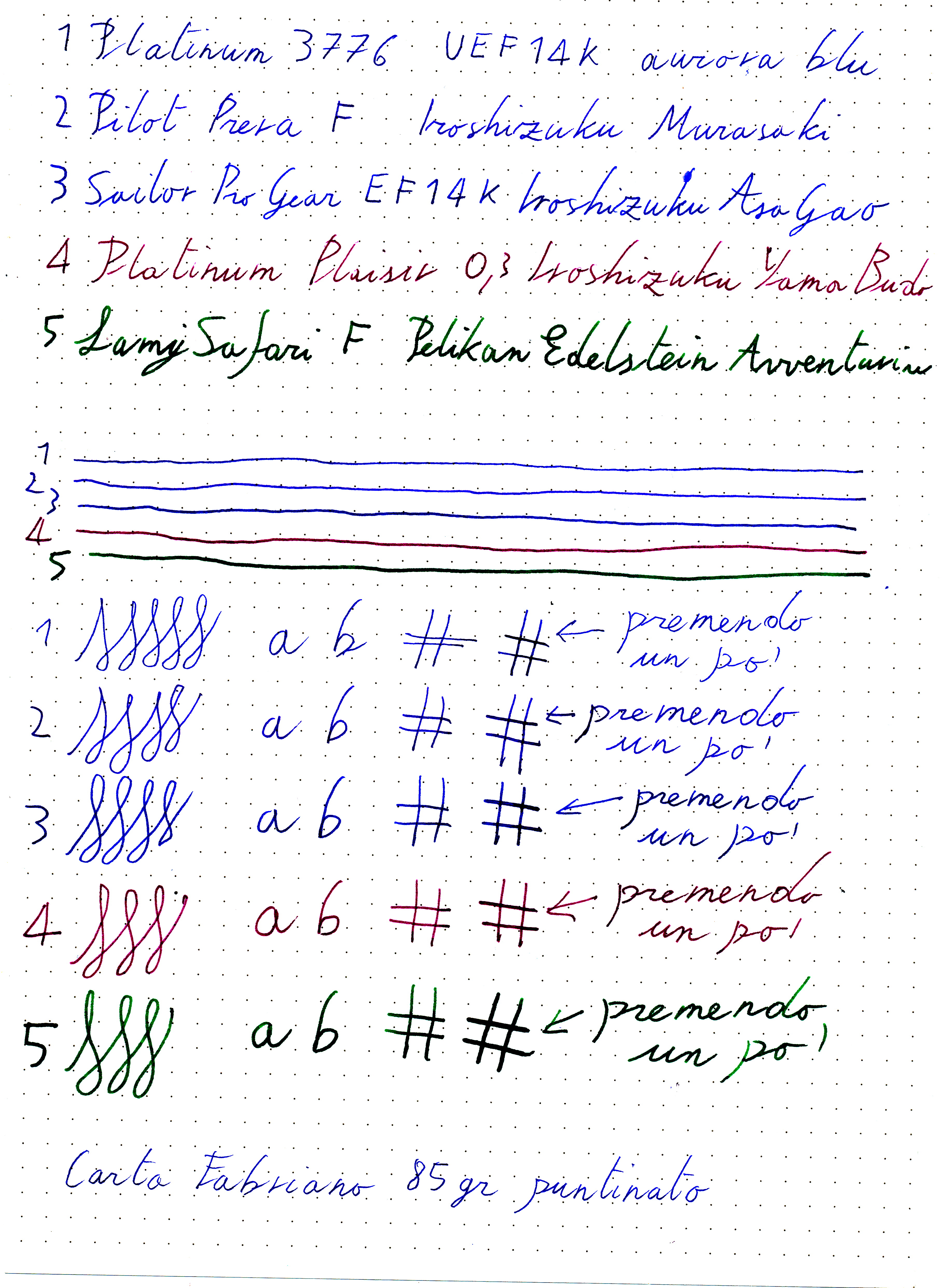 Il test riguarda 4 giapponesi e una Lamy Safari F, scelta perchè penso sia facile reperirne una e poterne vedere il tratto dal vivo, così da avere un metro di paragone.