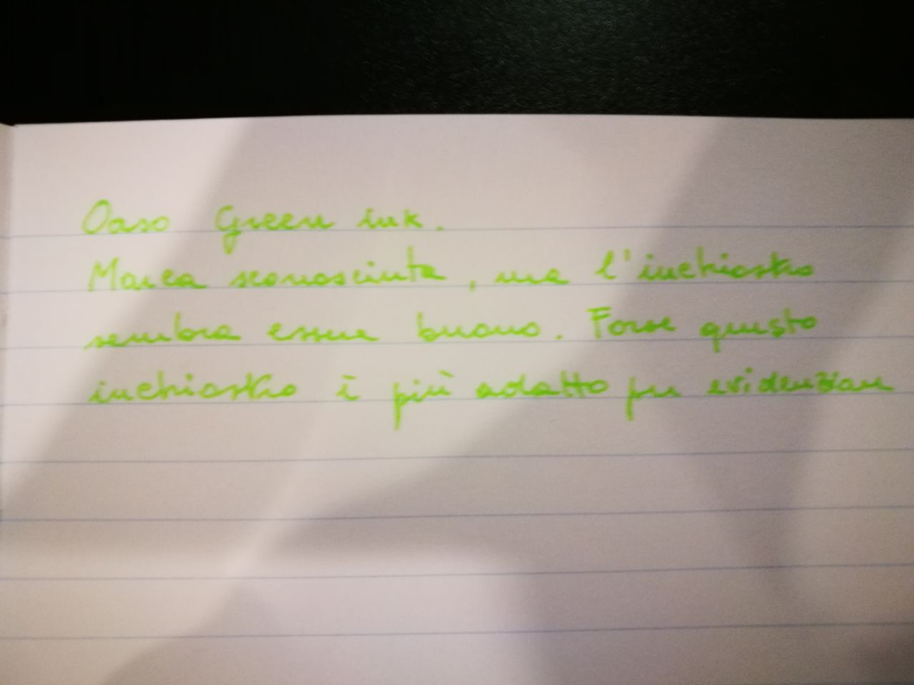 nel caso in esame l'inchiostro si presenta come un verde dalla tonalità molto viva. Magari è un inchiostro che la prossima volta potrei provare a prendere.