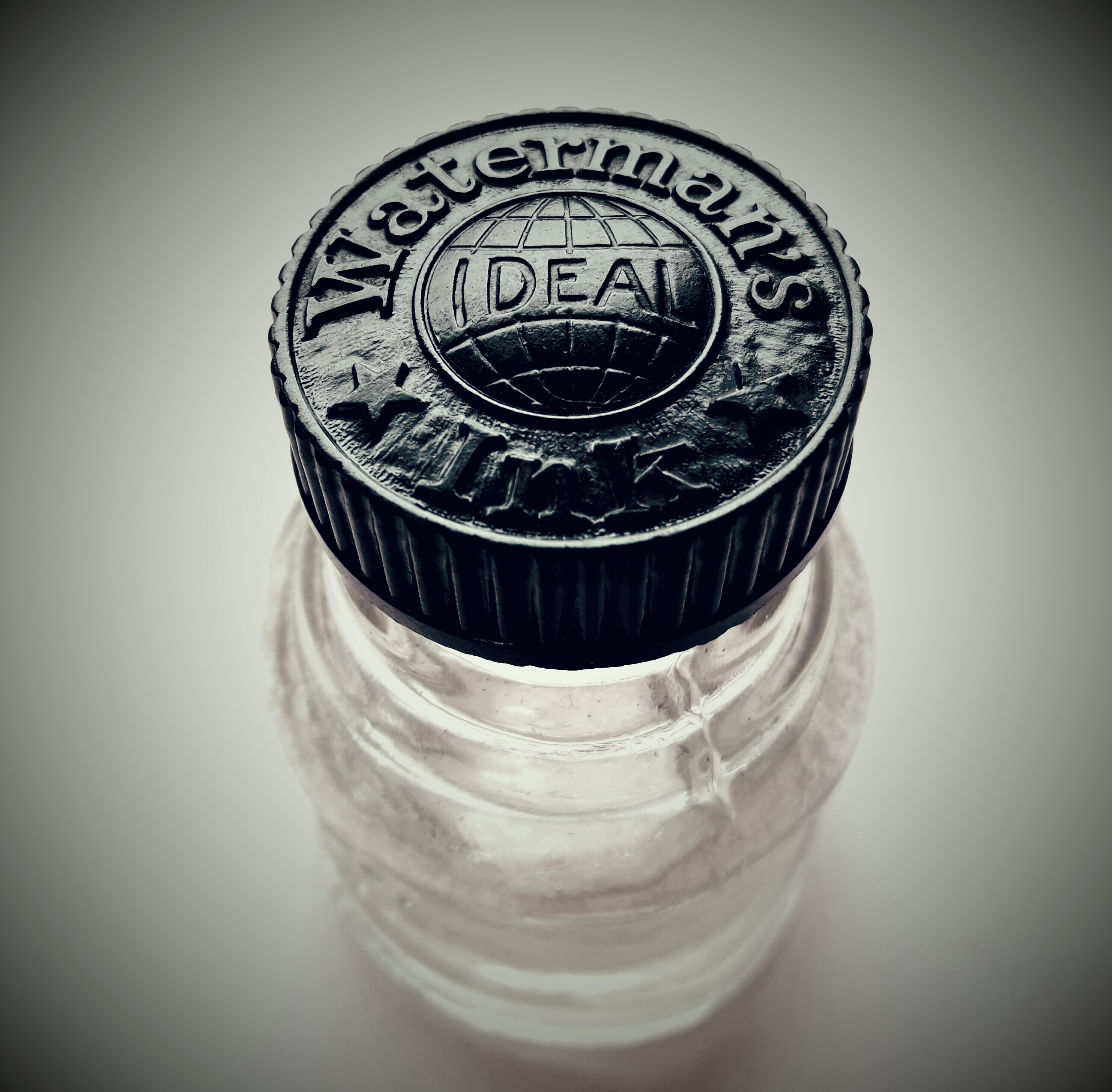 Potrebbe essere stata la boccetta standard per l’alimentazione di questa mia bella Waterman 52 rivestita Cavaliere con Marca di controllo di metà anni Trenta… Sotto la bottiglia è presente una ulteriore serie di scritte, verosimilmente apposte dal vetraio costruttore (sì, perché le boccette erano realizzate a mano!
