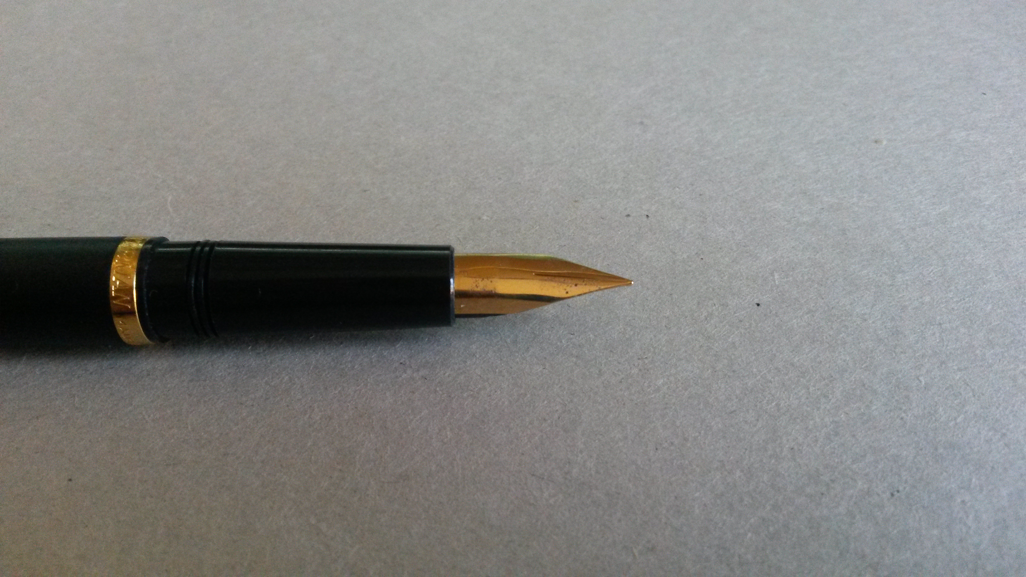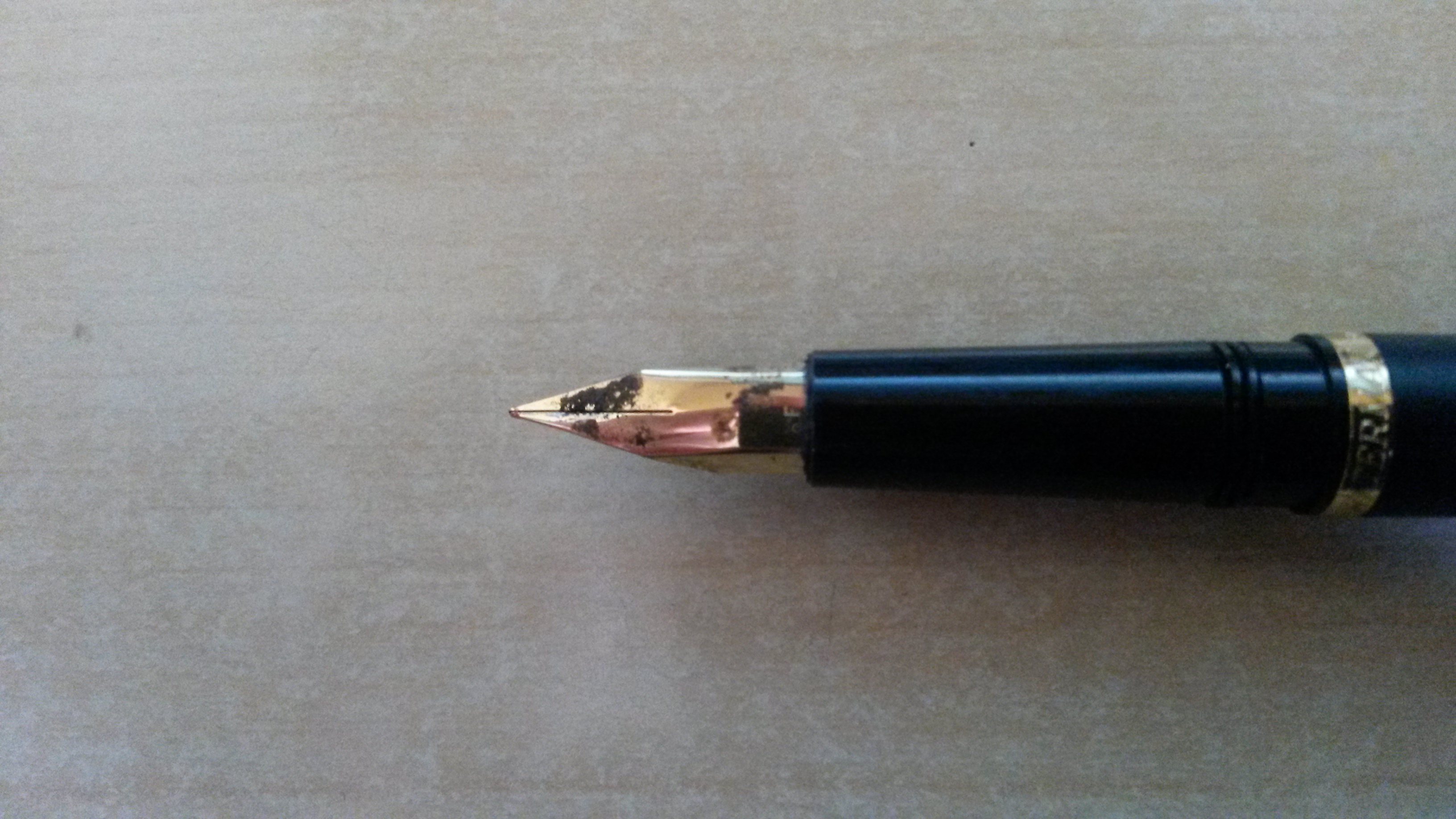 Ho trovato in un armadietto questa stilografica Waterman di cui non conosco il modello (il nome non è indicato nè sulla scatola nè sul foglietto d'istruzioni all'interno). Il pennino era parecchio sporco ed ho provato a dargli una ripulita con un panno morbido, asciutto prima e inumidito con acqua dopo (lo stato attuale è come mostrato in foto); non capisco però se il metallo del pennino è rovinato oppure sono tracce di inchiostro vecchie di almeno una decina d'anni. Dovrei continuare a sfregare con il panno umido (per paura di fare danni finora ci sono andato molto leggero) oppure usare un qualche detergente?