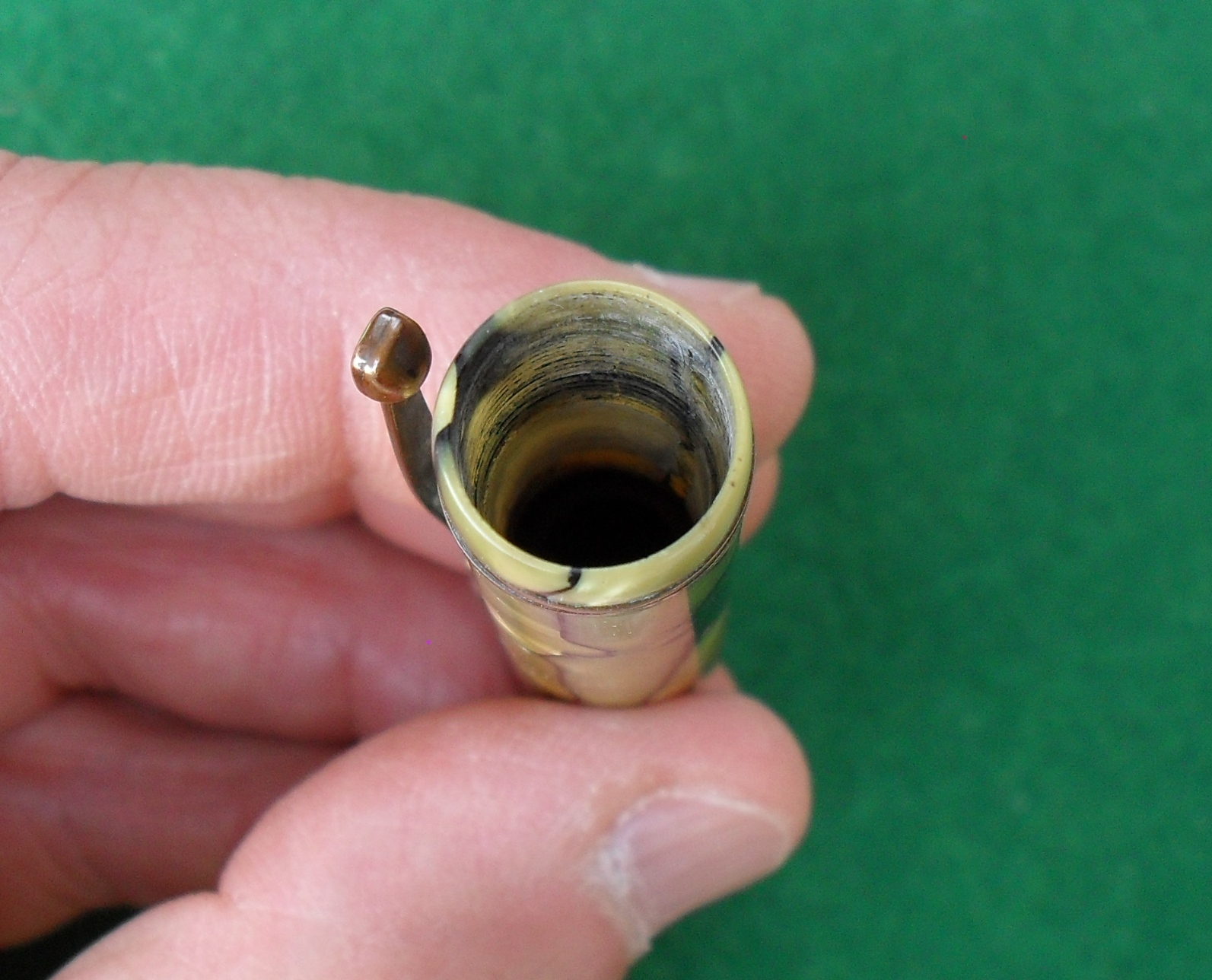 La penna verrà sottoposta ad un restauro, ma presenta un difetto importante: il cappuccio non si avvita. Esaminando le fotografie, noterete che la filettatura del corpo è stata levigata. L’interno del cappuccio mostra una sorta di rivestimento liscio, che si è rotto (fortunatamente senza che la rottura interessasse il cappuccio) e che credo sia stato aggiunto per creare uno spessore interno addizionale, così da consentire al cappuccio di innestarsi sul corpo con semplice pressione. Purtroppo, nella fotografia che segue, si vede poco: