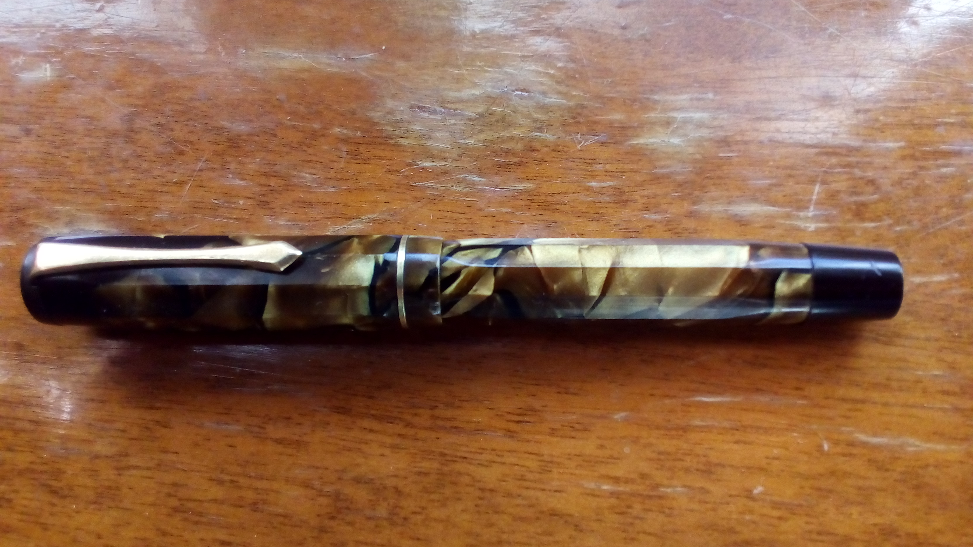 Eccola qui. Al momento l'ho alimentata con una cartuccia Pelikan, ma credo che il sistema di alimentazione fosse differente: non ho ben capito la funzione di quella specie di rivetto che stava sotto il tappo piccolo avvitato al corpo. Altri pezzi di questa penna non ne ho trovati.