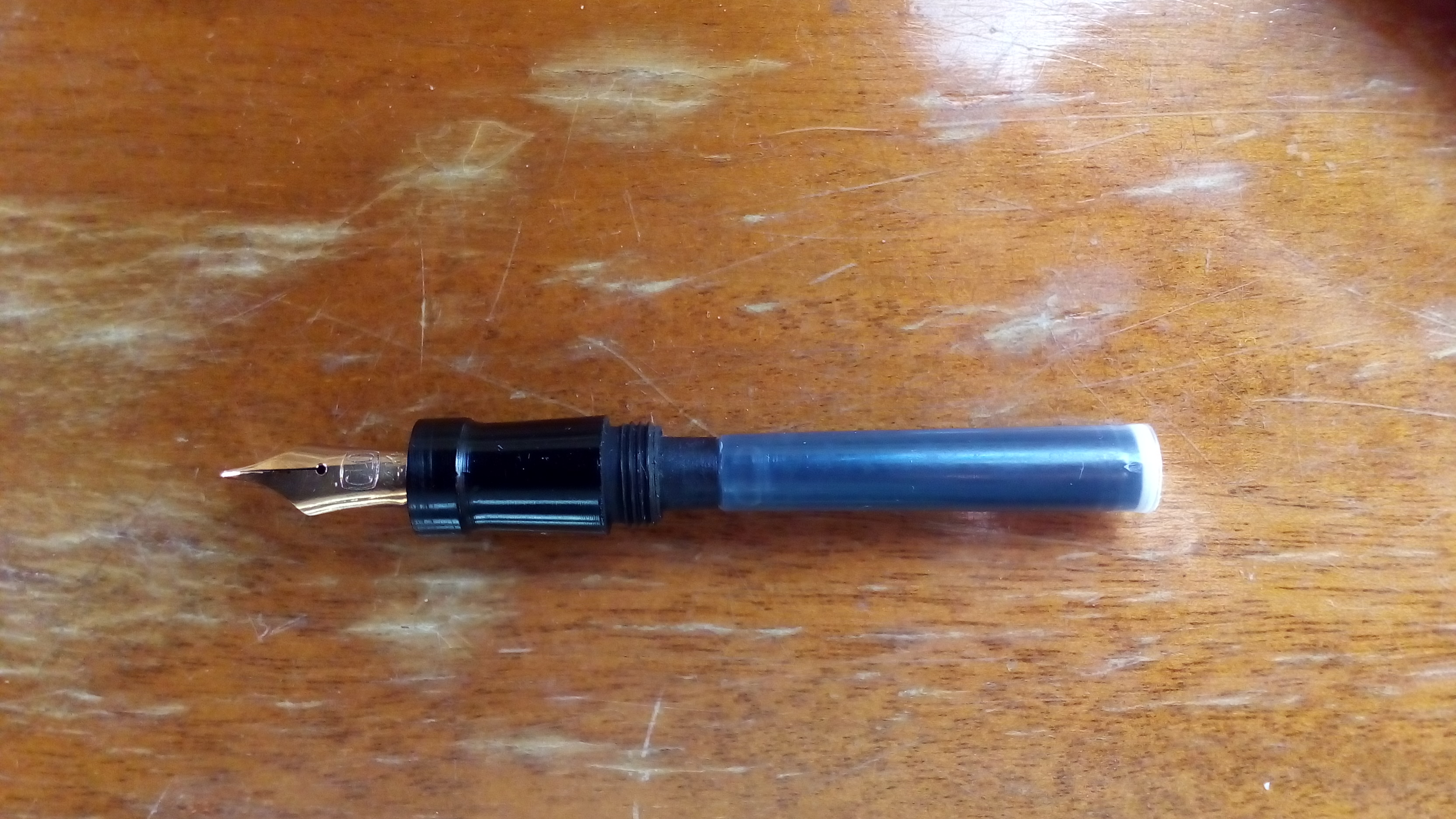 Quando ho visto che una cartuccia Pelikan entrava di misura nel foro di passaggio dell'inchiostro ho provato ad alimentarla così. Magari potrei vedere se ci posso infilare un converter, ma temo di no, il corpo della penna credo sia troppo corto. Per ora con l'inchiostro delle cartucce Pelikan nere fa un po' fatica, ogni tanto il flusso si interrompe e bisogna aspettare qualche minuto che l'inchiostro torni a scendere, e poi si riprende. Ho letto però che il nero Pelikan è parecchio denso. Magari potrei provare a riempire una cartuccia con un inchiostro più fluido e vedere come va.