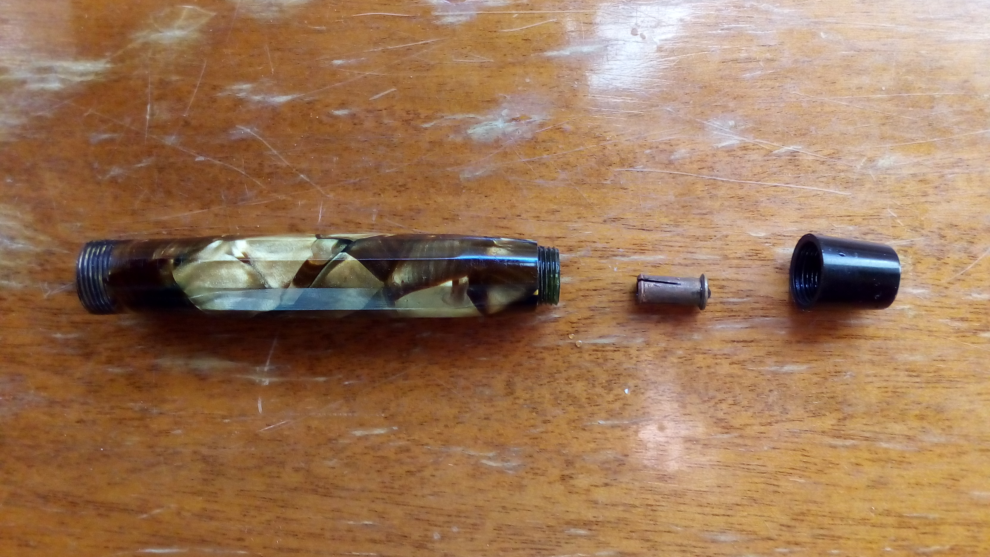 Ah, ecco spiegato il mistero del funzionamento di questa penna. Credo che Il sacchetto di gomma sia uscito dal corpo della penna sotto forma di briciole non più grandi di una formica. Pensavo fossero incrostazioni di inchiostro, ma mi sembravano un po' grandicelle. Della striscia di metallo che comprimeva il sacchetto nessuna traccia. Immagino sarà difficile procurarsi i sacchetto e levetta. Più che altro il sacchetto, la barretta di compressione si potrebbe anche ricostruire, con un po' di pazienza, facendo qualche prova.