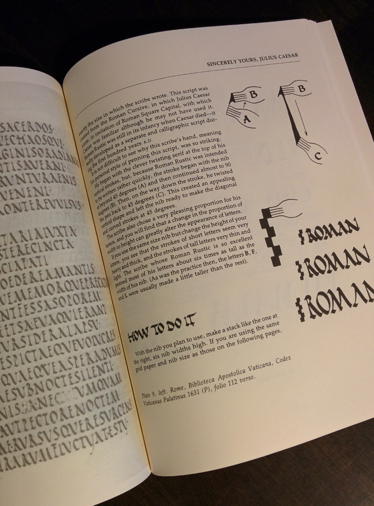 Seguono poi i capitoli dedicati ai vari stili, ogni stile e' associato ad un personaggio (reale o leggendario) che permette all'autore di dare qualche cenno sul periodo storico. Si parte quindi da Cesare (stile Romano Rustico), poi Re Artu' (Onciale), segue Carlo Magno (Carolingio) e si chiude con Robin Hood (Gotico). Per ogni stile l'autore da' qualche cenno sull'evoluzione della calligrafia e sul continuo oscillare tra la semplicita' necessaria alla scrittura veloce e la ricercatezza nelle complicazioni che aumentano l'eleganza.