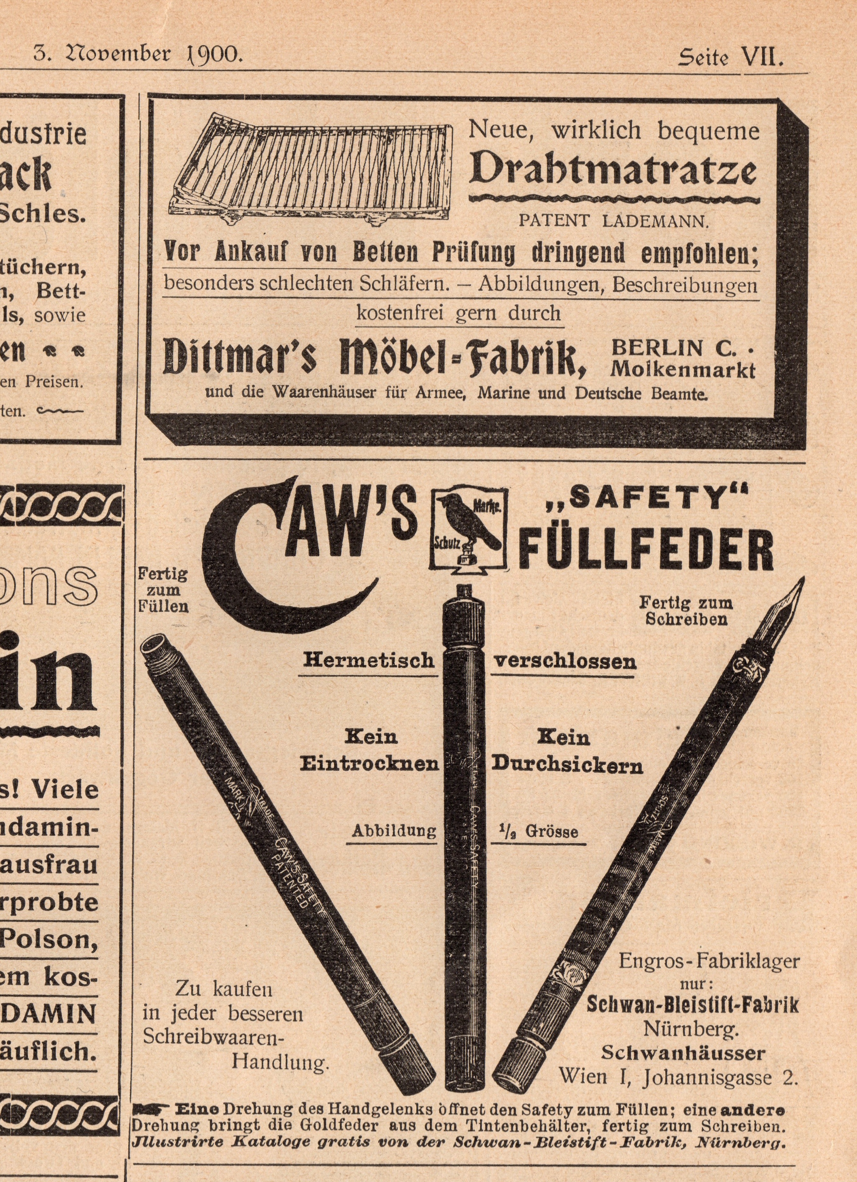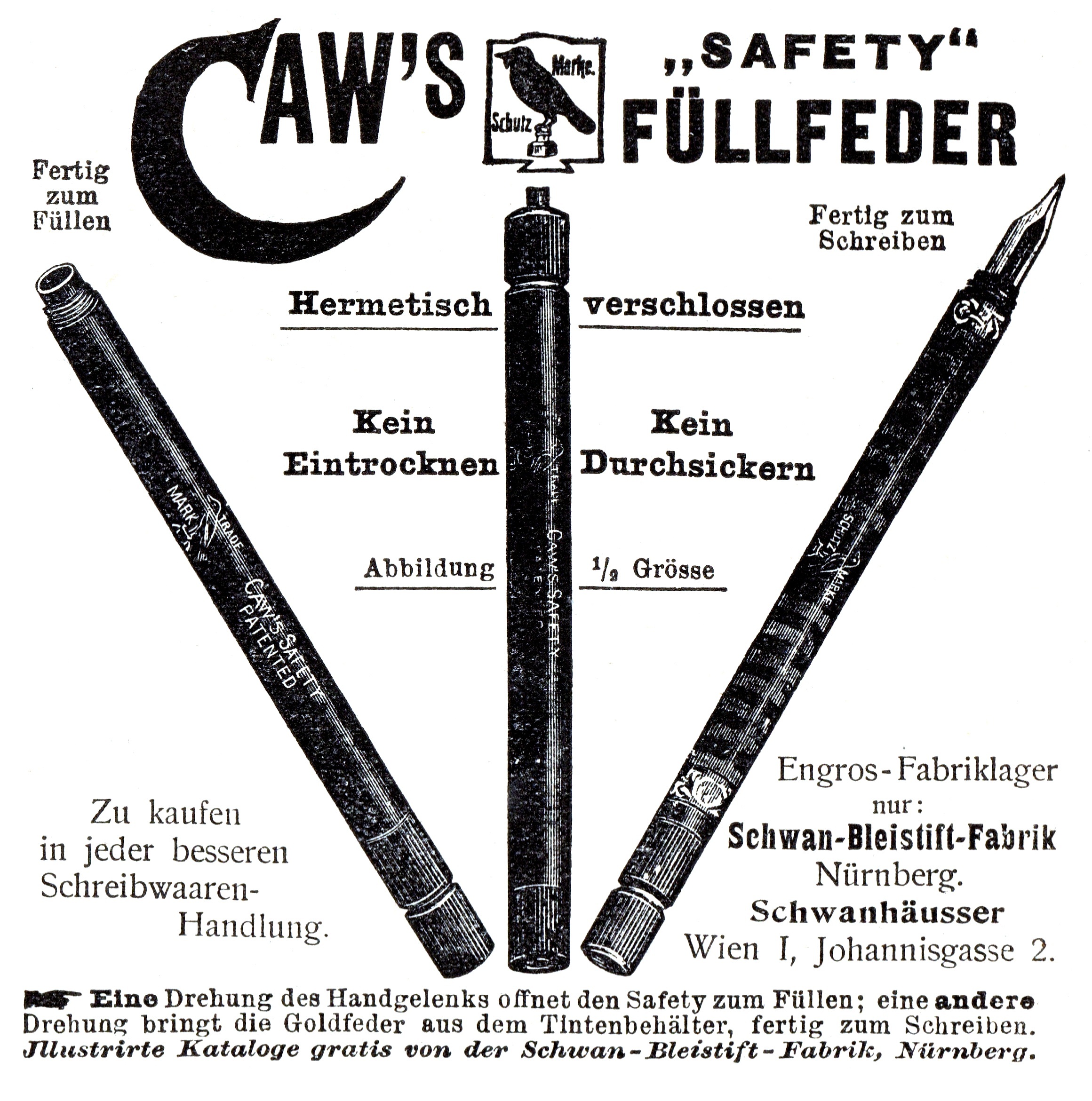 La Caw’s (che forse per richiamare il nero dell’inchiostro aveva adottato come marchio l’immagine di un corvo e come nome il suo verso, “il gracchiare” to caw, appunto) chiuse i battenti già durante la prima Guerra Mondiale, ma le sue penne sono oggi molto ricercate dai collezionisti.