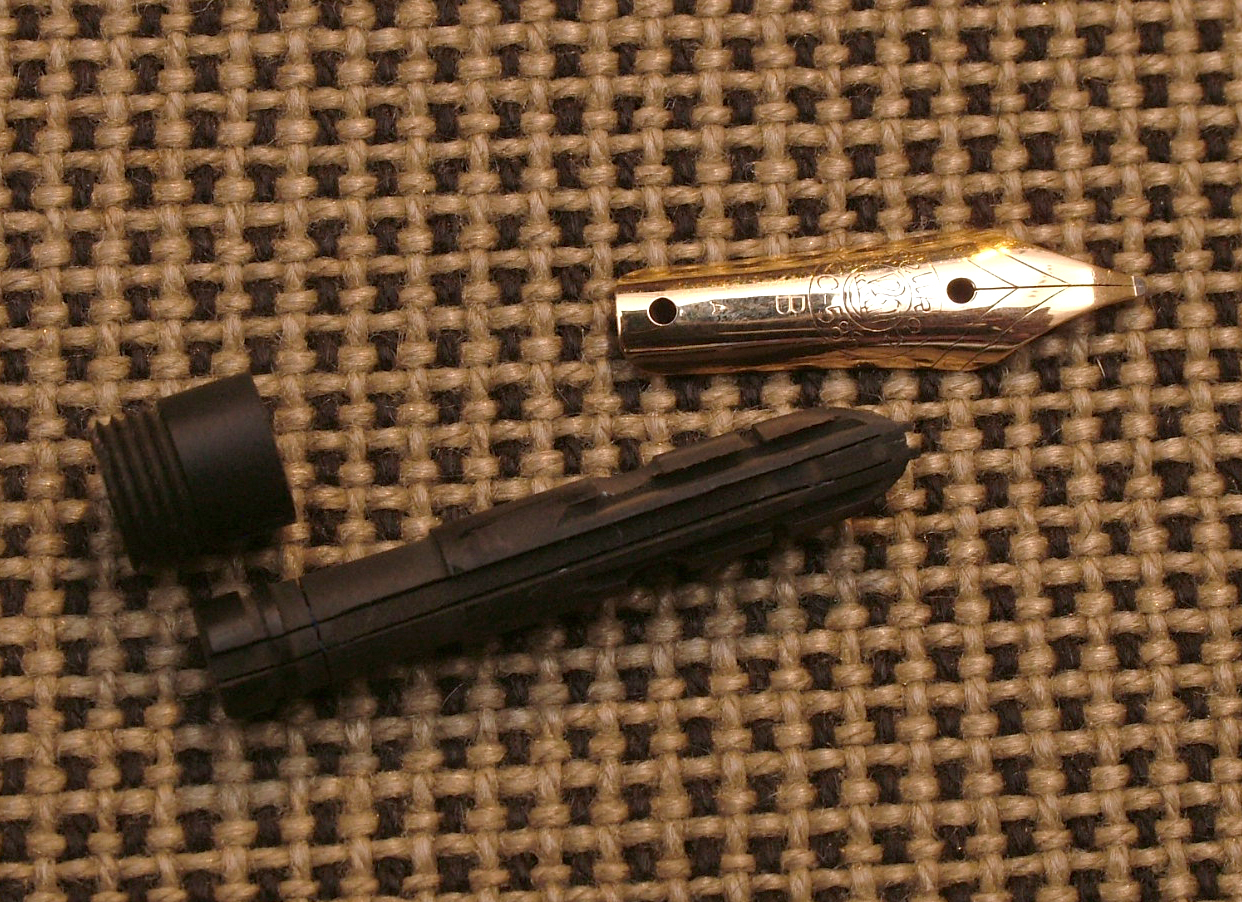 Questi è composto dal pennino e dall'alimentatore tenuti insieme da una fasctta filettata per avvitarla nella sezione. Per separare le parti spingere l'anello nella parte opposta al pennino.