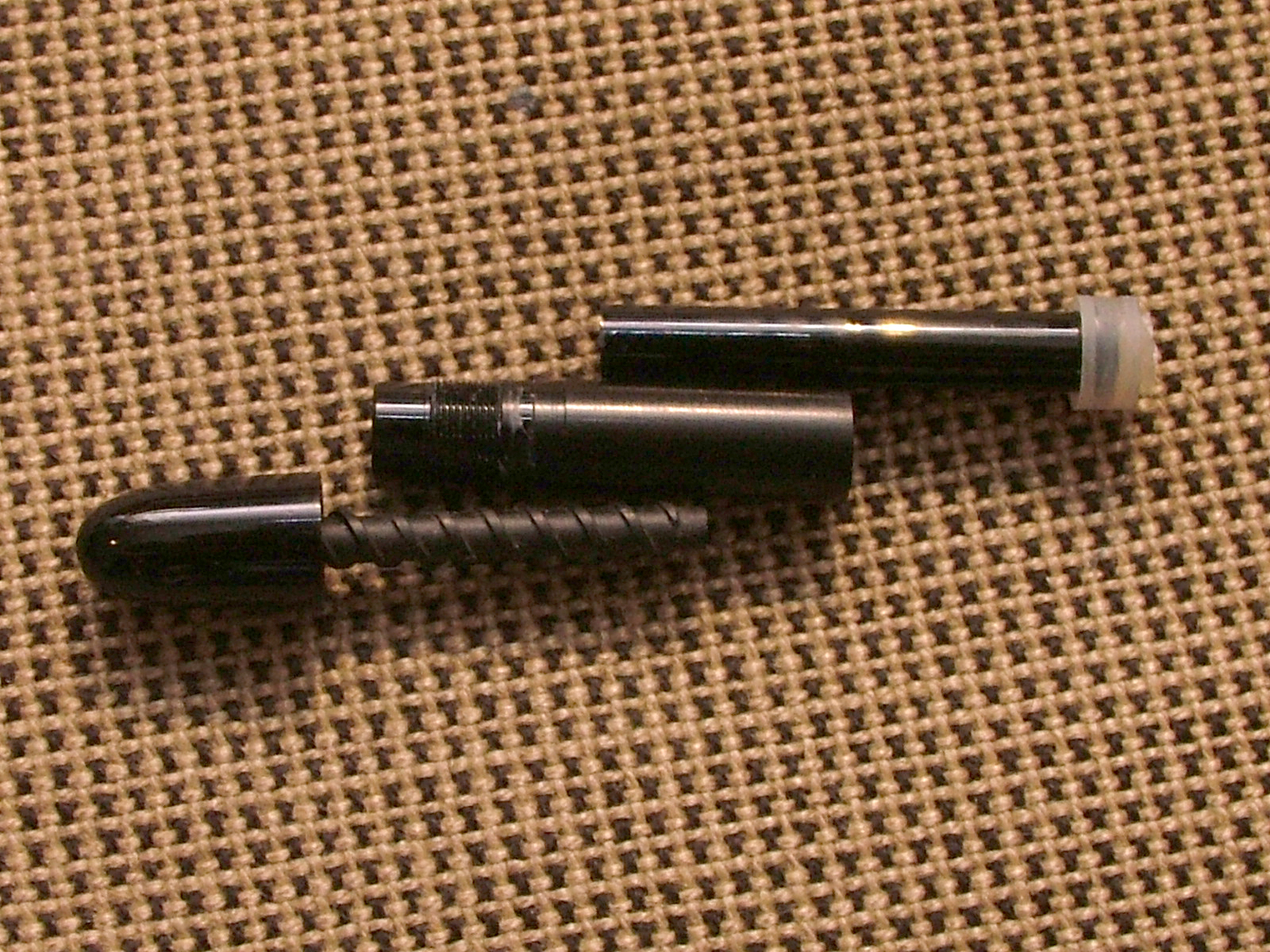 Dalla parte anteriore dal foro in cui si avvitava il pennino,si deve infilare un bastoncino di metallo con punta superiore ben levigata, io uso un bastoncino di legno,l'importante è che sia della grandezza giusta del foro interno della sezione, deve entrare ma non ballarci.