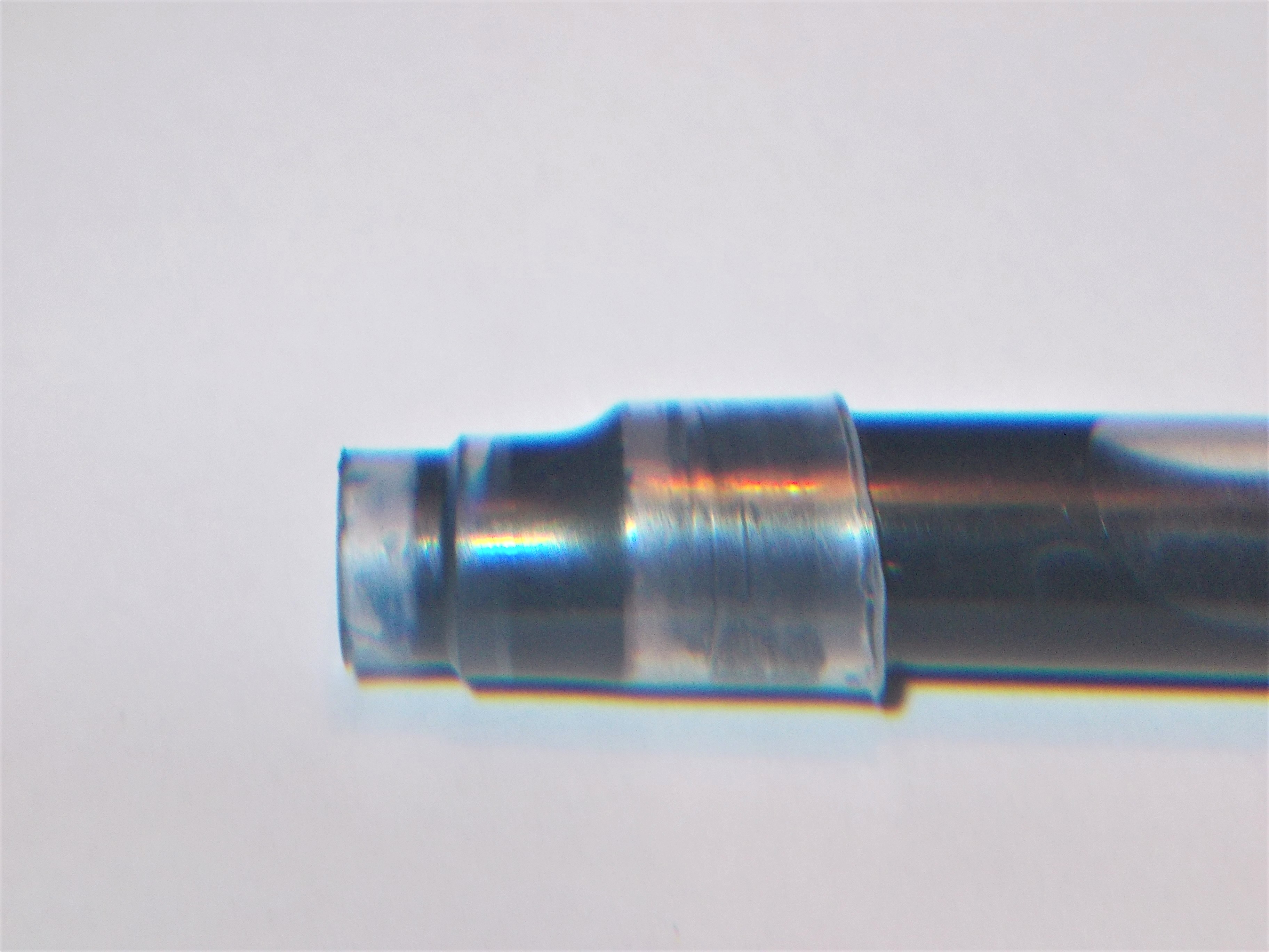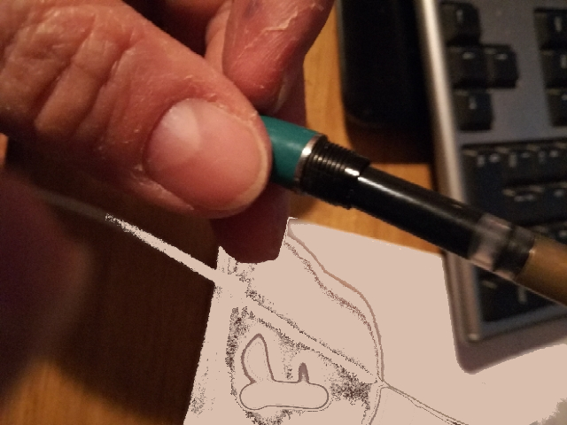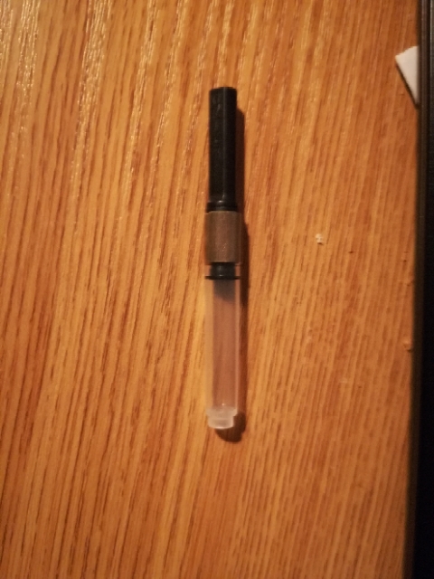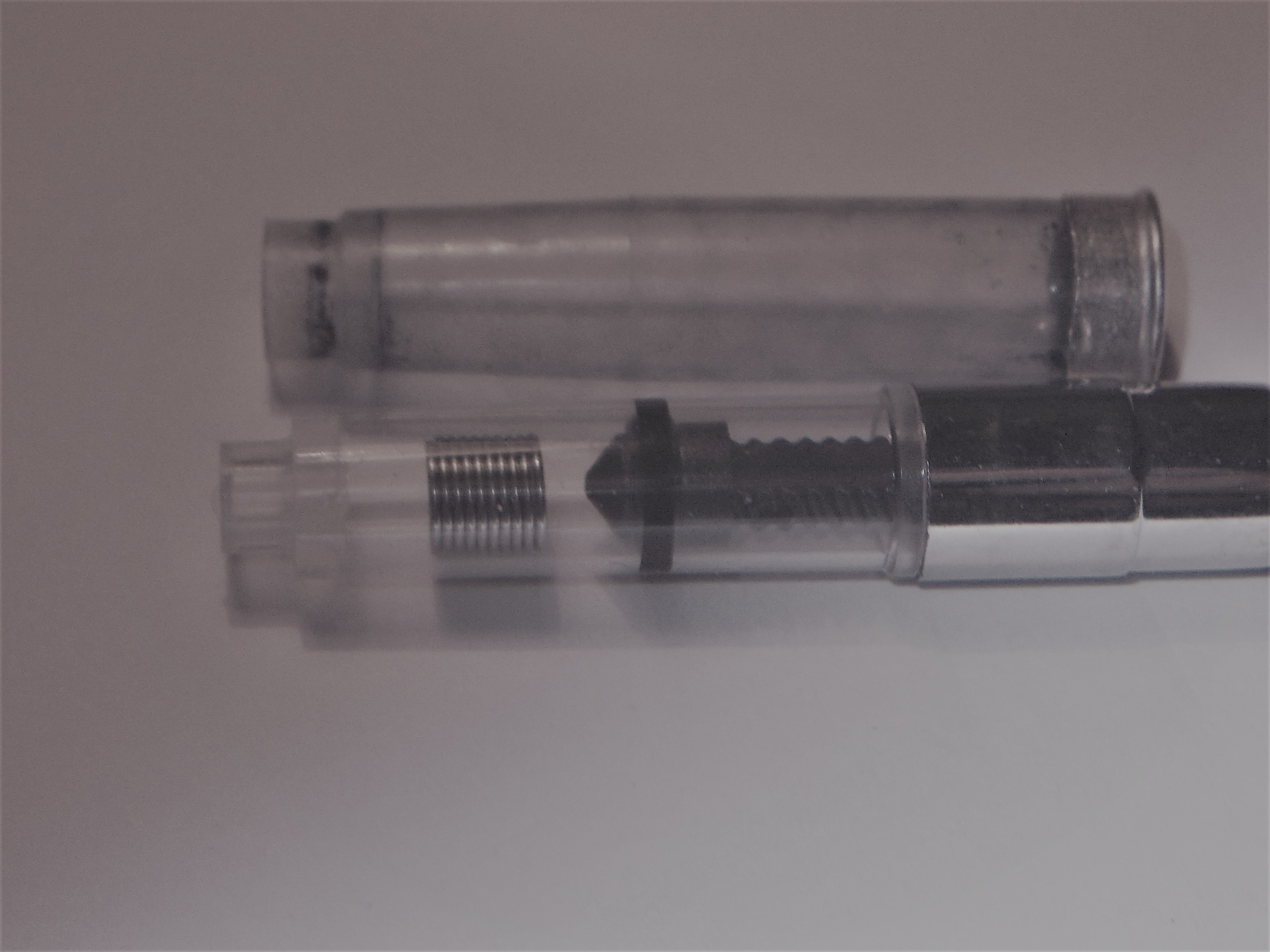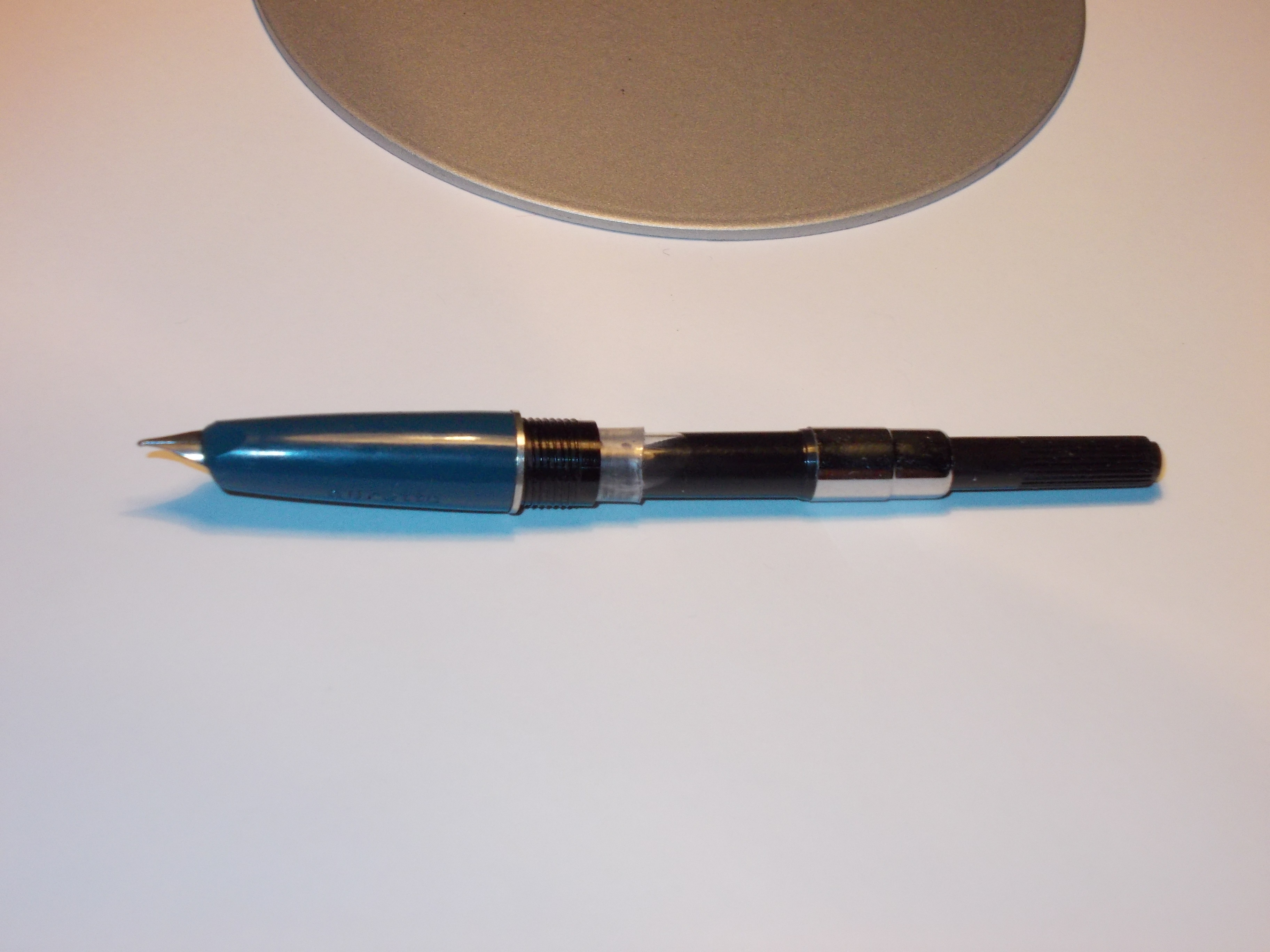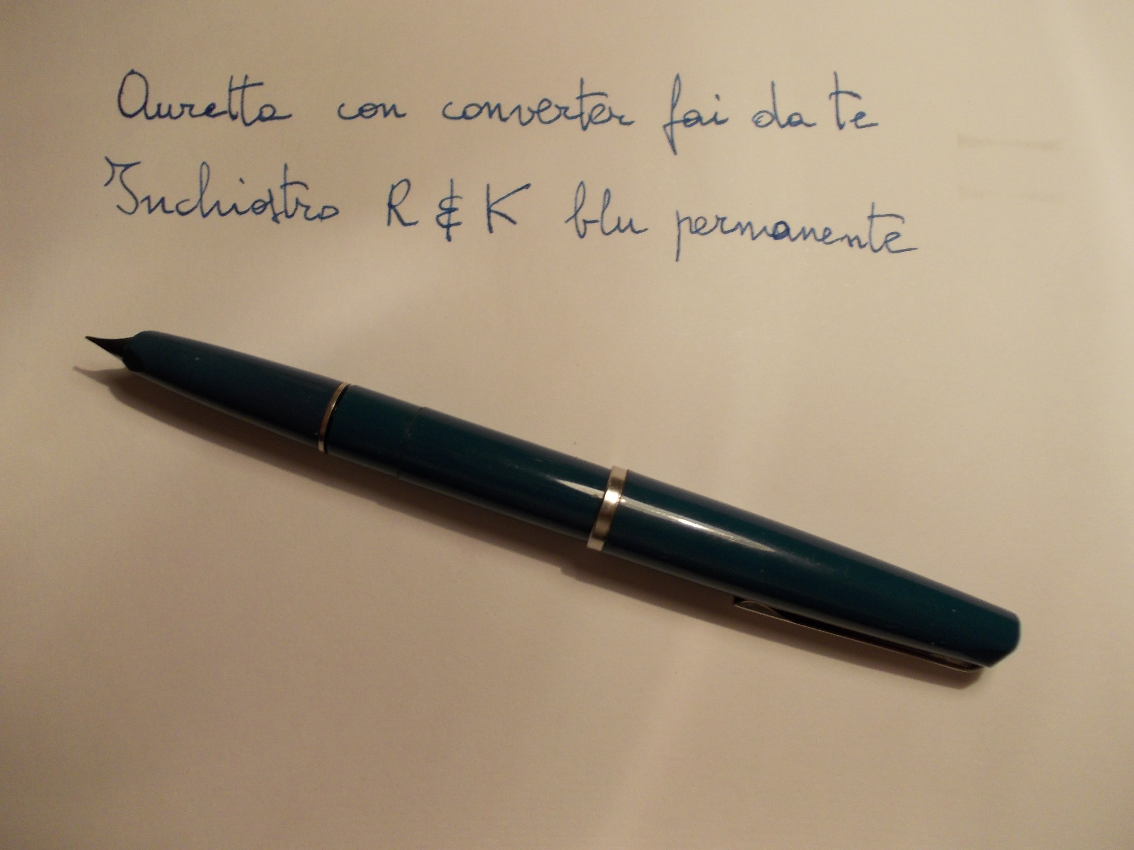 Se osservate la cartuccia notate che c'è una parte cilindrica raccordata a una parte tronco-conica, quest'ultima a cm 1,5 dalla punta. Tagliate la cartuccia alla base della parte tronco-conica con una taglierina, badando bene di fare un taglio netto. La parte della cartuccia con l'attacco alla penna sarà un po' più larga della punta del converter. Potete tagliare il pezzettino di plastica che chiudeva la cartuccia, se vi riesce e non danneggia l'attacco. Infilate ora il pezzo di cartuccia sul converter, dovete forzarlo un po', ma alla fine si posizionerà sulla punta del converter senza bisogna di colla. Se avete operato bene e con calma potete infilare il converter così ottenuto nella penna. Caricate lentamente il converter (è sempre un converter cinese), la penna funzionerà come se avesse un converter su misura. Terminerà così la caccia alle introvabili cartucce "vintage" quasi asciutte e l'Auretta sarà sempre un mezzo chiodo, ma non vi costringerà a ricerche su internet quasi sempre inutili