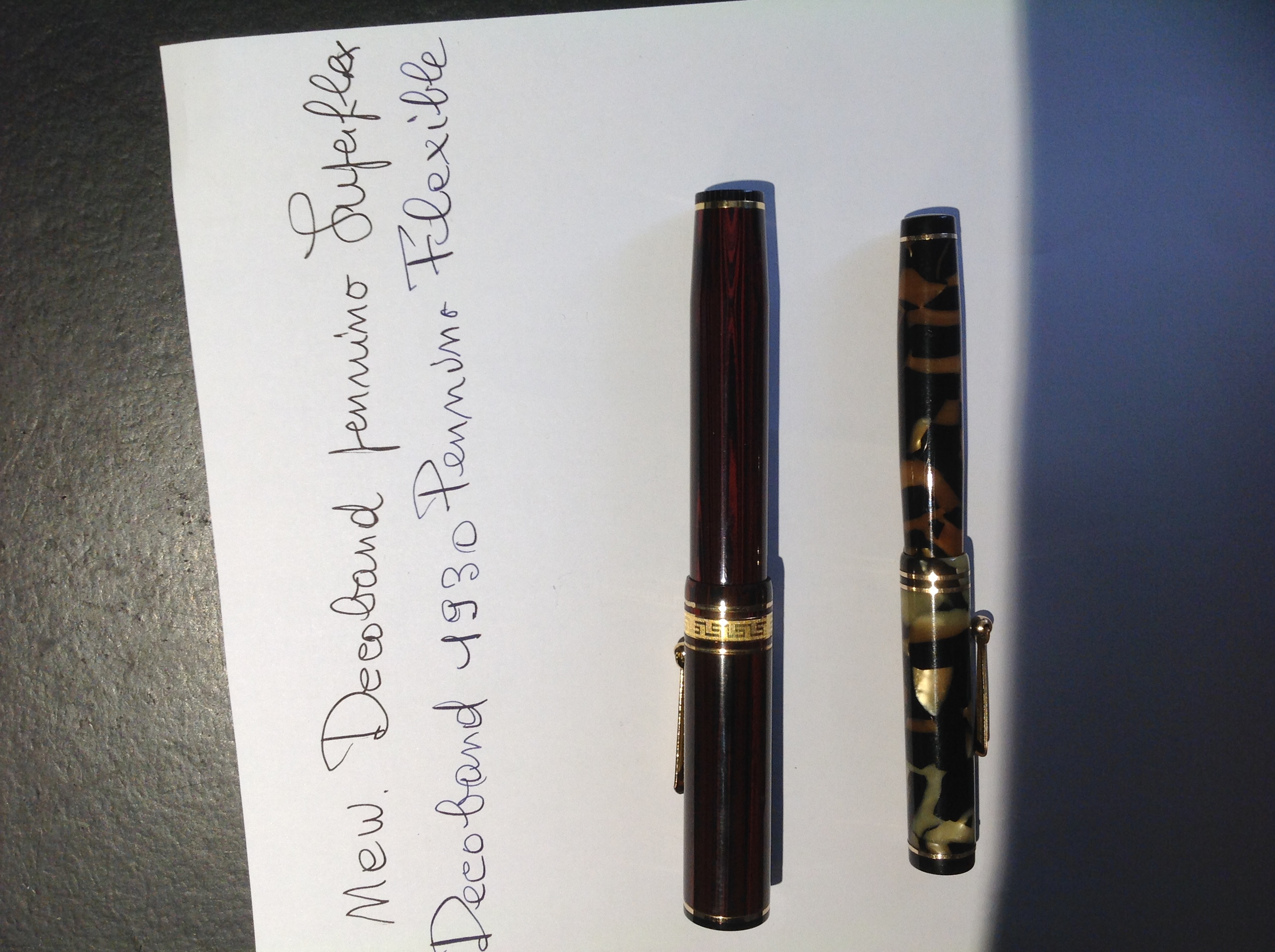 Ho comprato ,con qualche complesso di colpa per le numerose stilografiche acquisite con gli anni la nuova decoband rosewood.negoziante serio,gentile e preparato. Ho aspettato molto perché volevo un pennino superflex e non goldflex.Dopo un paio di mesi la penna e' finalmente arrivata. Il pennino superflex abbastanza flessibile dopo poche righe cessava di scrivere. L'ho rimandata indietro. Dopo un mese e mezzo il pennino era stato "corretto" , ma ho richiesto un pennino nuovo perché il flusso di inchiostro si era ridotto. Nessun problema per il negoziante sempre molto corretto e gentile? Dopo altri due mesi sono arrivati due altri pennini superflex il primo sconsigliato dal negoziante per scrittura non perfetta, il secondo un po' meno flessibile , ma che scriveva bene. Tuttovero