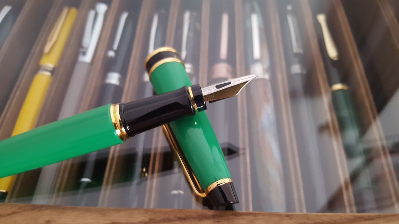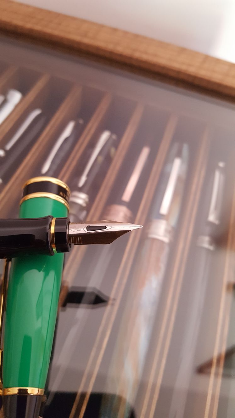 Si tratta di una penna antica, credo anni '90, colore verde, con un pennino non arrotondato bensì squadrato/sfaccettato.