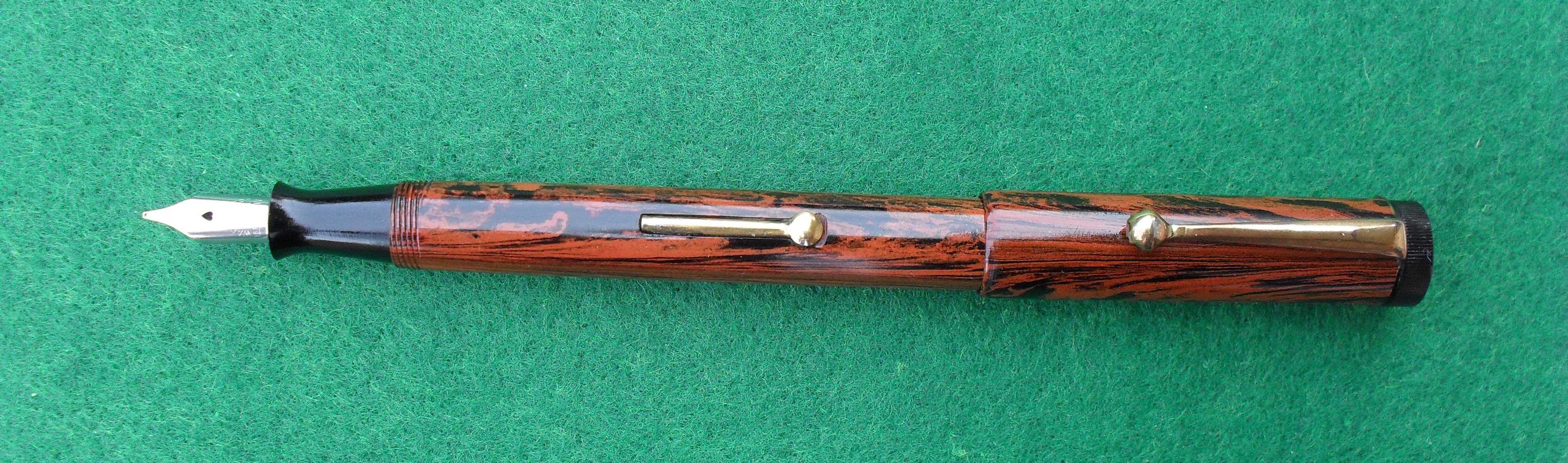 Tutti i componenti principali sono in ebanite. Fanno ovviamente eccezione la clip e la levetta, oltre al pennino in acciaio, marcato “Warranted 1st quality” e , più in basso, "M", evidentemente per la misura del pennino, e "Made in England". Purtroppo la penna non fu pulita bene dopo l'ultimo utilizzo ed un po' d'inchiostro ha corroso la parte inferiore del pennino: