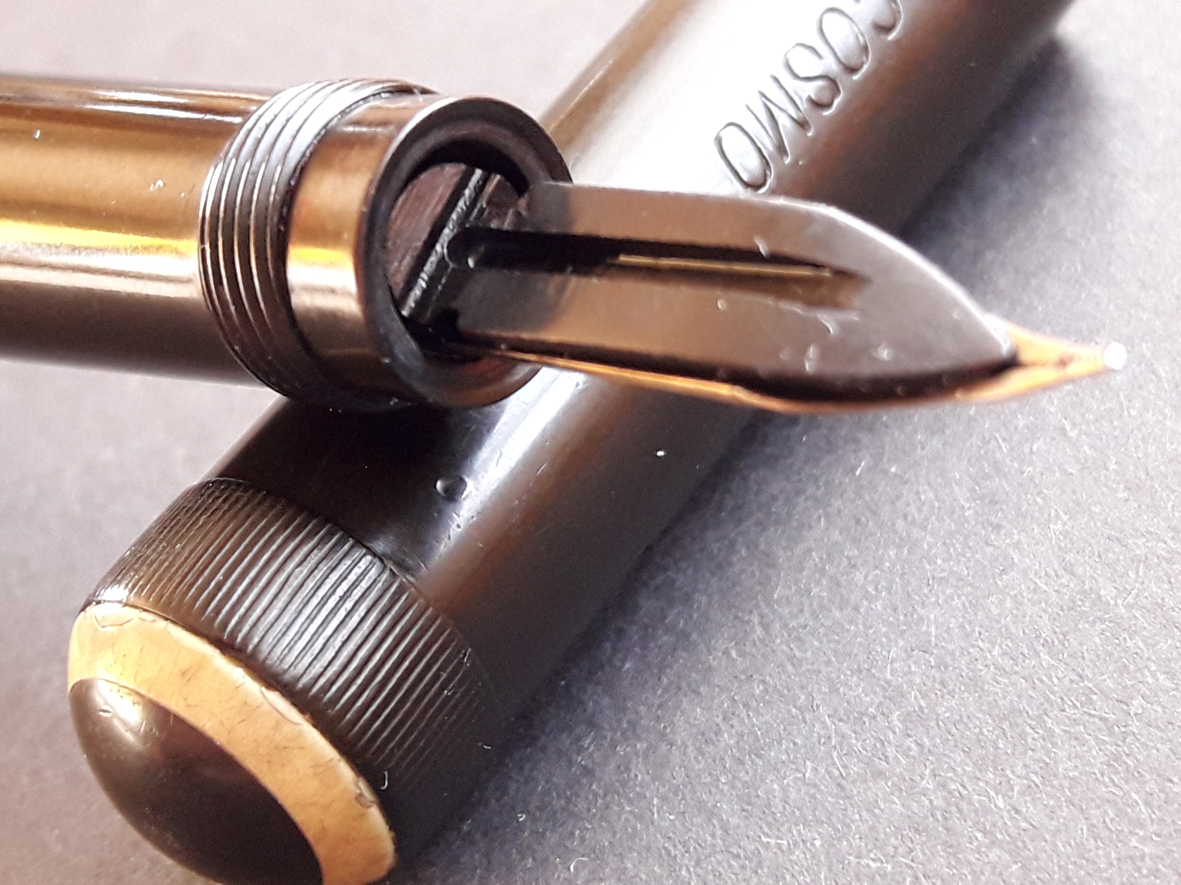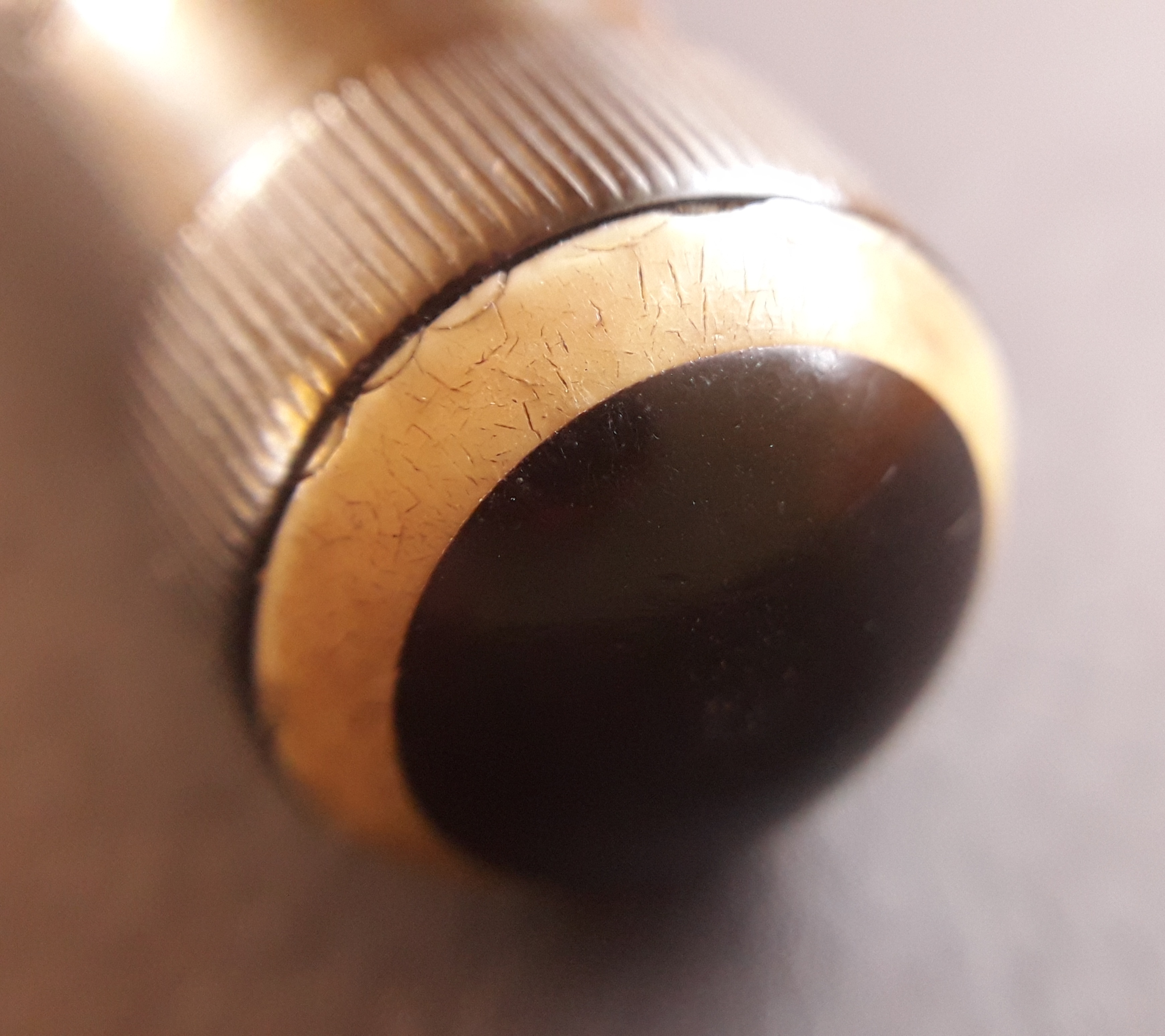 Mmmm… Quando c’è la scanalatura sull’alimentatore, ci deve essere anche lo spillo d’argento all’interno del cappuccio, solidale alla testina svitabile, ma qui all’interno non lo vedo: se lo sono rubato…