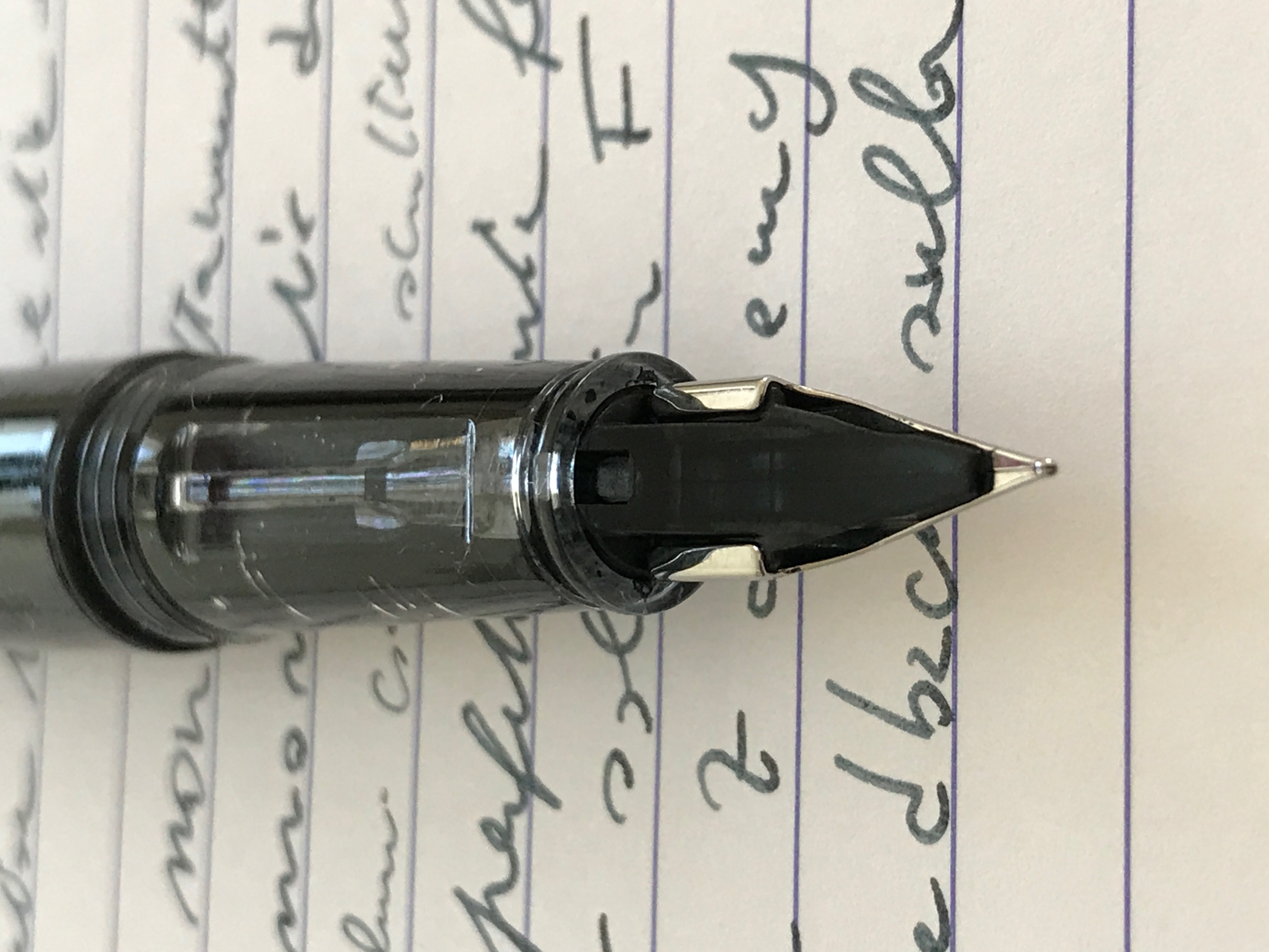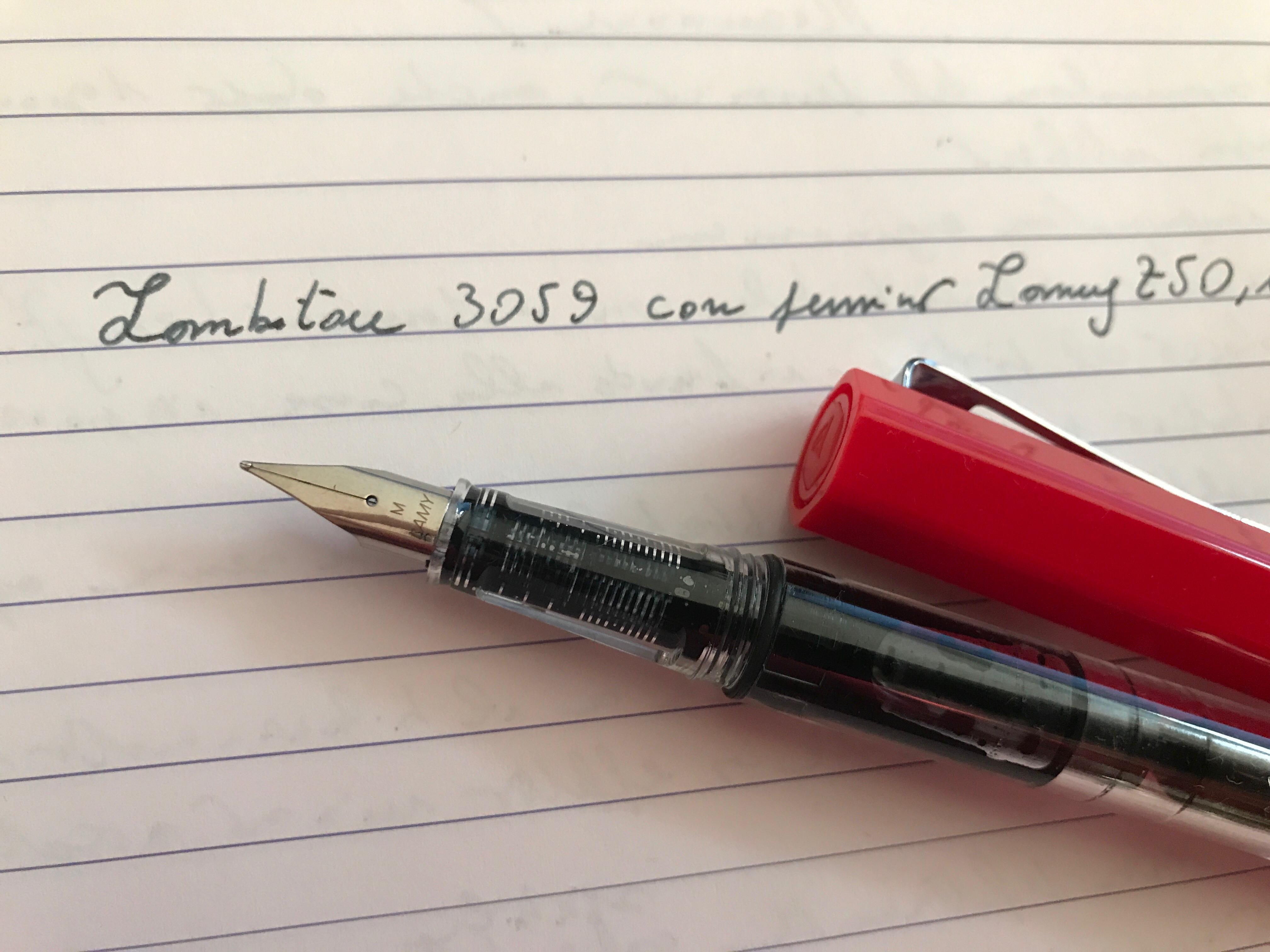 L'altro giorno mi sono Ieri mi sono dimenticato di aggiungere una foto della Lanbitou 3059 con il pennino Lamy Z50, tratto M: anche in questo caso ho dovuto restringere leggermente (e con cautela) l'imboccatura del pennino per farlo calzare perfettamente sull'alimentatore.