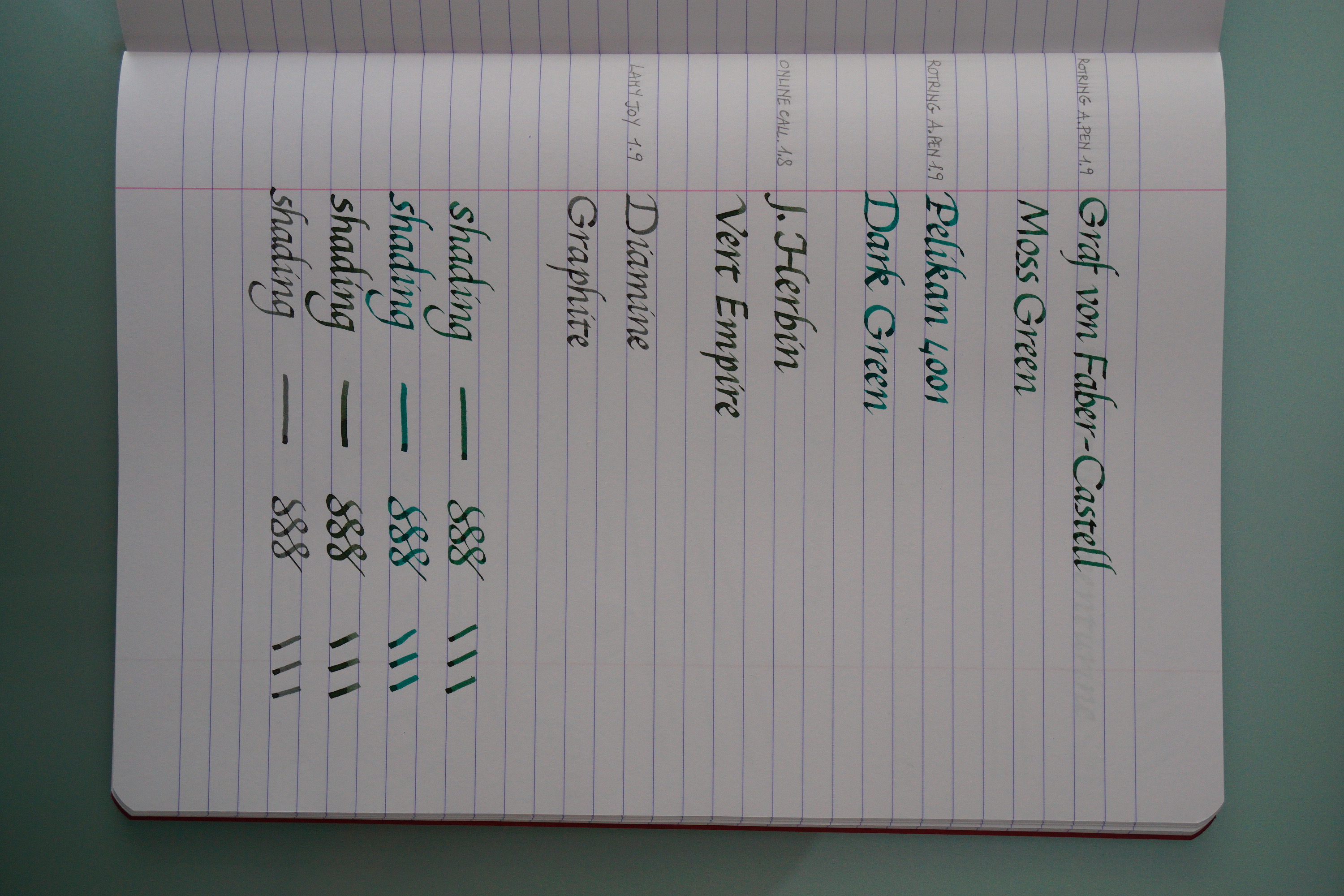 Ho fatto alcune prove per valutare lo shading degli inchiostri in mio possesso, iniziando dai verdi (incluso anche il Diamine Graphite, l'unico in boccetta). Non potendo inchiostrare più di quattro penne (con pennino simile) contemporaneamente, per la valutazione mi sono basata anche su scritti precedenti (fatti quindi con altri pennini e su altre carte).