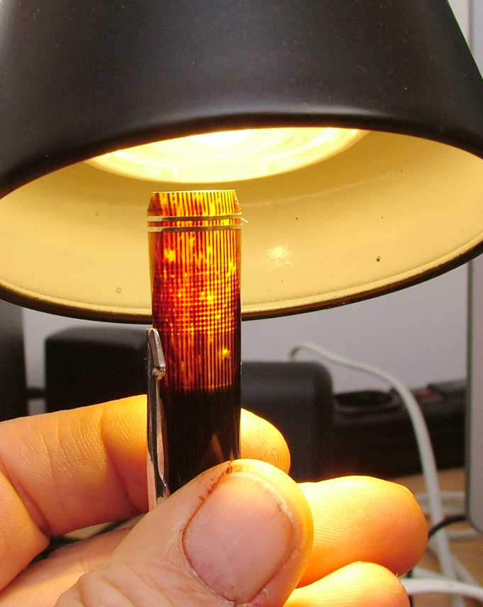 Ha una celluloide ad arco dalle bellissime sfumature, la carica è a pulsante, la clip è a freccia liscia e non è laminata oro ma argentato come del resto anche i due anellini sul cappuccio.