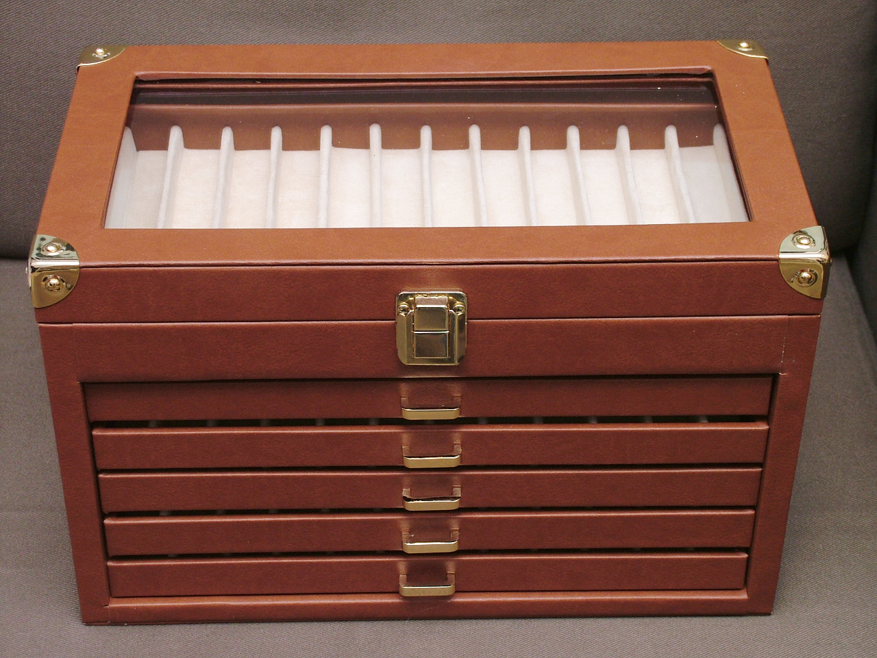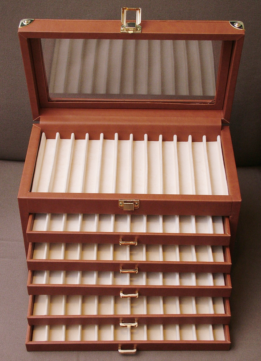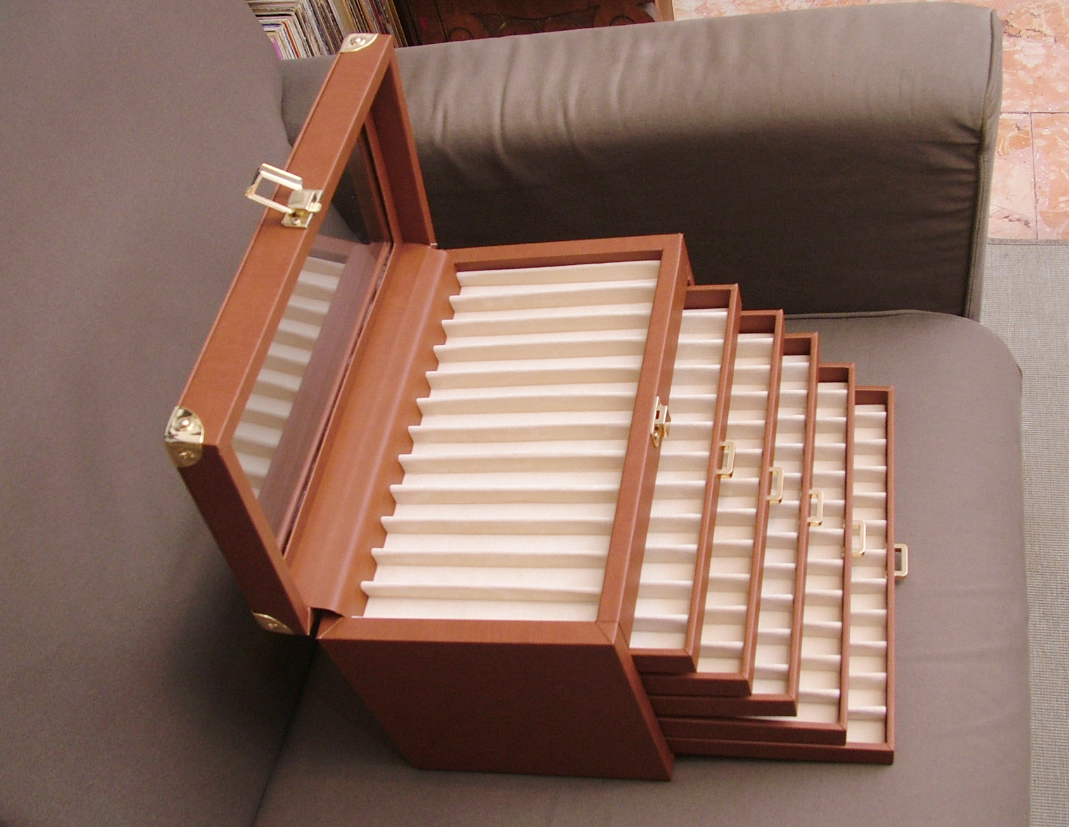 Cassettiera in multistrato ricoperta in eco pelle, colori nera o marroncina, accessori sia cromati che dorati, ottime rifiniture, anche eco pelle che copre le cerniere, bella capiente, adatta per ben 72 penne, prezzo molto concorrenziale, 48 euro + spese postali circa 13 euro o devo dire eurini? :mrgreen: