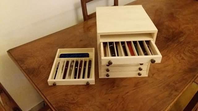 E' composta da sette cassetti (estraibili, ovviamente) da otto posti, c'è uno spazio in fondo per scatole, pennini, altre stilografiche, ecc.