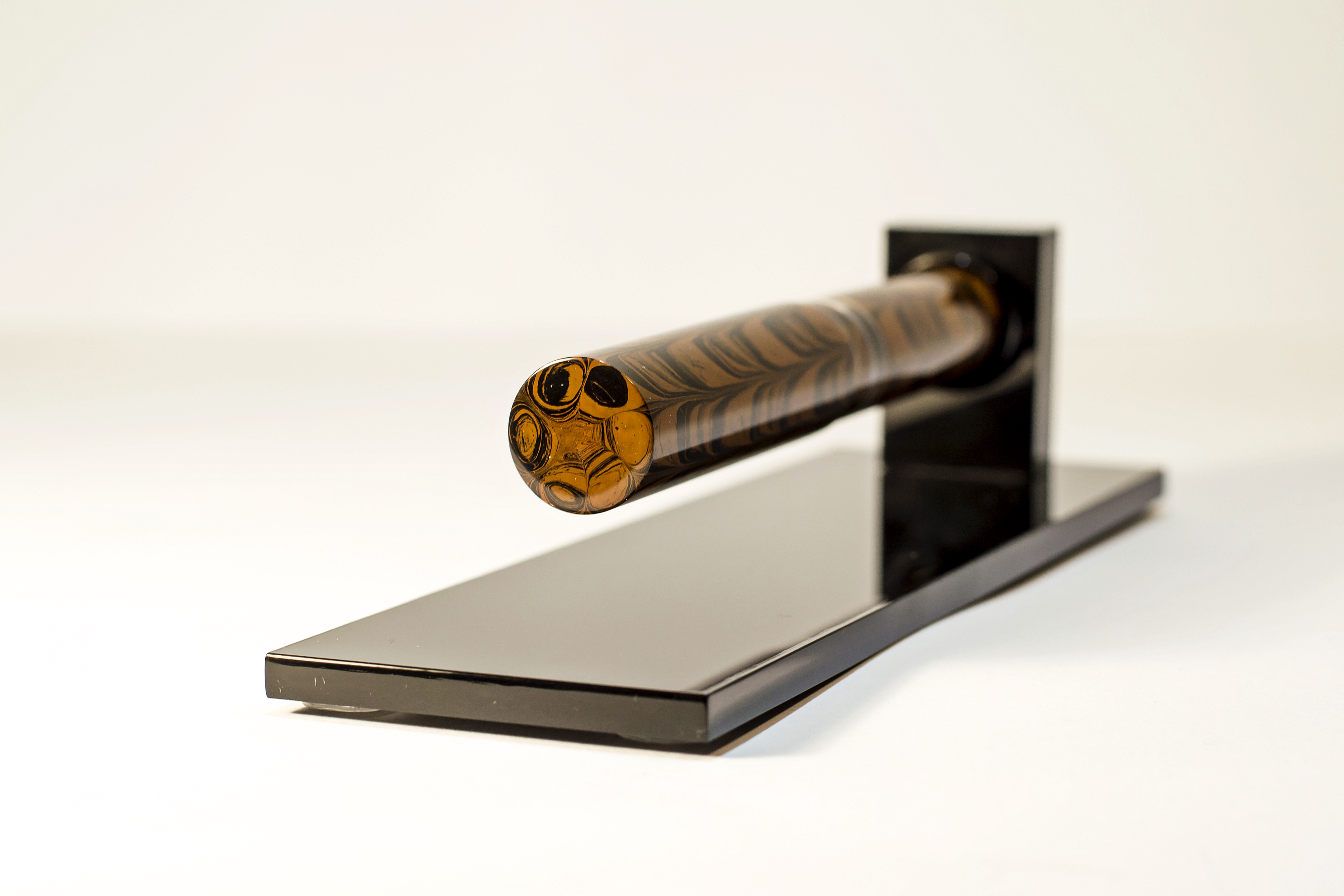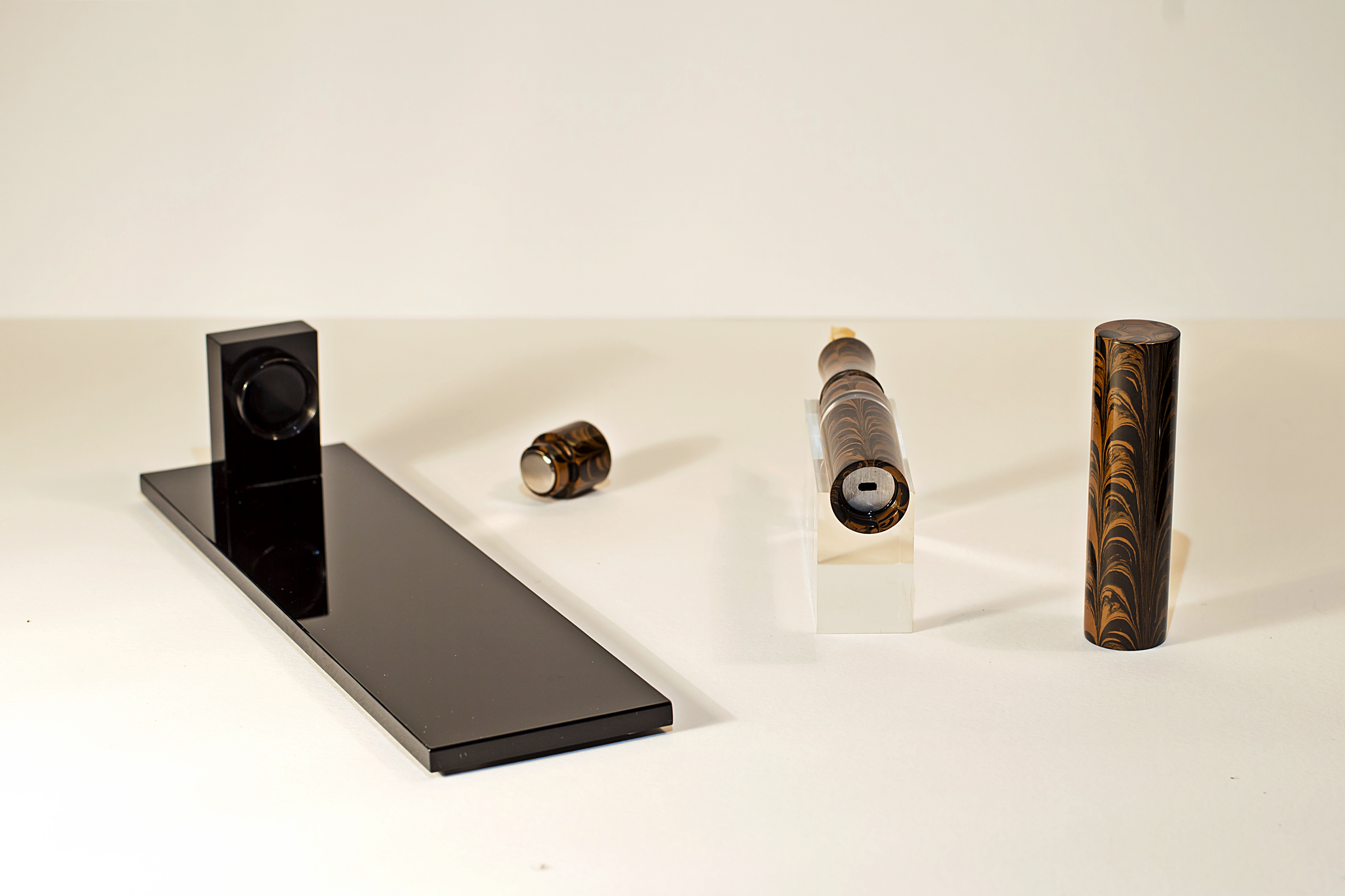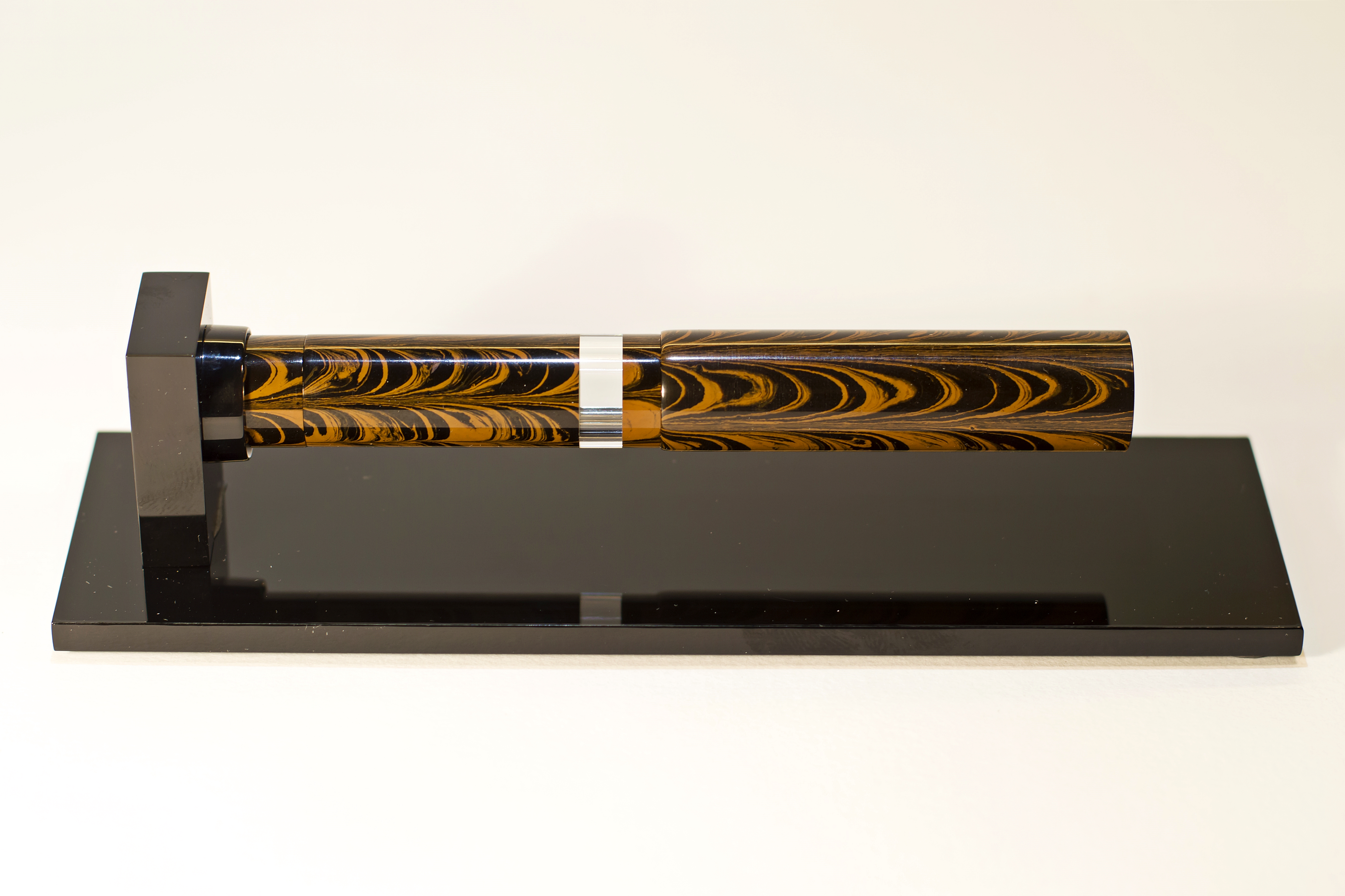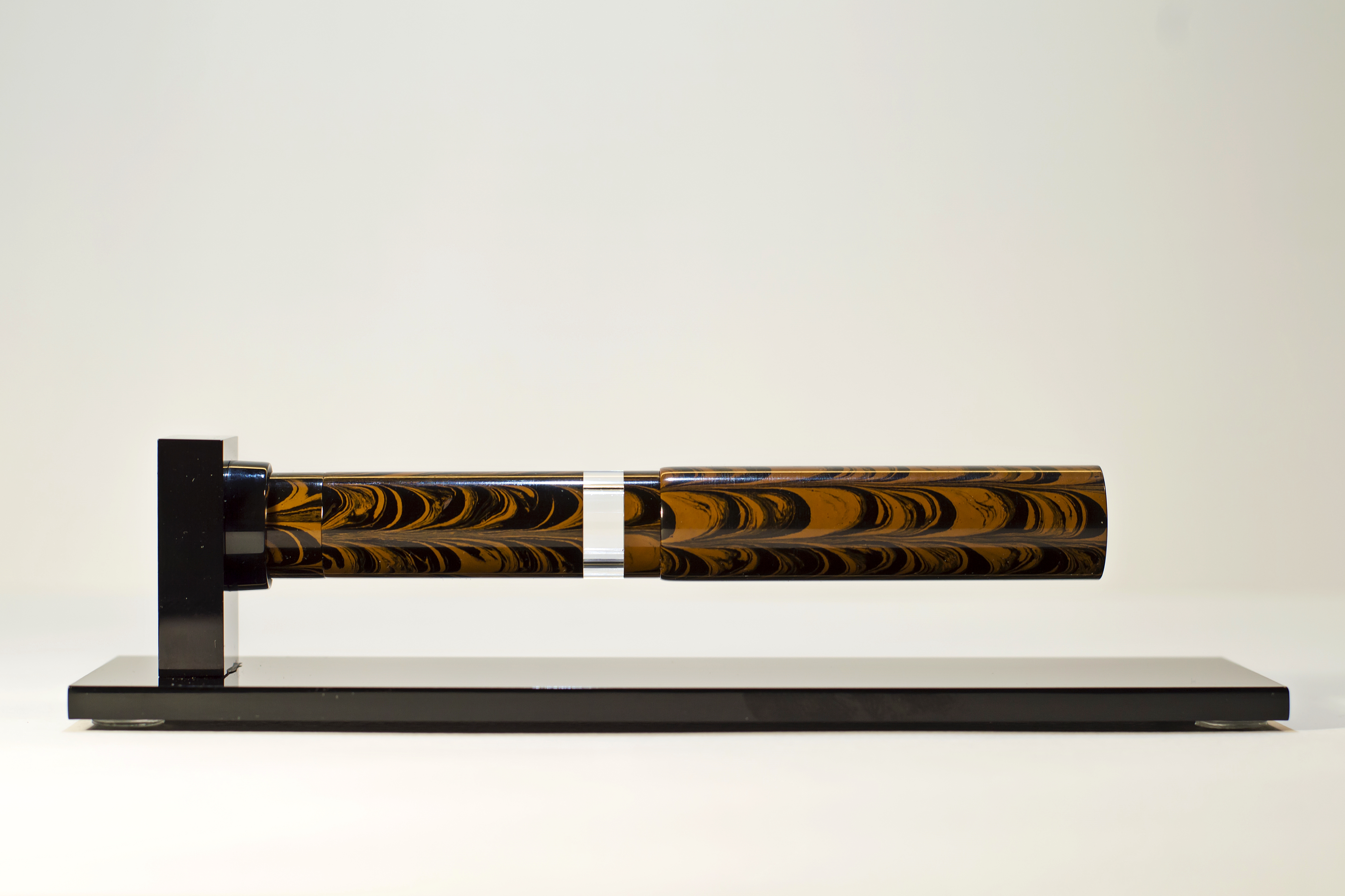 L’idea di creare un supporto è nata dal fatto che è una penna difficile da trasportare ( es. nel taschino oppure in una borsa) perché i magneti possono attirare monete,chiavi o un qualsiasi altro oggetto metallico. Quindi ho escogitato questo supporto da tavolo per avere la penna sempre a portata di mano. Come si può notare dalla foto,la penna rimane in una sospensione orizzontale quasi a sfidare la forza di gravità. Questa sospensione è dovuta dal magnetismo del fondello ( ecco il terzo scopo) e da un disco di metallo che è incorporato nel supporto, opportunamente ricoperto con un altro disco in metacrilato.