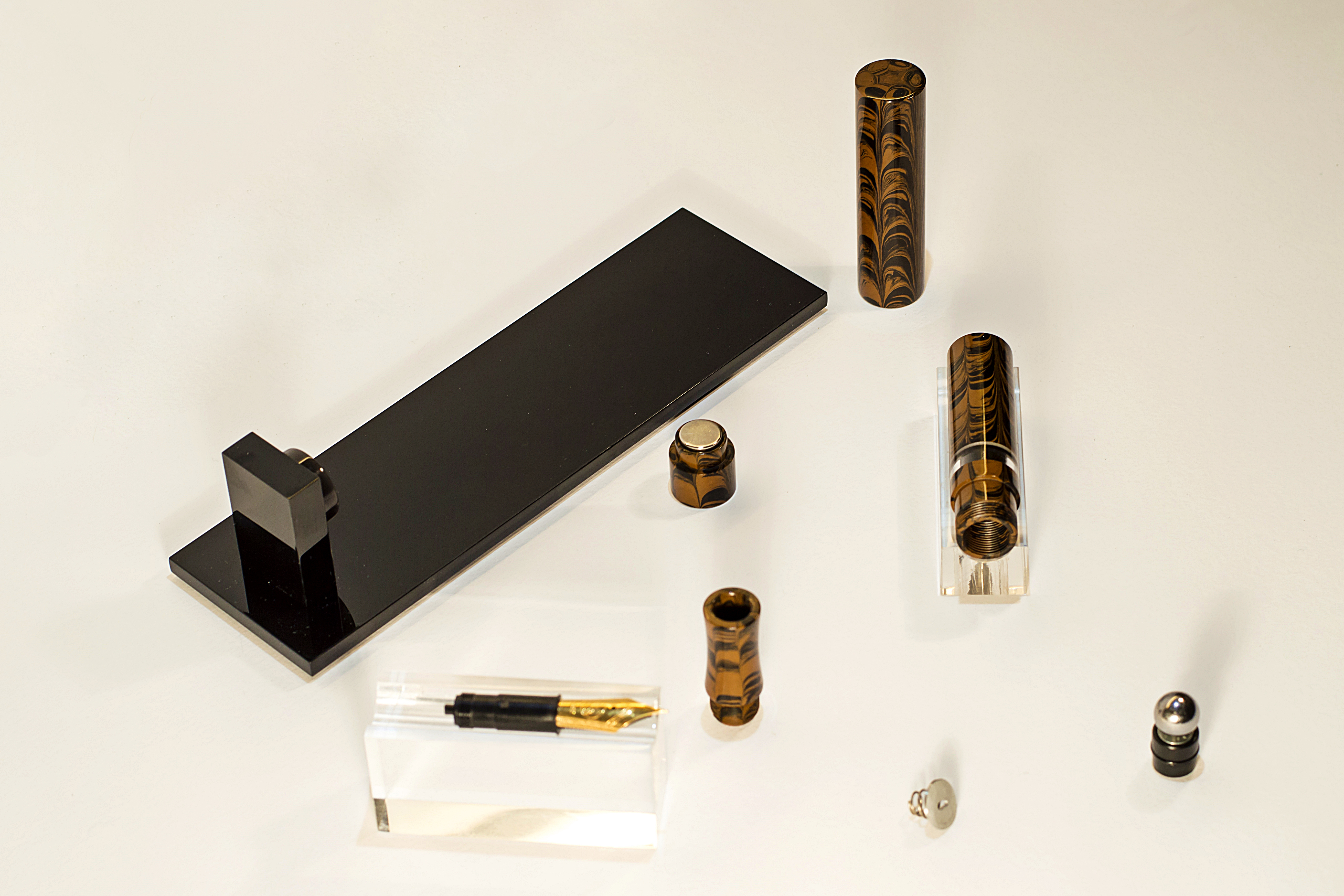 Al suo interno ho inglobato un magnete che ha un triplice scopo: il primo per bloccare(ovviamente sempre con un’attrazione magnetica) il pistone per scongiurare che si possa muovere accidentalmente con la conseguenza disastrosa di svuotare il serbatoio, il secondo per movimentare il pistone,il terzo scopo lo svelo dopo. Visto che è una penna speciale, non c’è stato bisogno di fare un fondello filettato per collegarlo al fusto,perché anche in questo caso ,neanche a dirlo,ho sfruttato la potenza dei due magneti con un semplice accoppiamento maschio/femmina.