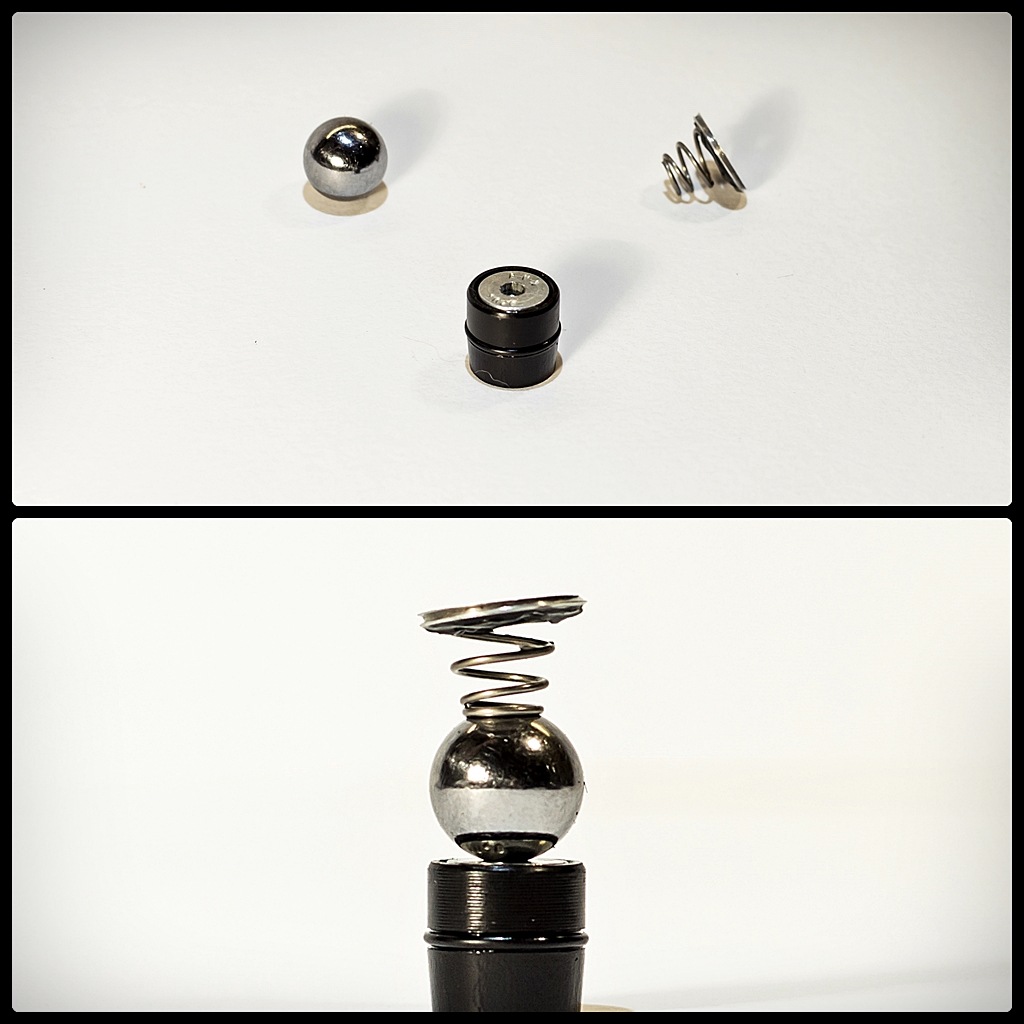 (2) avvicinare il magnete del fondello lungo il fusto della penna all’altezza della sfera, così facendo i due magneti si attraggono in un attimo, per ammortizzare la loro potenza bisogna interporre i polpastrelli del pollice e del indice davanti al magnete. Un aspetto tecnico degno di nota è che la sfera non è solidale con il pistone, quindi può girare su se stessa,così quando si avvicina il magnete motrice (in qualsiasi posizione sulla circonferenza della penna )il magnetismo della sfera (nord/sud) si orienta in automatico col magnete motrice.