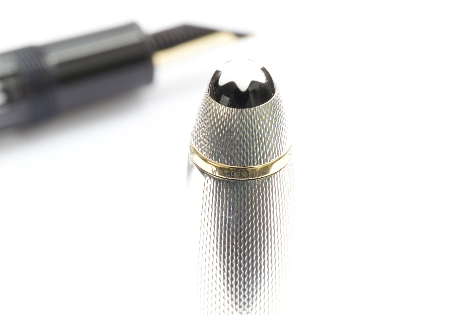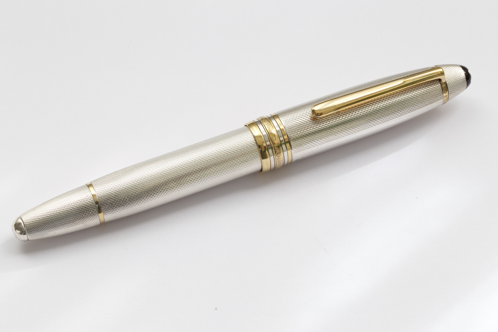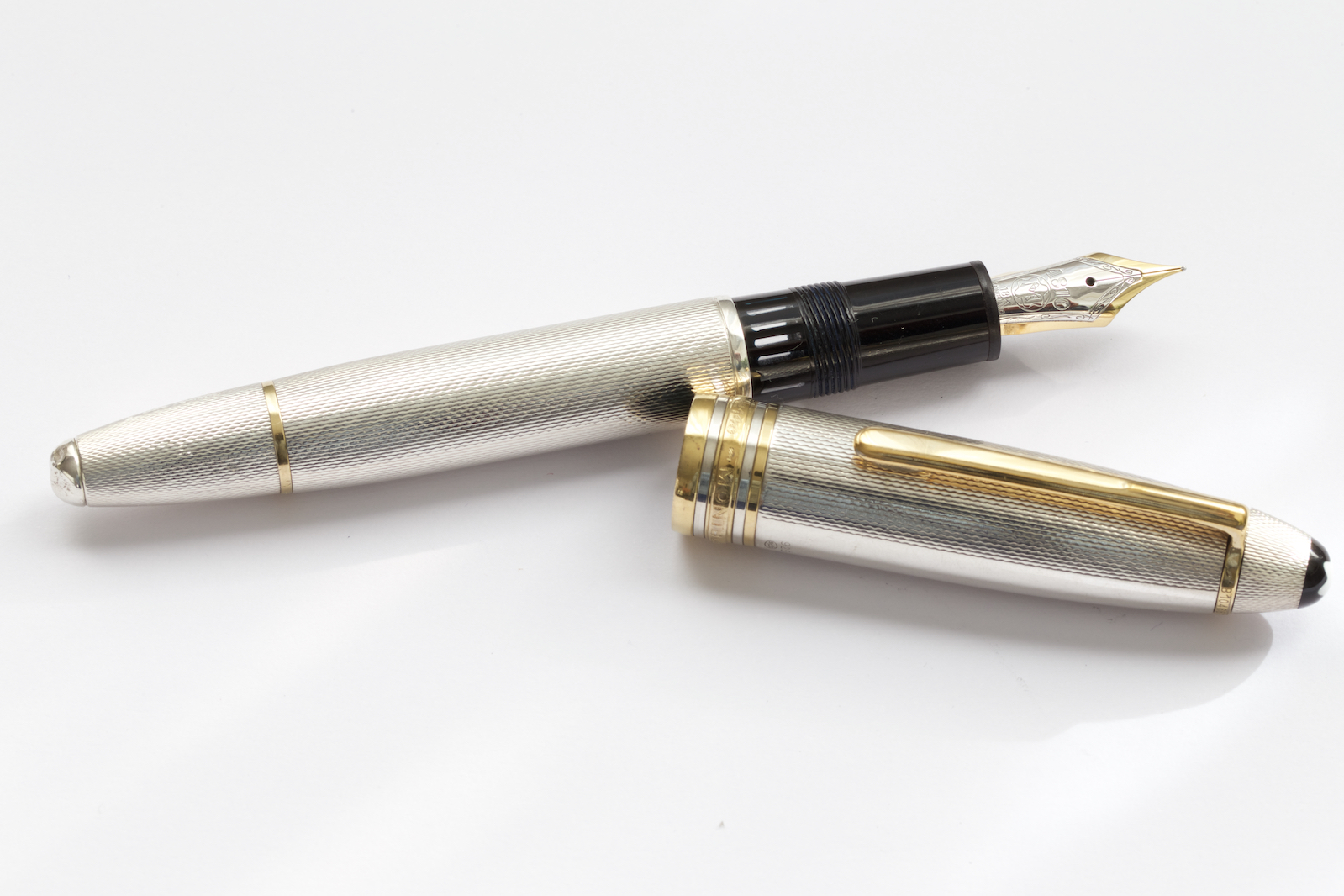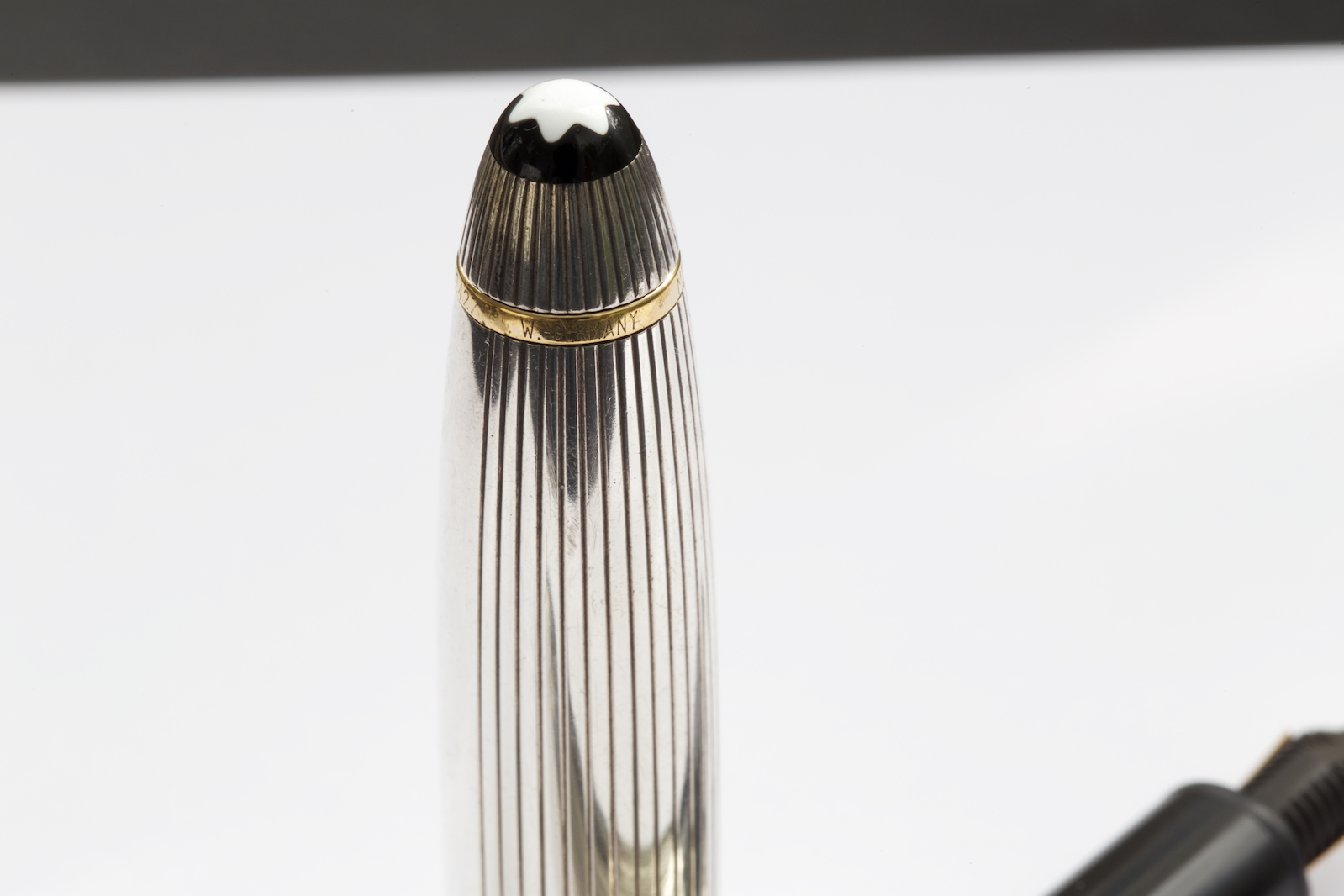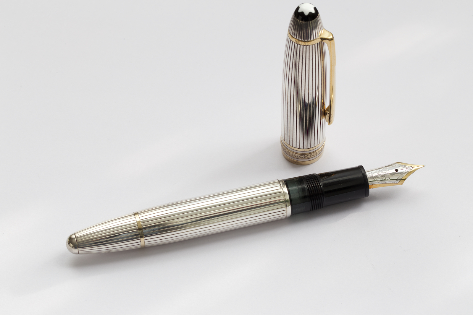 Buongiorno, non mi sono mai piaciute più di tanto le penne in metallo ma per queste due devo fare un' eccezione...Due Montblanc Solitaire Silver 146. Impugnandole da chiuse trasmettono un forte senso di solidità, il cappuccio è davvero massiccio ed è meglio scrivere senza, i pennini sono in oro 18kt. La fascetta della clip riporta in ambedue numero di serie, West Germany e Metal, sul cappuccio ci sono due punzoni. La Montblanc a righe ha alimentatore in ebanite e finestrella azzurra senza rigature mentre l' altra ha un alimentatore in plastica e finestrella con le classiche righe nere. Confrontando in rete ho visto che le West Germany potevano essere prodotte variabilmente in queste due versioni. Naturalmente non ho resistito e sono in questo momento inchiostrate, la scrittura è fluida e molto piacevole, il tratto della rigata è un extra fine/fine mentre la Barley(si chiama così?) ha un tratto fine abbastanza corposo.