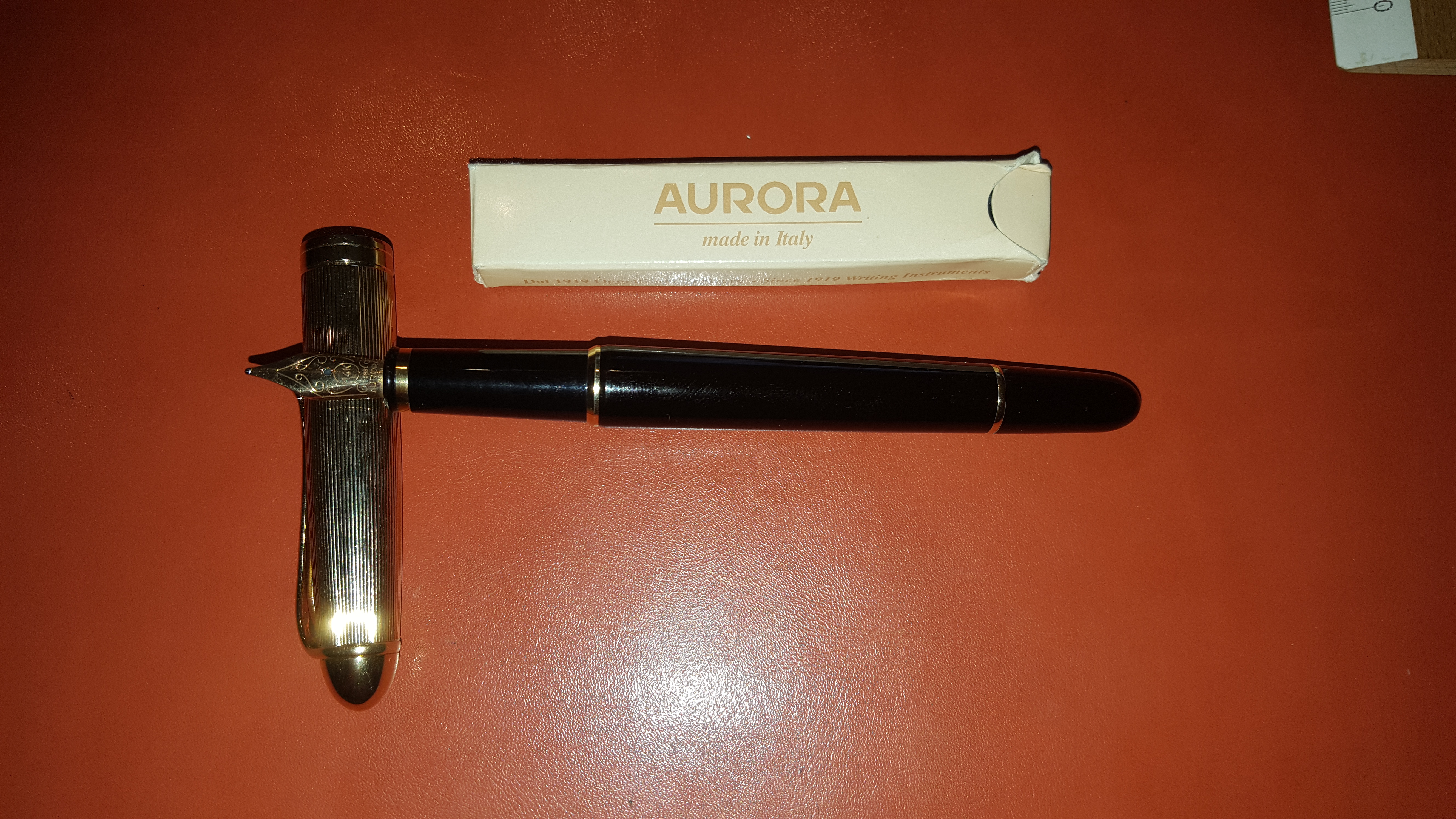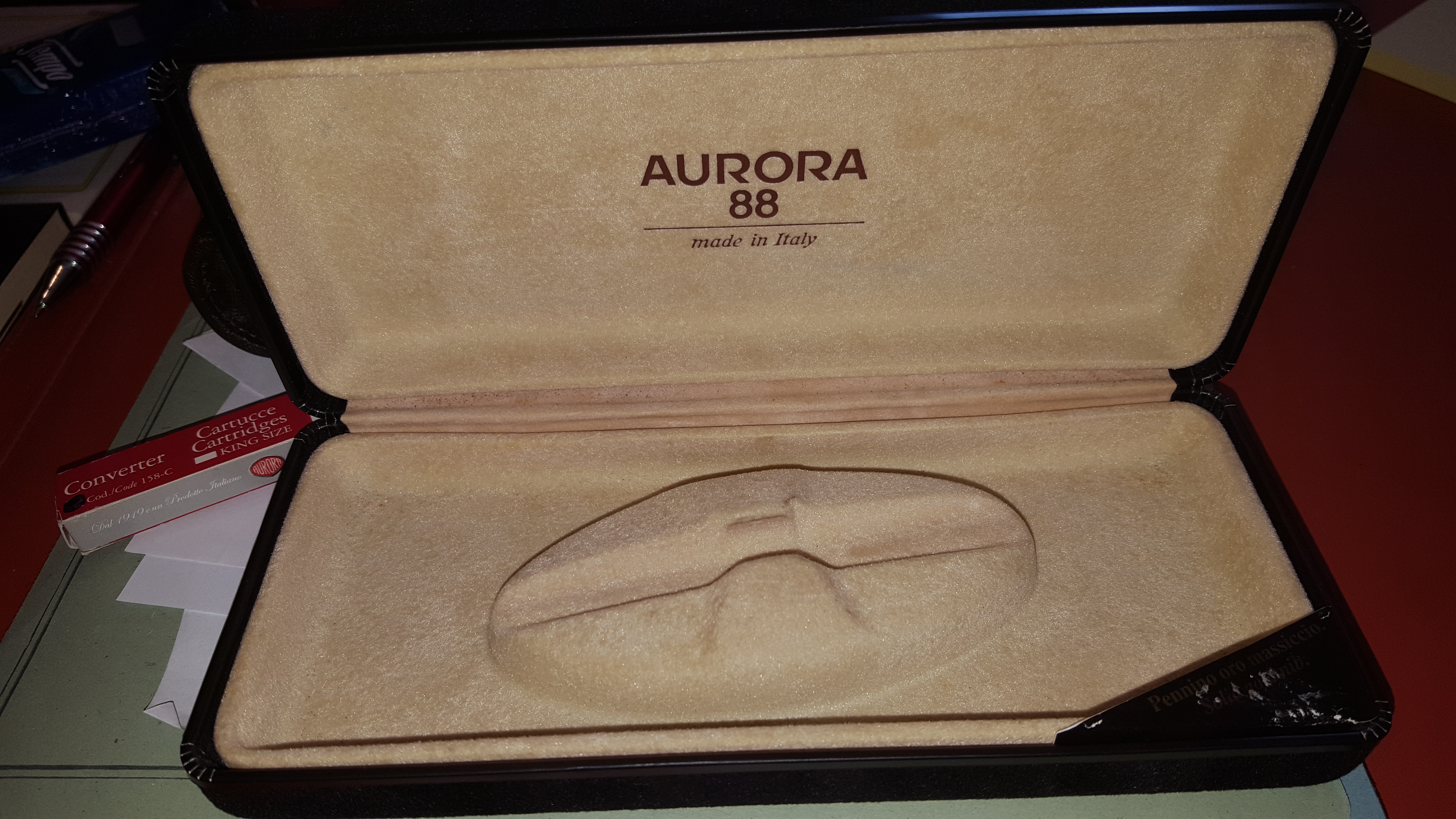 Dopo aver visionato varie penne, alla fine ho acquistato una Aurora 88 con cappuccio dorato e pennino in oro massiccio; la "piccolina" si trovava dimenticata in fondo ad uno scaffale, tra vecchie scatole e cartoni.
