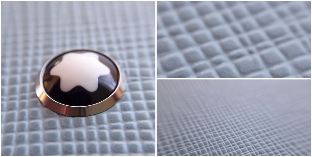 La pelle con lavorazione “saffiano” (un trattamento della pelle di vitello che conferisce alla particolare tramatura irregolare una ceratura superficiale che rende la pelle stessa molto resistente agli agenti esterni, dalle macchie alle abrasioni) è incollata alla parte cartacea (in modo da non venire più riciclata, presumo, una specie di antifurto postumo…).