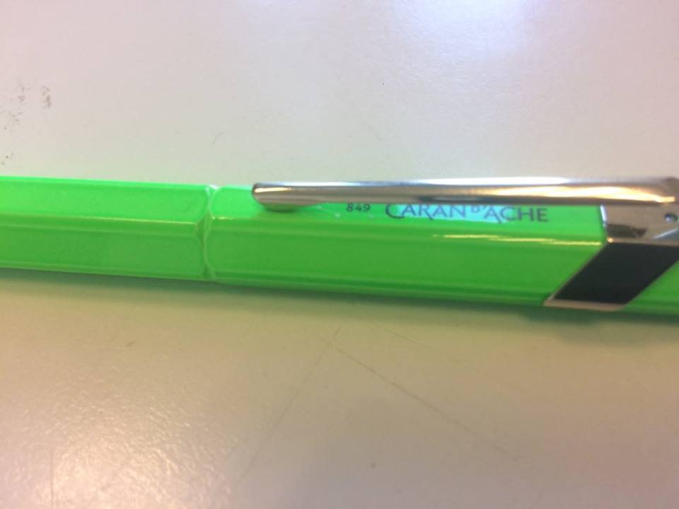 Ho provato per qualche minuto la Caran d'Ache 849 di un collega, colore verde fluo, con pennino F .