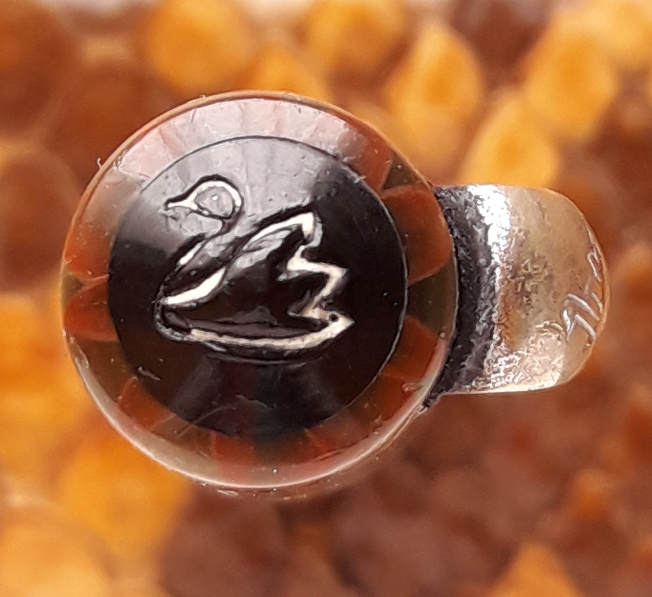 La prima cosa che balza all’occhio in una penna come questa, di medio/piccole dimensioni, è senza dubbio la particolare celluloide animalier “a pelle di serpente”, di un grigio cangiante, perlescente, con linee di demarcazione delle “squame” di colore rosso… Osservata in trasparenza (sul cappuccio), oltre alla struttura elicoidale tipica della celluloide avvolta in fogli (e non tornita da barra piena), si palesano deliziose reminiscenze pittoriche… Il materiale pare vivo, le spire mobili, e il serpente pronto a fare di noi un sol boccone…