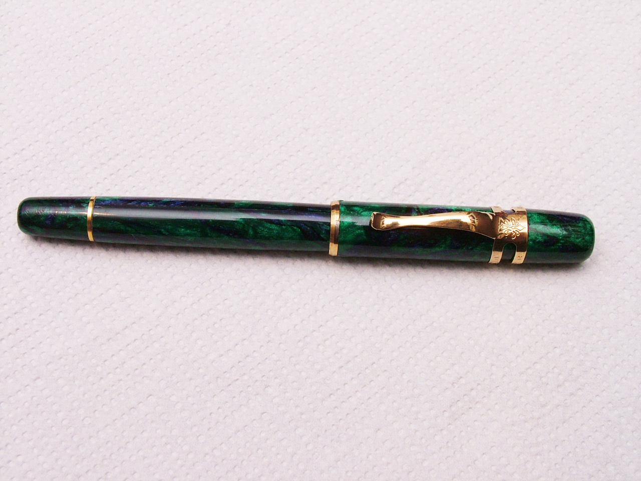 Celluloide di un bel colore verde elettrico, con chiazze blu e nere, pennino bicolore, non in oro, forse è stato sostituito, sarà per questo va che è una meraviglia.
