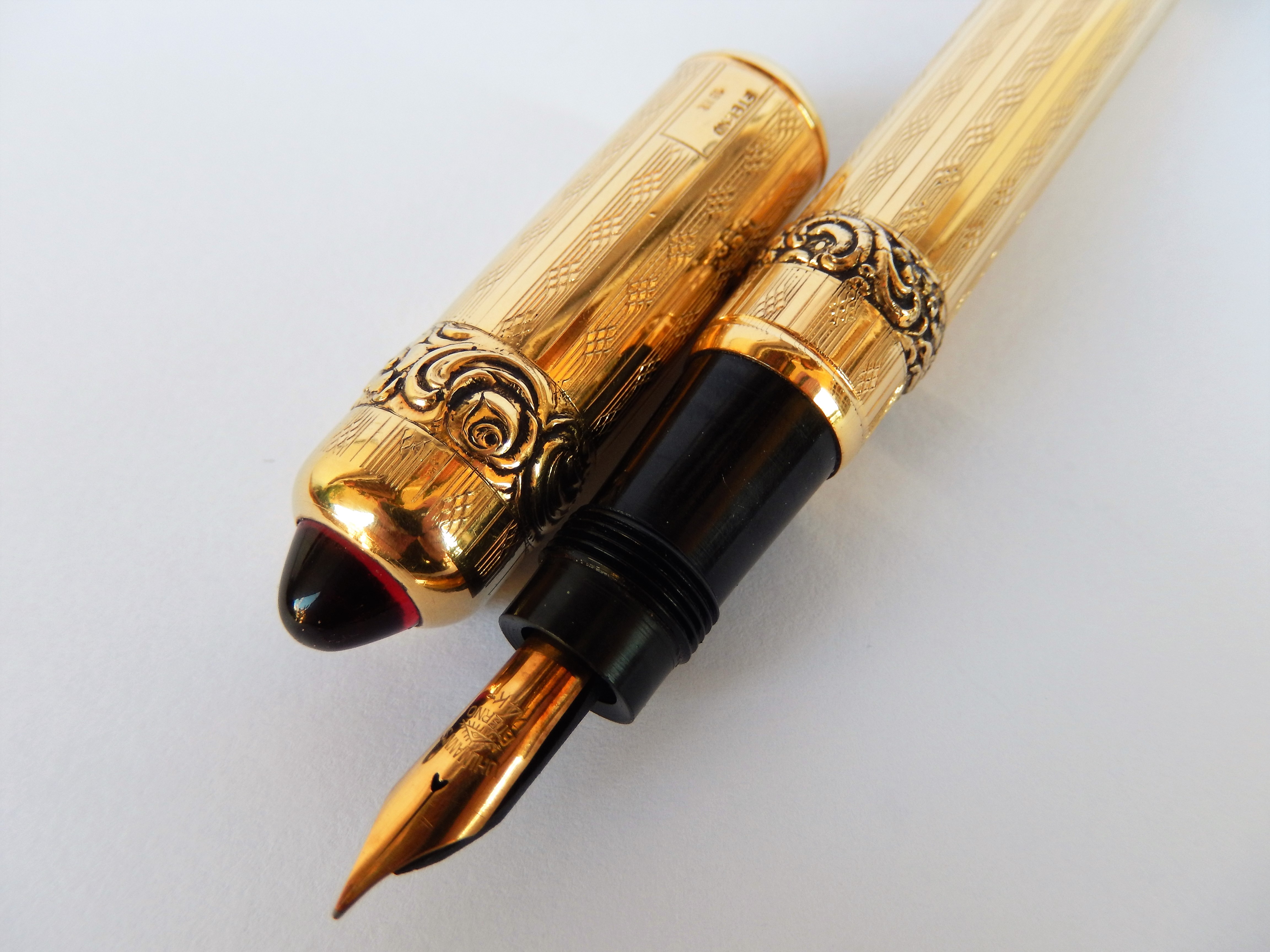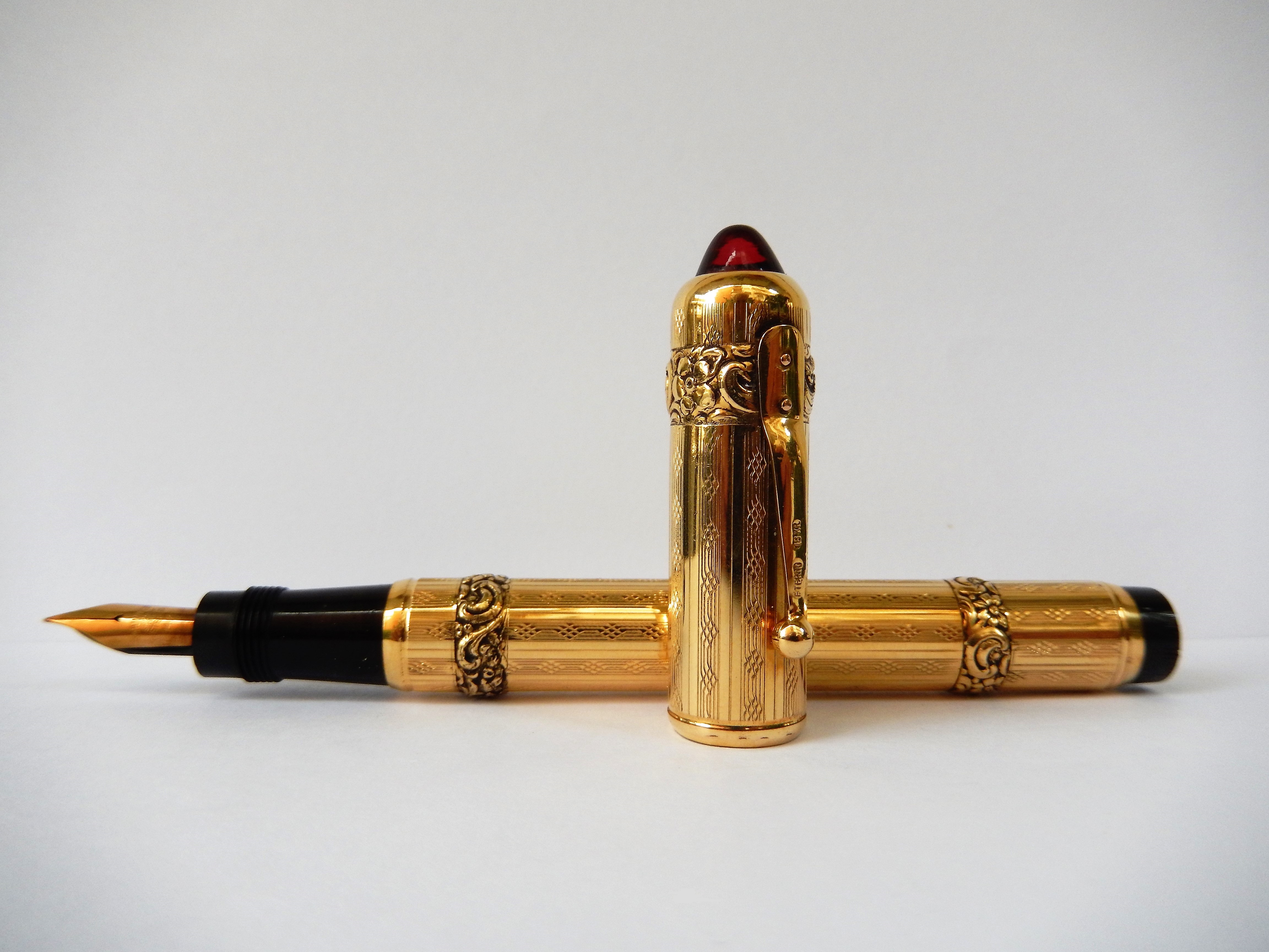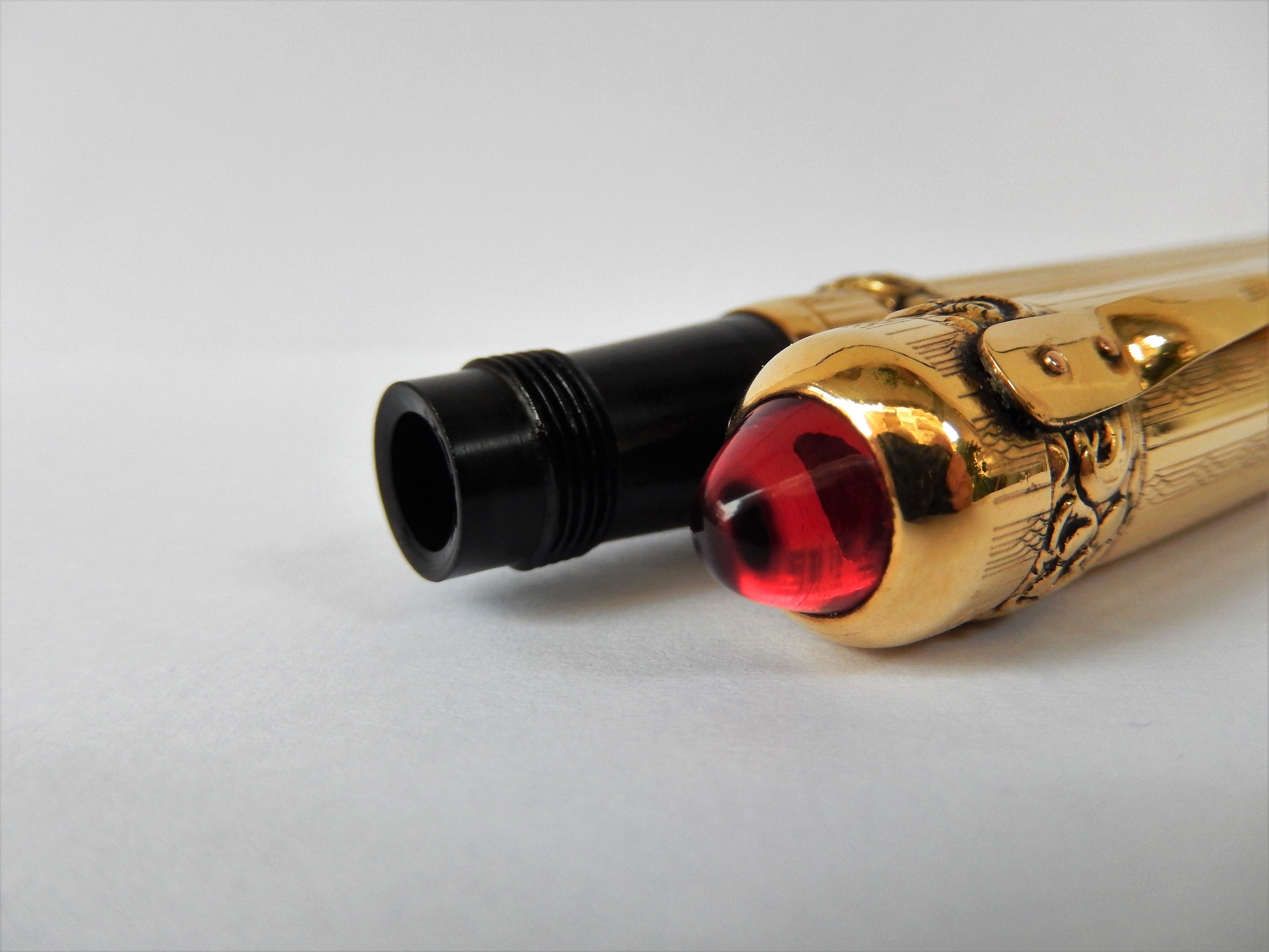 Situata a pochi chilometri da Norimberga Fürth all'epoca ospitava la più numerosa comunità ebraica della Germania tanto da essere conosciuta come " la Gerusalemme bavarese ". Emil, figlio di Sigmund ed Emma, ultimo di otto fratelli, quattro femmine e quattro maschi, trascorse in Baviera la sua giovinezza per poi sposare, quasi trentenne, Magdalena Ziller, di circa dieci anni più giovane di lui e dalla quale nel 1901 ebbe quello che risulterebbe essere stato il loro unico figlio, Bertram. Fu in quegli anni che Emil spostò la sede dei propri interessi e della propria vita a Milano dove, come dichiarato in una successiva fattura (presente sul wiki) nel 1902 fu costituita la ditta Emil Uhlmann inizialmente attiva nel settore dei rivestimenti in oro di oggetti vari. E' nel 1912, con il deposito dei marchi Eterno e Famos che si può datare la presenza nello specifico settore della stilografica consentendo così di riconoscere con ogni probabilità alla iniziativa di Emil Uhlmann il primato di primo produttore di penne in Italia. Il marchio si distinse ben presto per qualità e ricchezza dei rivestimenti, fattori che ne consentirono un rapido successo anche se ( mutano i tempi ma i problemi sono sempre gli stessi ) già allora qualche volta si faticava ad essere pagati, come risulta da questa missiva, reperita in rete, a firma proprio di Emil Uhlmann. Emil muore a Milano il 13 gennaio 1933, all'età di 62 anni, e con ogni probabilità questo evento coincide grosso modo con lo spostamento della sede dell'azienda da via Moscova 14 a via Piave 7 e sopratutto con la trasformazione della ragione sociale in " Industrie Reclame L. Uhlmann ". Dato che ne il figlio ne la moglie ne i diversi nipoti presentano nomi con l'iniziale L non è automatico individuare il signor o la signora L. Uhlmann, a meno di non pensare ad un diminutivo in Lena del nome della moglie Magdalena, allora cinquantenne e che per me resta la maggiore indiziata. Al riguardo spero che qualcuno possa fornire ulteriori elementi utili alla identificazione. Ma torniamo all'esemplare in presentazione. La penna è di dimensioni generose, non facili da riscontrare nelle safety ricoperte : chiusa misura 13,6 cm e con il cappuccio calzato arriva a 15,1, con un diametro massimo di 1,2. Si presenta ancora in gran forma, laminata con alternanze di fasce lisce ed altre con lavorazione guillochè, decorata da tre bande a sbalzo con motivi floreali di chiara influenza liberty e da un luminoso cabochon di tormalina rossa che ne sovrasta il cappuccio. Il marchio Eterno 18 Kr lo troviamo inserito sia in un riquadro alla base del berretto, sia sulla parte finale del fusto, sia sulla clip , ben fissa e del tipo a rivetti con pallina finale.