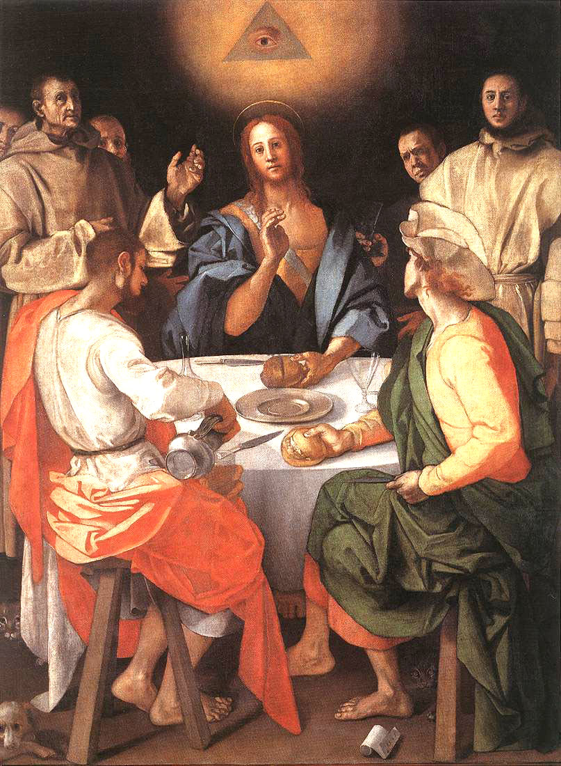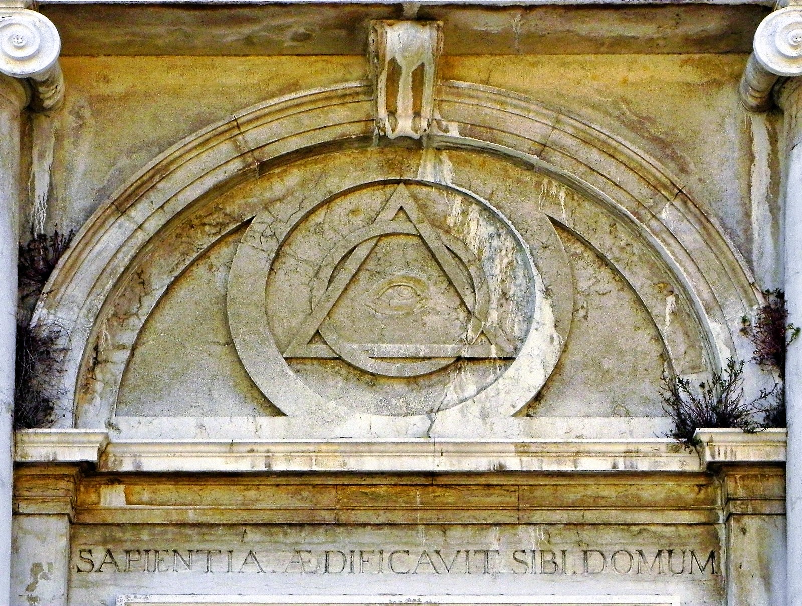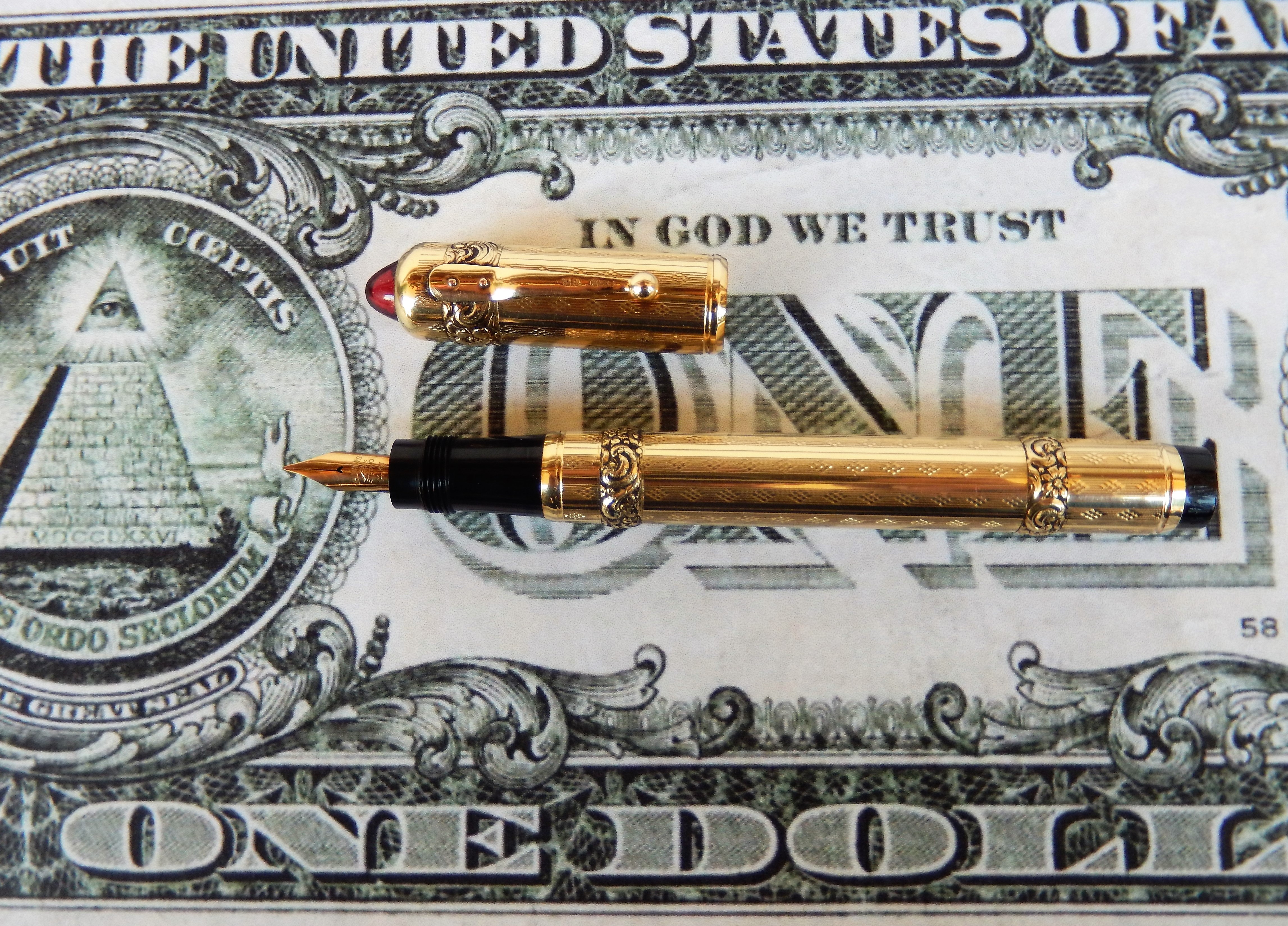 Il simbolo appare nella iconografia cristiana, è l'occhio di Dio che tutto vede, l'occhio della Provvidenza inserito nel triangolo ove si manifesta la trinità nell'unità. Qui sotto lo vediamo alle spalle del Signore nella Cena in Emmaus di Iacopo da Pontorno dipinta nel 1525 ed oggi agli Uffizi di Firenze ma si trova affrescato sin dal rinascimento in numerose cappelle e chiese cattoliche. Significativa la presenza del simbolo anche nella iconografia massonica, dove l'occhio è quello del Grande Architetto, la conoscenza che irradia raggi di luce. I Veneziani possono incontrare il simbolo vicino alla stazione di Santa Lucia, sulla facciata della chiesa di Santa Maddalena - sapientia edificavit sibi domum - progettata dal Temanza, lì sepolto e sulla cui lastra tombale sono riprodotti squadra, righello e compasso. Concludendo questo parziale excursus sul simbolo vale la pena di segnalarne la presenza anche nella banconota da un dollaro americano, dove molti anche qui hanno voluto individuare riferimenti massonici. Nella banconota l'occhio è inserito nella cuspide di una piramide egizia costituita da tredici gradoni - quanti erano al tempo gli stati - sovrastati dall'occhio della Provvidenza che avrebbe così vigilato sulla prosperità e crescita della nazione. Concludendo - e mi scuso se ho troppo divagato - una penna databile intorno al 1925 giunta a noi in condizioni veramente eccellenti e che nella fattura e nell'imponenza manifesta una ricercatezza da " status symbol ", testimone della pregevolezza della produzione italiana dell'epoca.