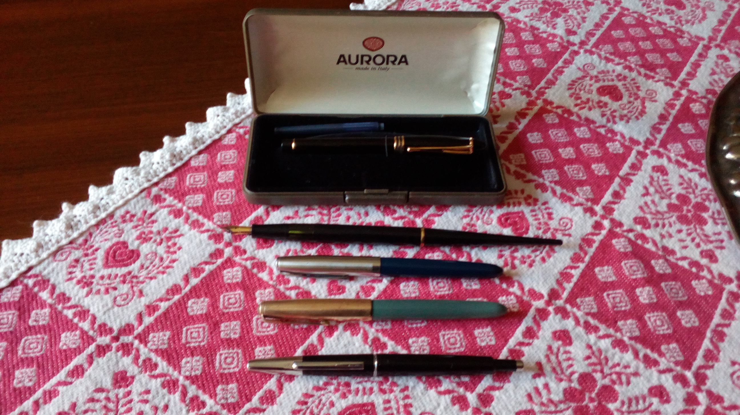 Potrebbero essere i soliti ritrovamenti pre natalizi, con un qualcosa di diverso… Il solito stiloforo Omas Extra con pennino dorato F marchiato Omas in ottime condizioni; Aurora ypsilon nera pennino M con scatola, nuova mai inchiostrata; Parker 51 (peccato il fusto sia mancante di una parte filettata), scrive che è una bellezza, ha un tratto medio abbondante e una scorrevolezza che non avevo fino adesso riscontrato su altre penne (forse su alcune MontBlanc); Parker 21 in ottime condizioni, pennino in acciaio; in ultimo una Pilot Namiki Capless (anno di produzione 1964), funzionante in ottime condizioni (forse la penna più interessante).