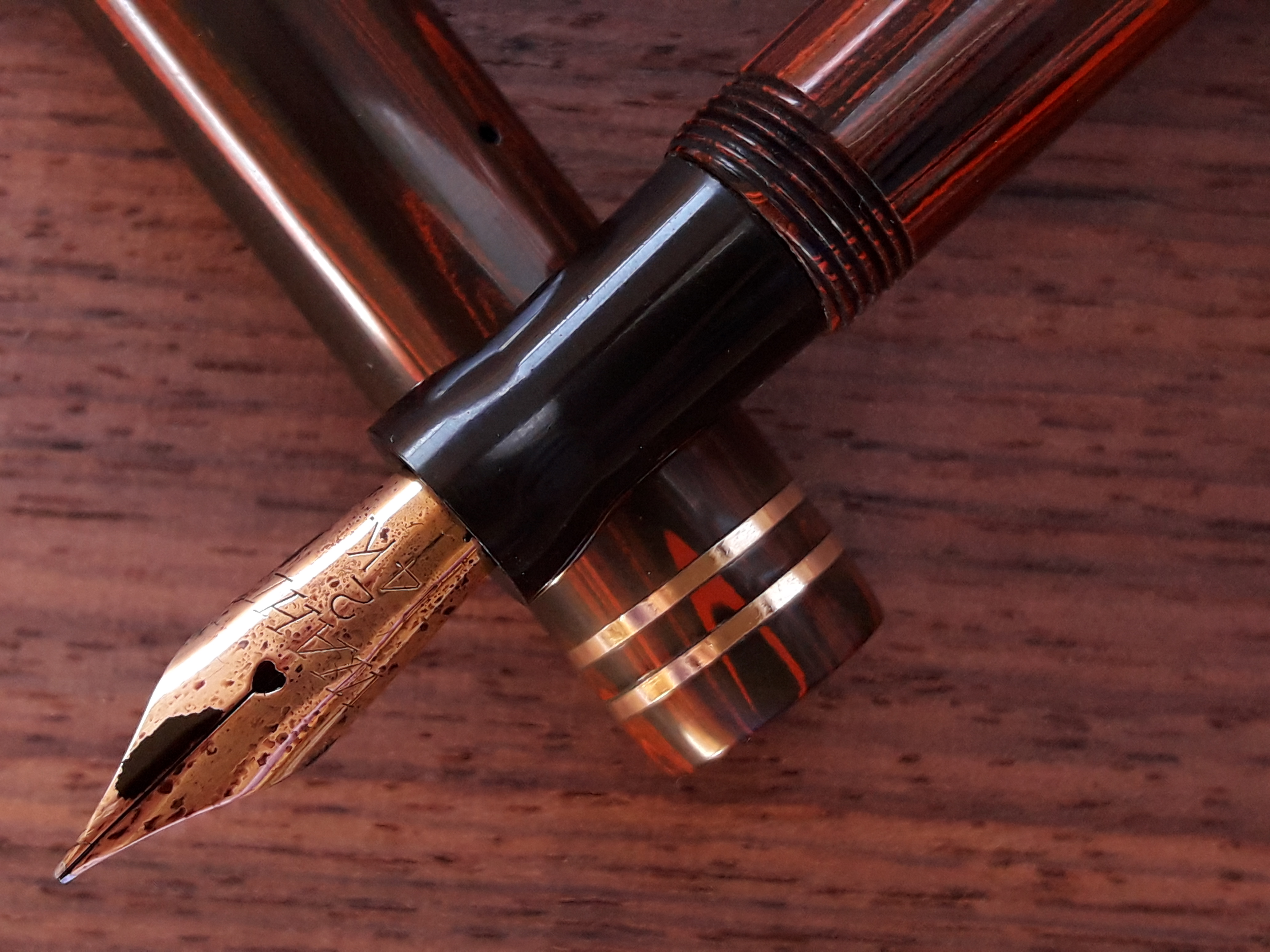 La sezione in ebanite nera con caratteristica terminazione a bicchierino porta inseriti a frizione l’alimentatore scalettato in ebanite (chiamato dalla casa “comb feed”, alimentatore “a pettine”) ed il pennino in oro 14 carati con ampio foro a cuore.